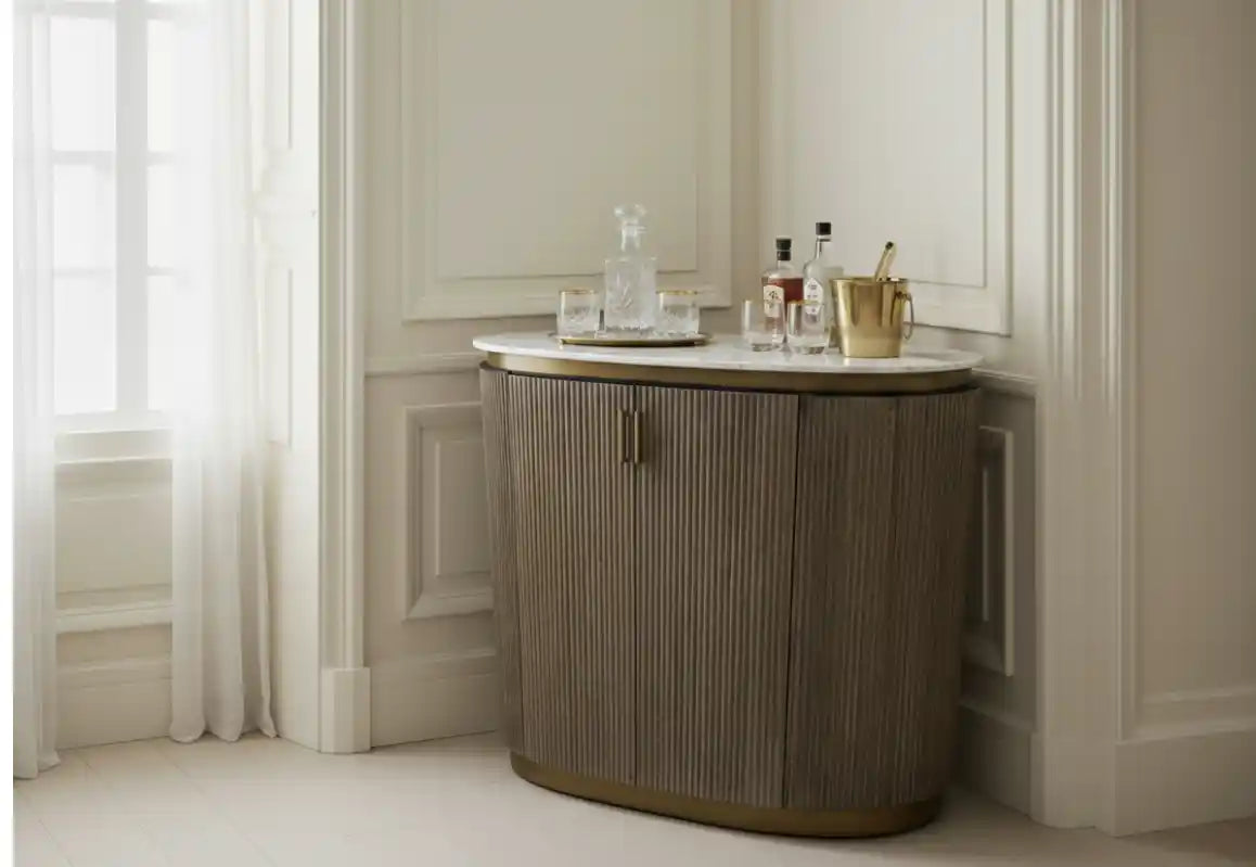 The Aston Oval Bar is an elegant piece of furniture, designed with a sophisticated blend of materials and textures. It features a rich brown wood finish with a ribbed surface that adds depth and character to its oval-shaped body. The top of the bar is adorned with a luxurious marble surface, providing a sleek and polished look that contrasts beautifully with the warm wood tones. The bar is accentuated with antique brass detailing, including handles and a base trim, which add a touch of vintage charm and sophistication. This bar is not only functional but also serves as a stylish statement piece in any room.
