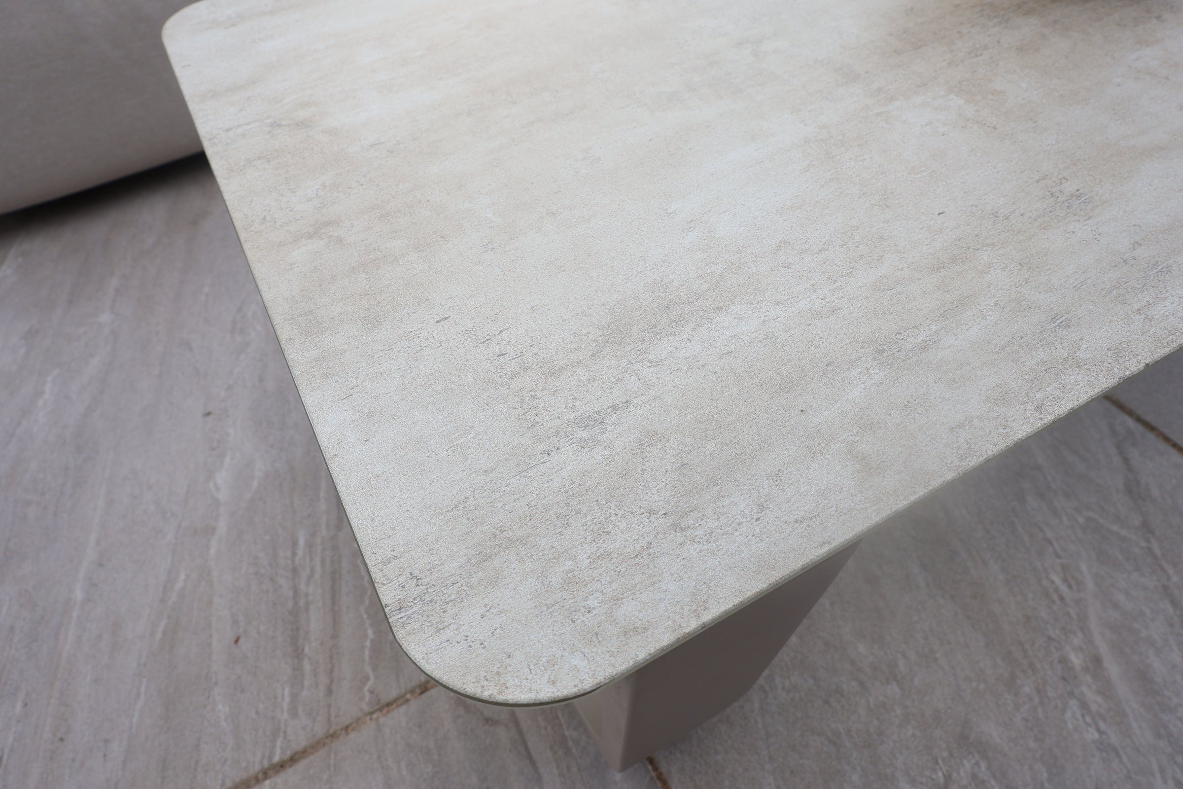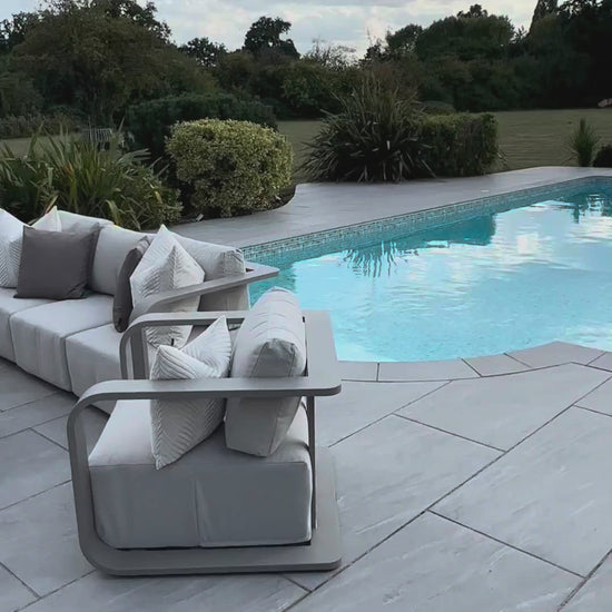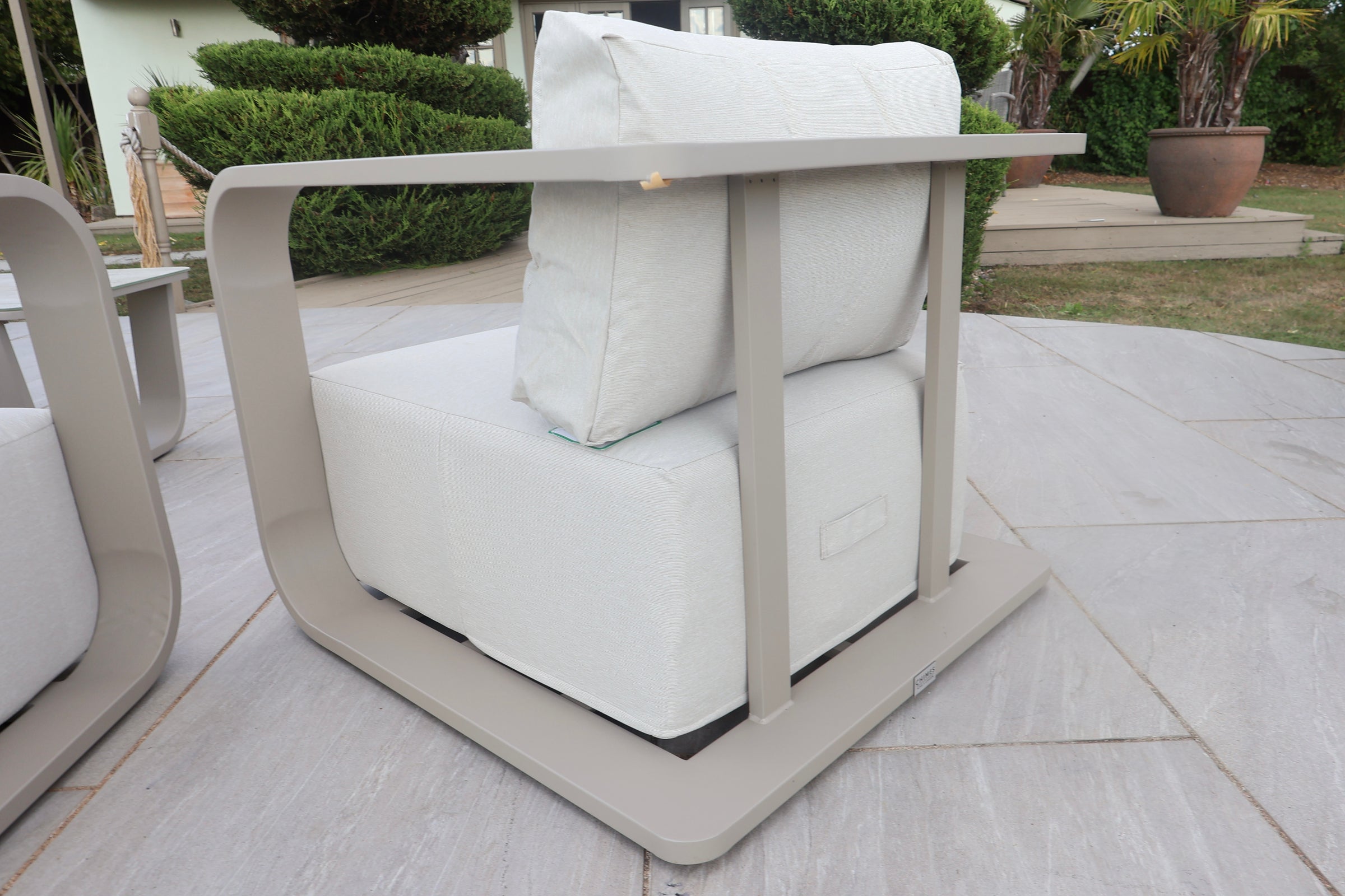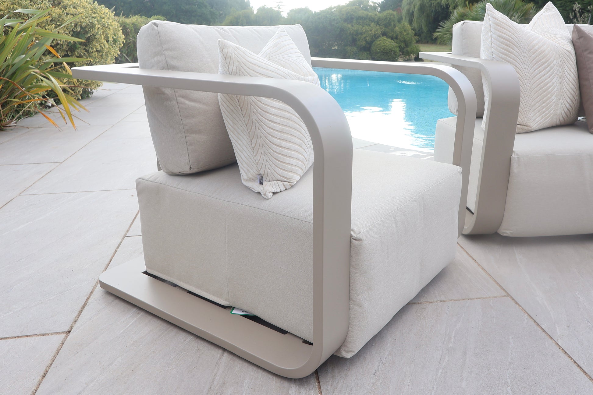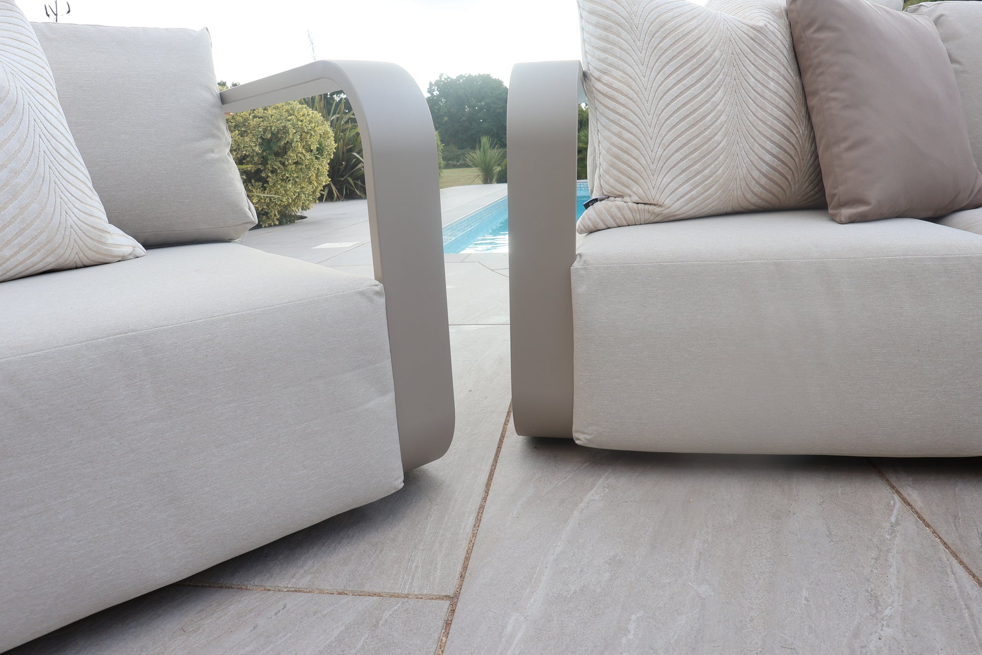 Crafted from durable powder-coated aluminium, this set is built to withstand the elements while maintaining its pristine appearance. The deep cushions are made from a luxury all weather resistant fabric in a soft cream providing unparalleled comfort, inviting you to relax and unwind for hours.