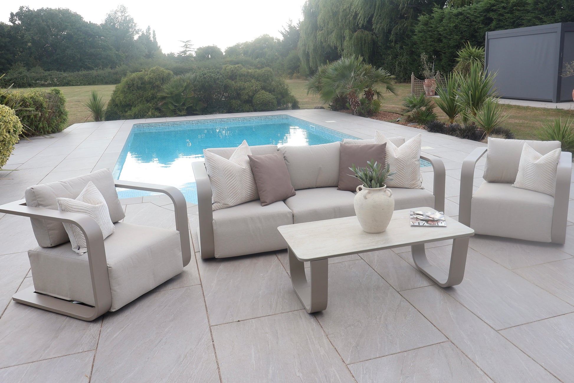 Chimes - Capri 3 Seat Aluminium Sofa Set With Coffee Table is a stunning cream patio set featuring a sleek, modern design that effortlessly complements any garden/patio or balcony decor.