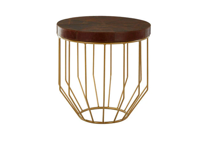 In stock & ready for deliveryThis Boutique-style side table is topped with segments of supple leather. The leather top has a tan colour that complements the warm metallic coloured legs. Its wireframe-style legs are crafted from tough iron. Part of the luxurious Chelsea Townhouse collection.