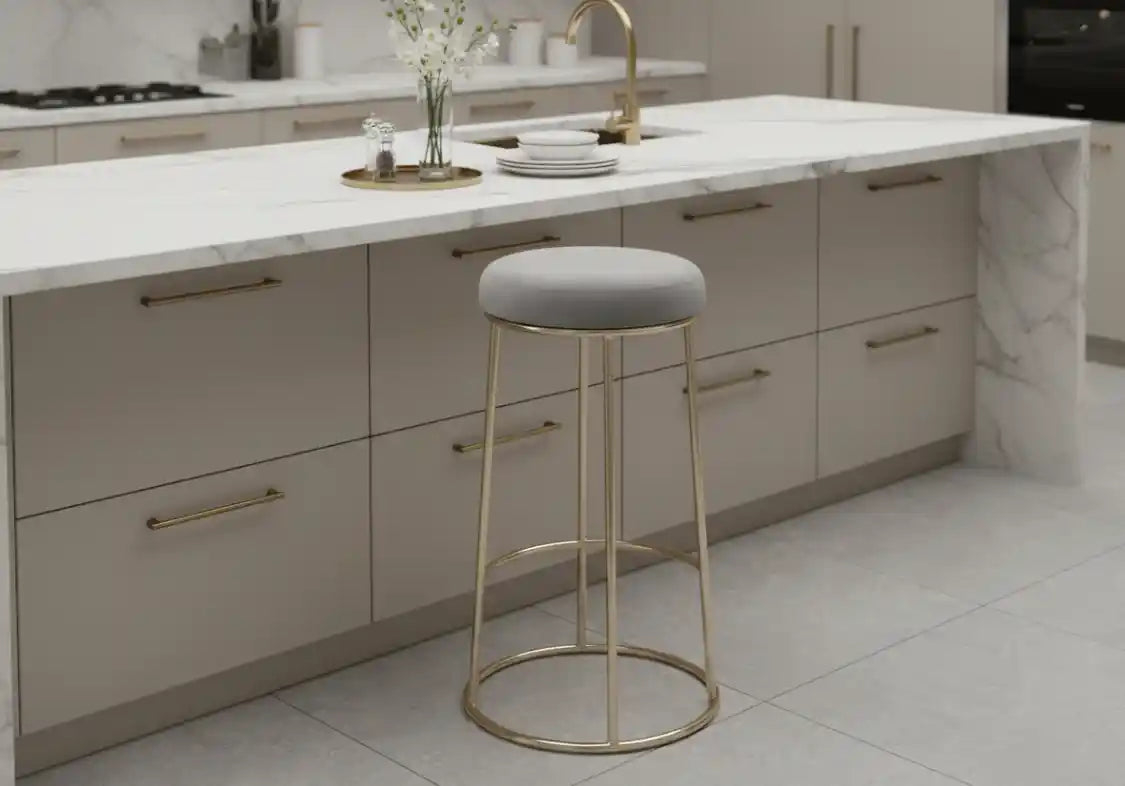 Designed for counter heights, this stool has a padded seat upholstered in grey velvet. Sleek and minimal, the gold finish metal frame with footrest enhances the glam appeal of the design.