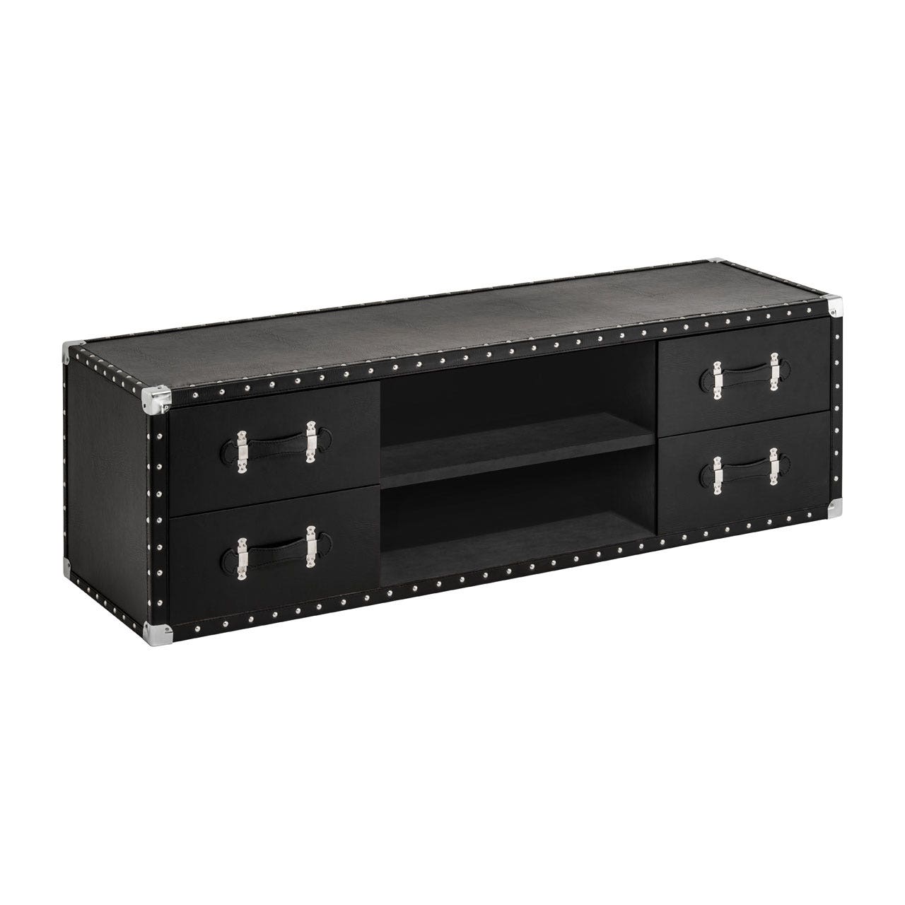 Metallic studs trim the Bloomsbury media unit, their reflective silver colour combining with the black faux leather for a monochrome finish. A central shelf section provides unobstructed space for media devices. Its four storage drawers each have a faux leather strap handle, held securely by silver metal clasps. Display a television on its wide top surface.