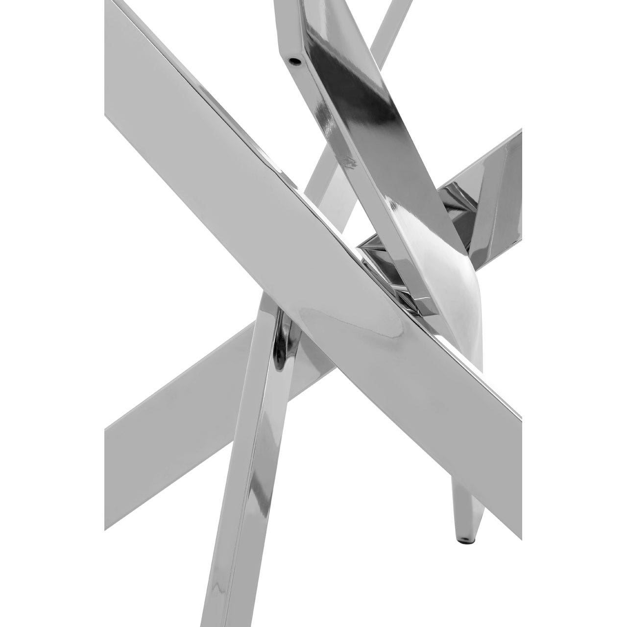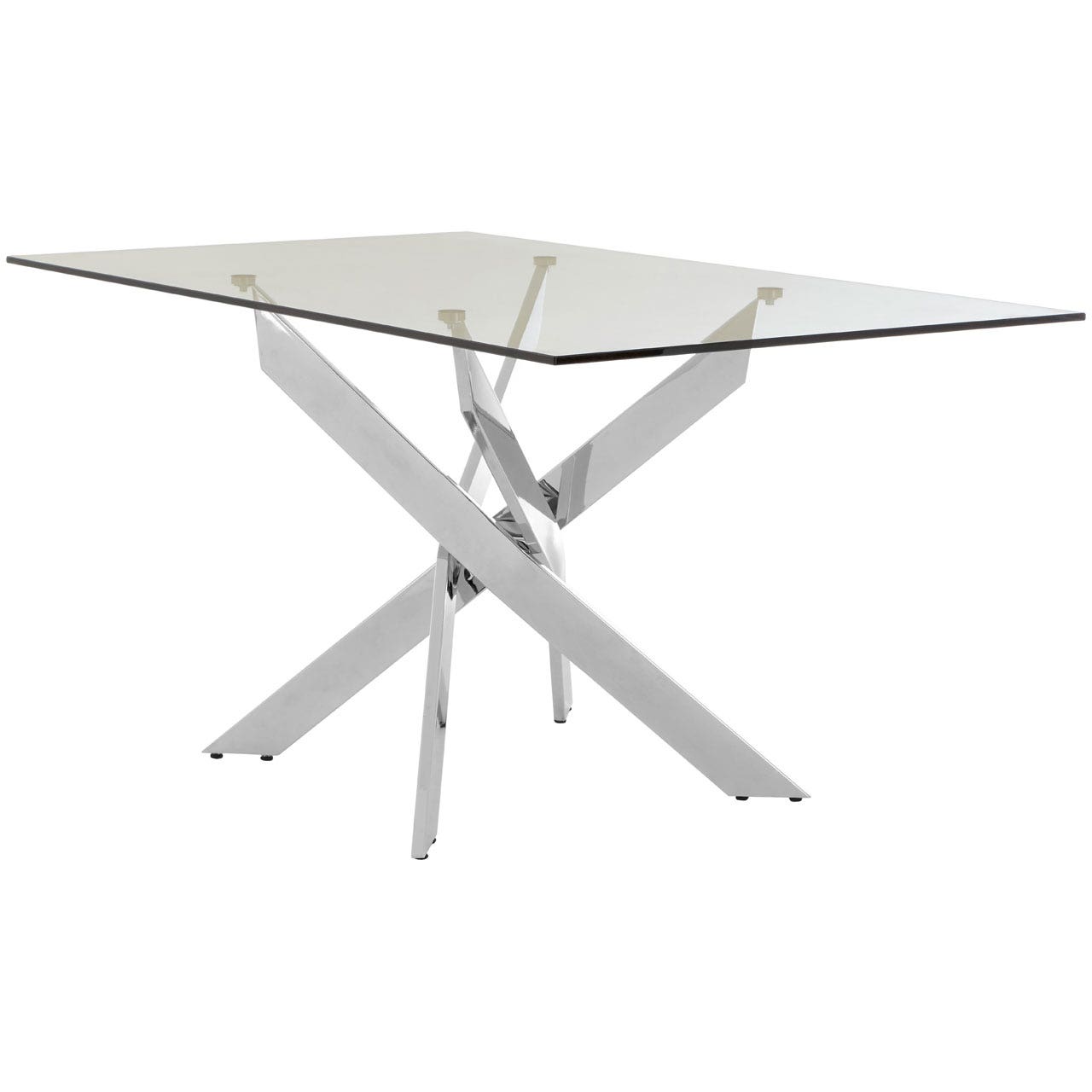 This dining table gets its distinctive look from the angled arrangement of metal which form its legs. Four pieces of metal gather around a square fulcrum, a slight kink gently redirecting their straight lines. Their chrome finish gives this boutique hotel style table a reflective look, coordinating with the thick rectangular tempered glass tabletop.