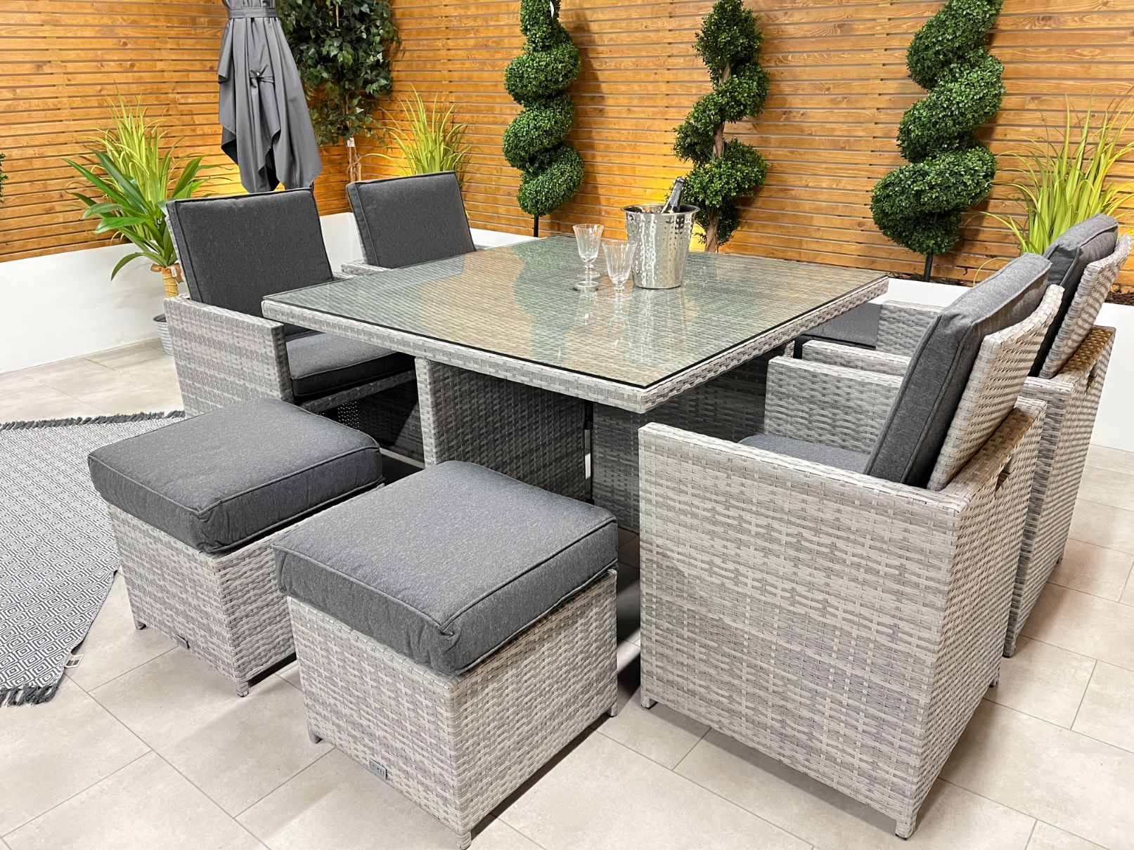 This set comes with 4 Cube Seats, 4 Foot Stools, a square dining table and an 8mm tempered safety glass table top. The stone grey weave with the darker cushions would be the perfect fit for any garden. The cube set also comes with seat and back cushions through out and also 4 stool cushions which can be used for additional seating or a foot rests.