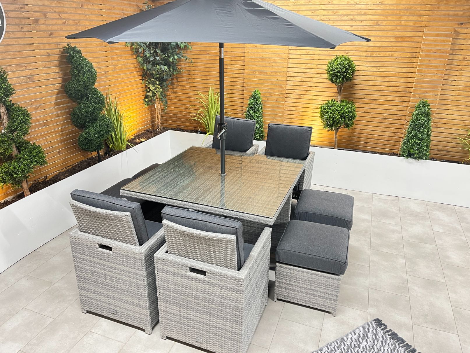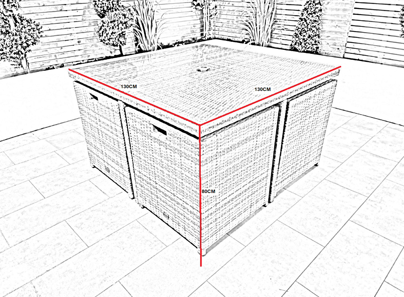 The table also comes with a parasol hole and is ideally suited to a 2.4 meter or 2.7 meter round parasol. You will not need a base as our 4 seat cube comes with a parasol holder within the table.