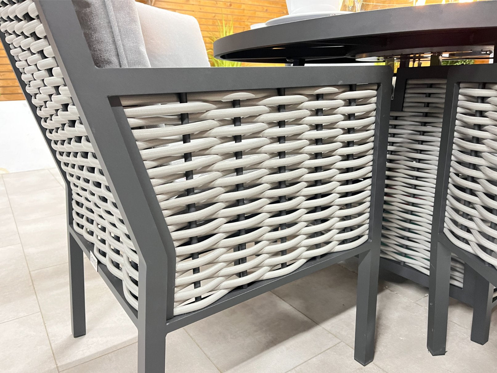The Chimes - Monaco Aluminium 6 Seat Round Dining Set - 1.5 Meter Round Table With Firepit - Rope Weave is our premium luxury aluminium range that is not only low maintenance but has extra thick cushions which brings the ultimate comfort experience to your garden.