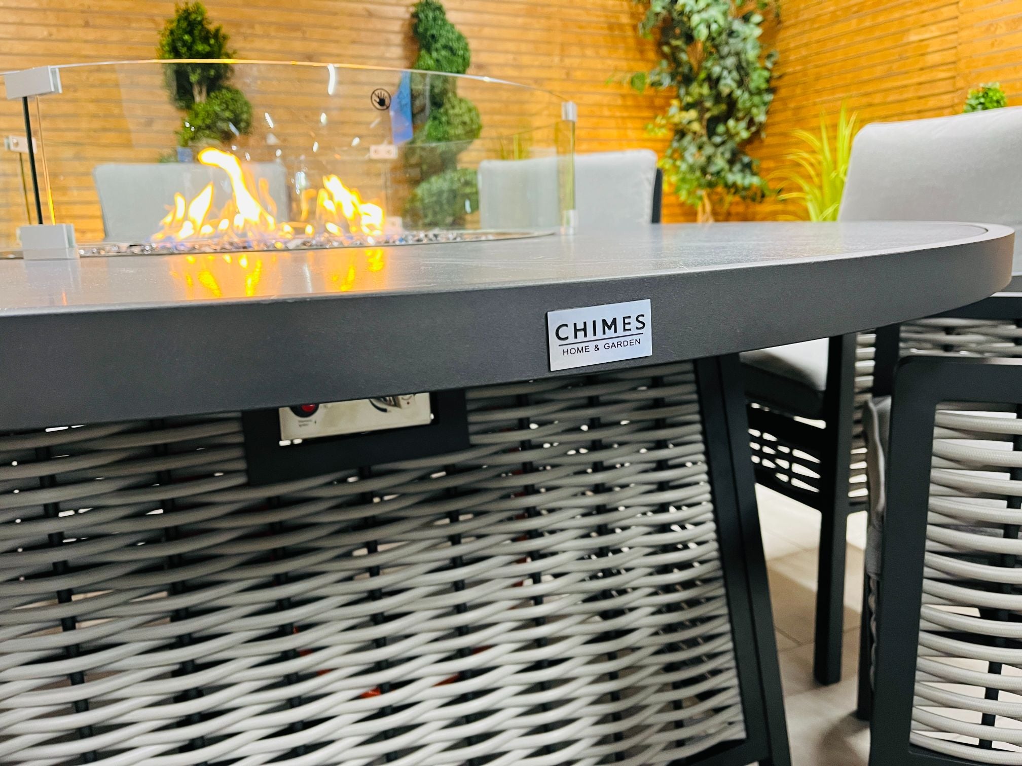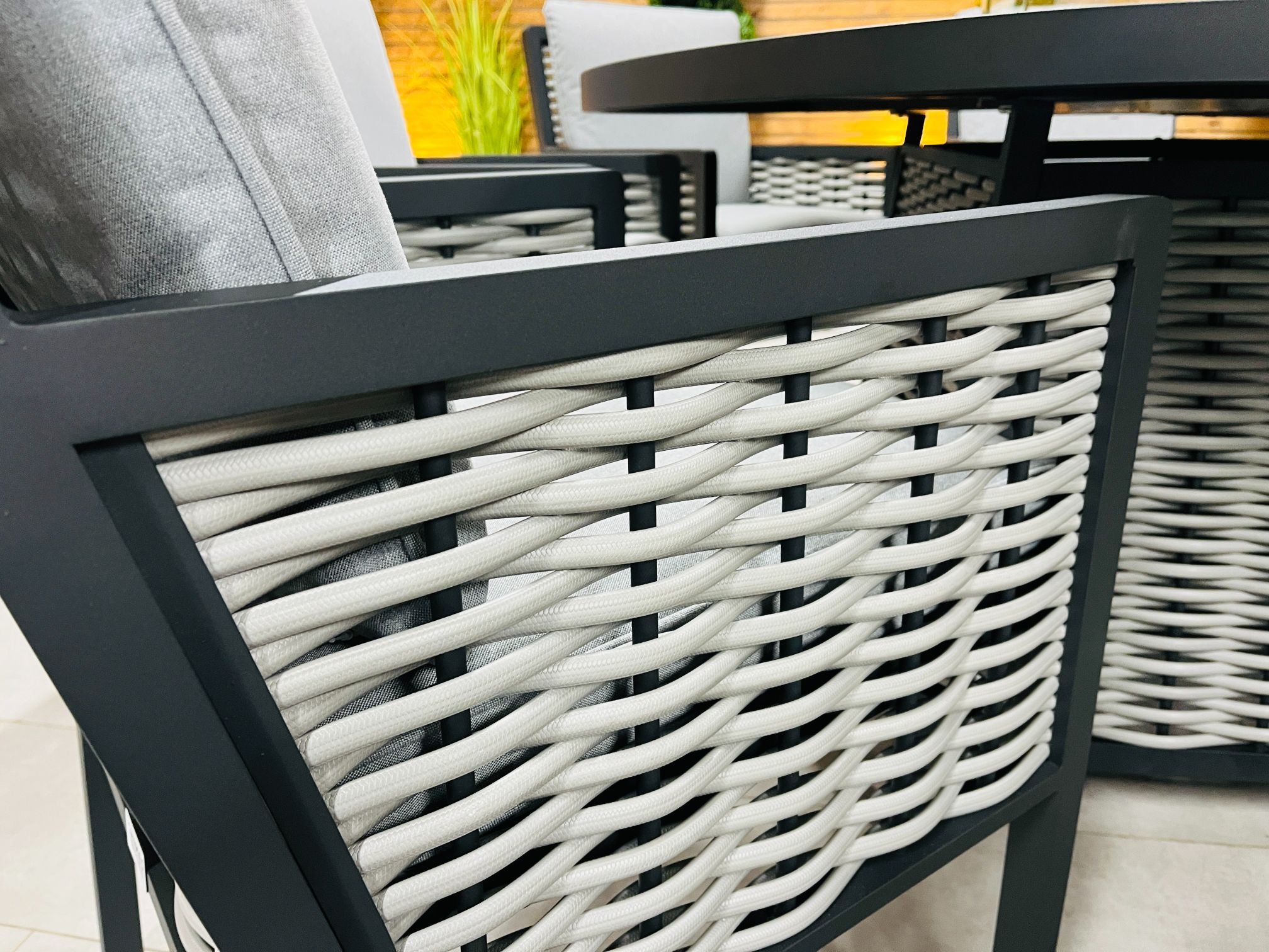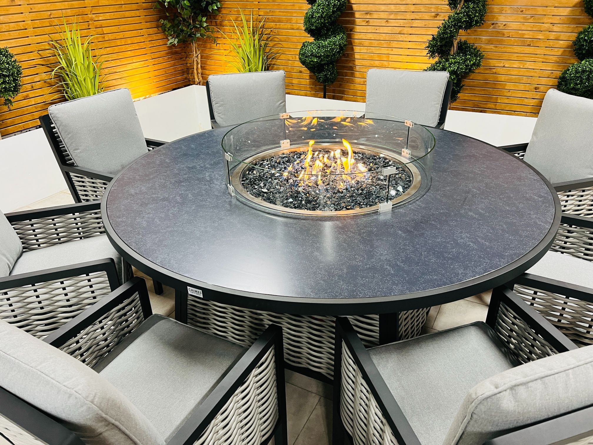 The Chimes - Monaco Aluminium 8 Seat Round Dining Set - 1.8 Meter Round Table With Firepit - Rope Weave is our premium luxury aluminium range that is not only low maintenance but has extra thick cushions which brings the ultimate comfort experience to your garden.
