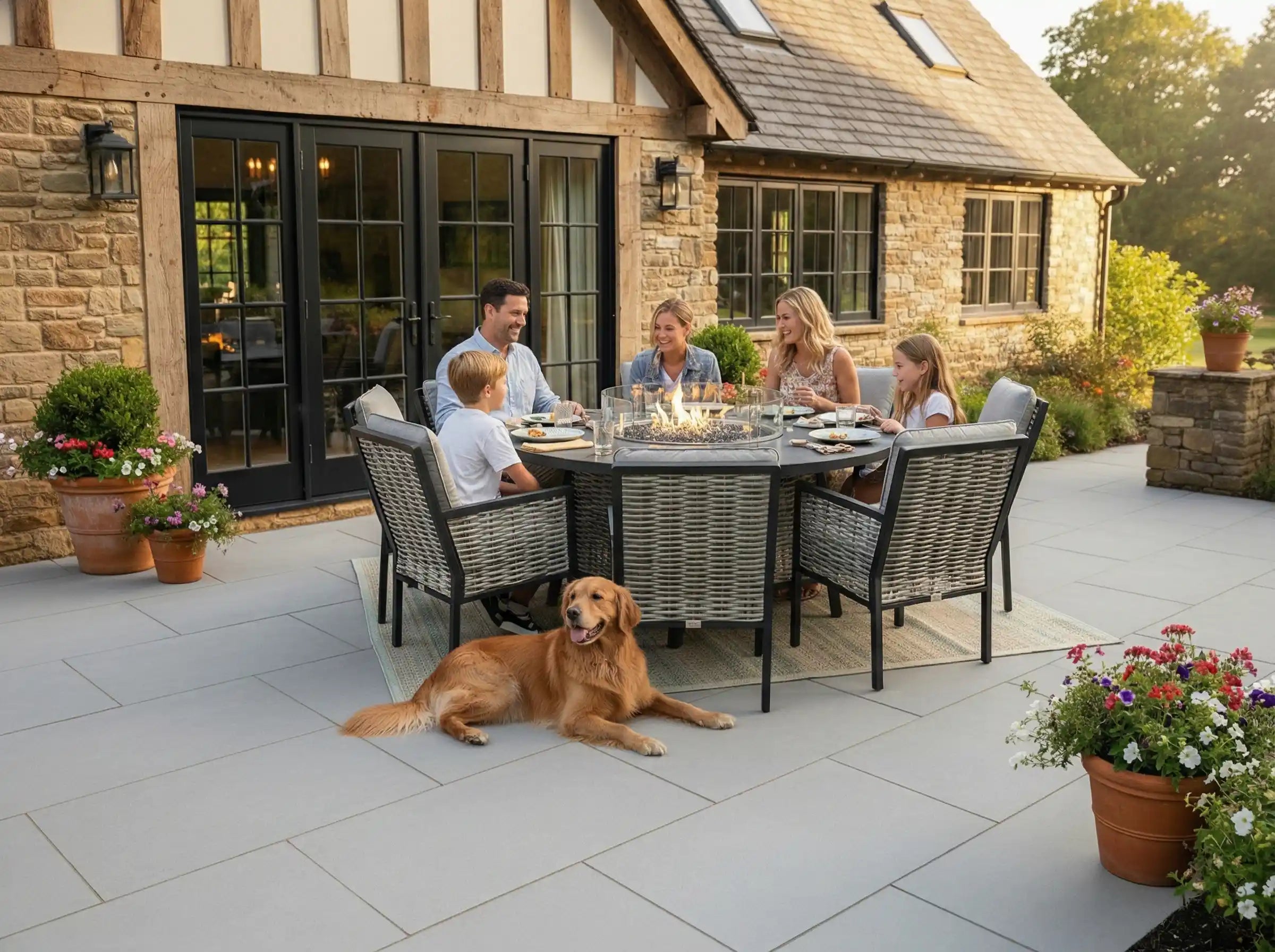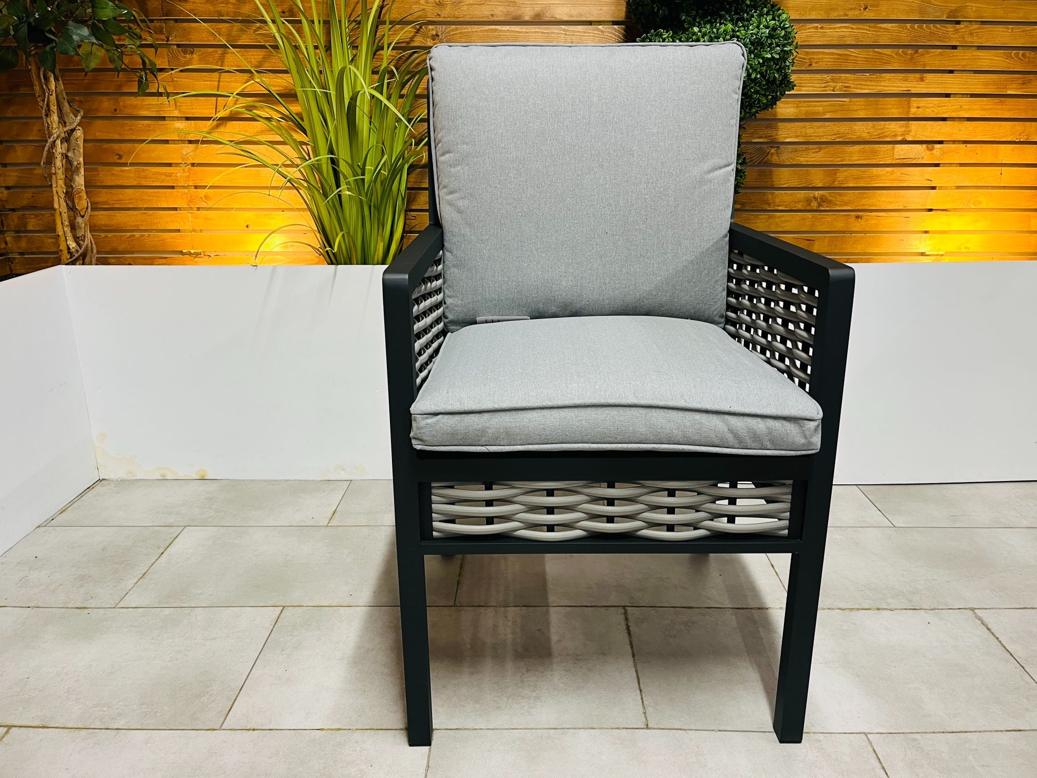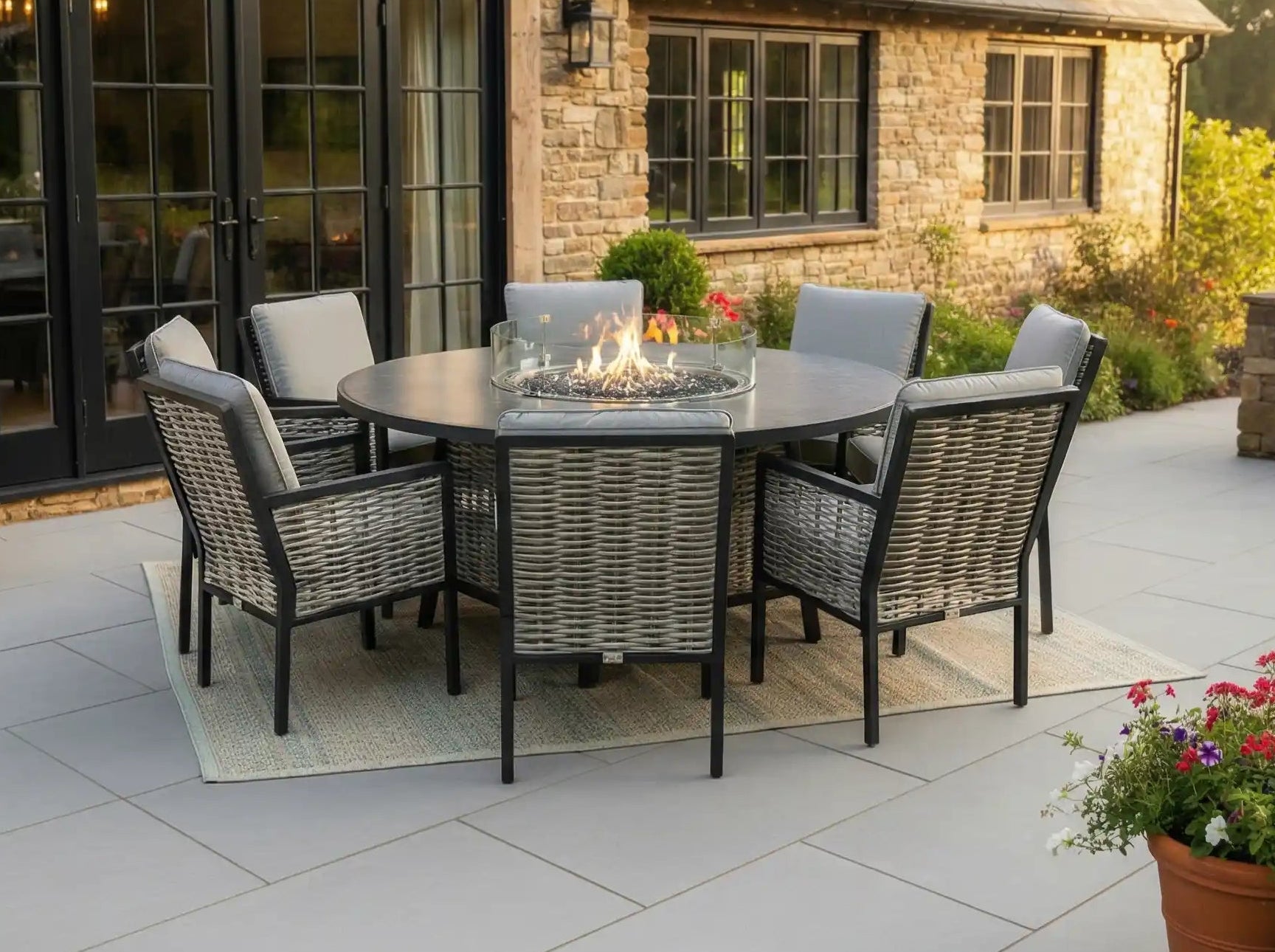 The Chimes - Monaco Aluminium 8 Seat Round Dining Set - 1.8 Meter Round Table With Firepit - Rope Weave is our premium luxury aluminium range that is not only low maintenance but has extra thick cushions which brings the ultimate comfort experience to your garden.