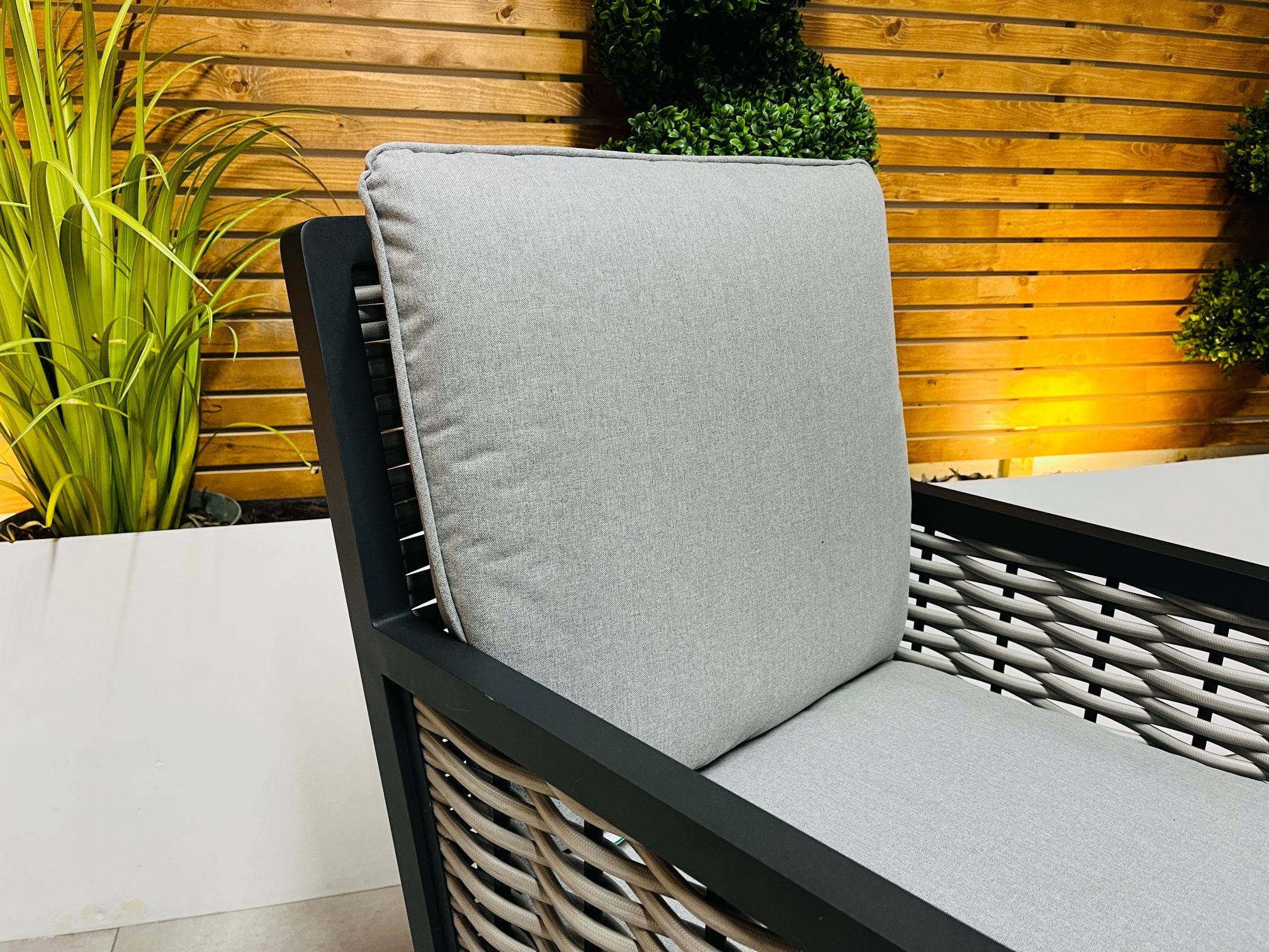 The spaciously wide sofa and extra deep seating will allow yourself and your guest to relax in complete comfort. The cushions are shower resistant but should not be left outside in adverse weather conditions. The aluminium frame work has a high tolerance to the UK weather and comes powder coated to not only give a premium finish but provides an all year round weather protective coat. Being aluminium you do not have to worry about corrosion and rust on your patio floor.