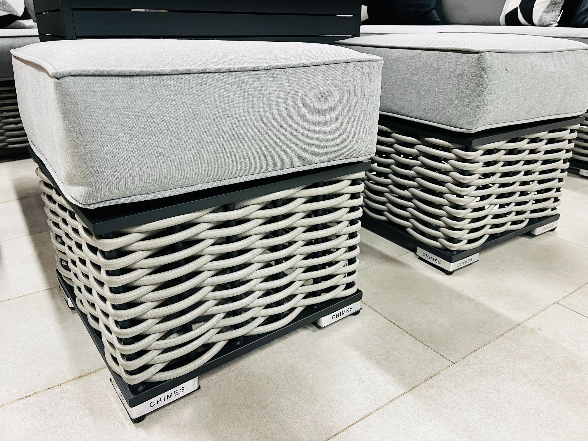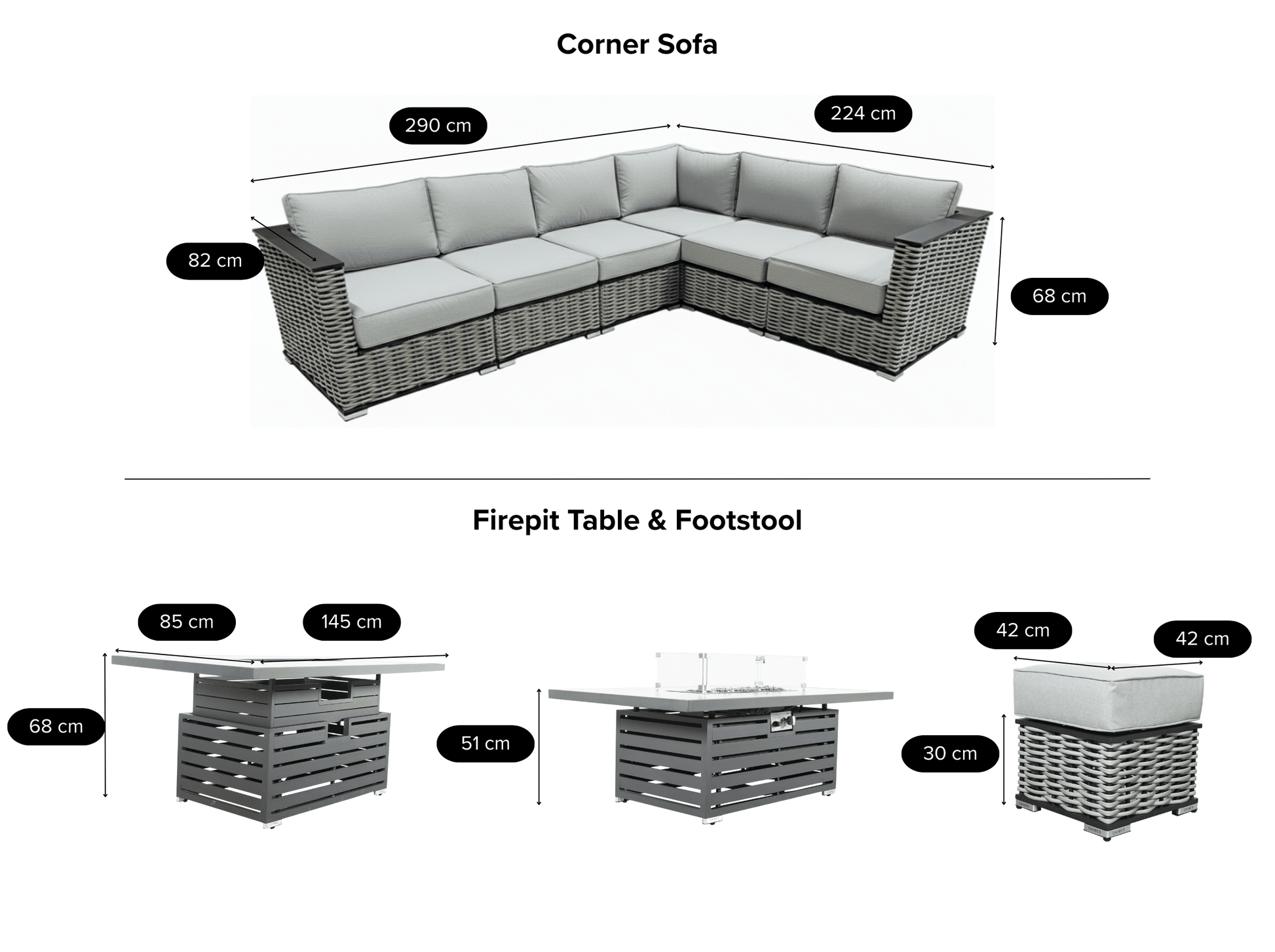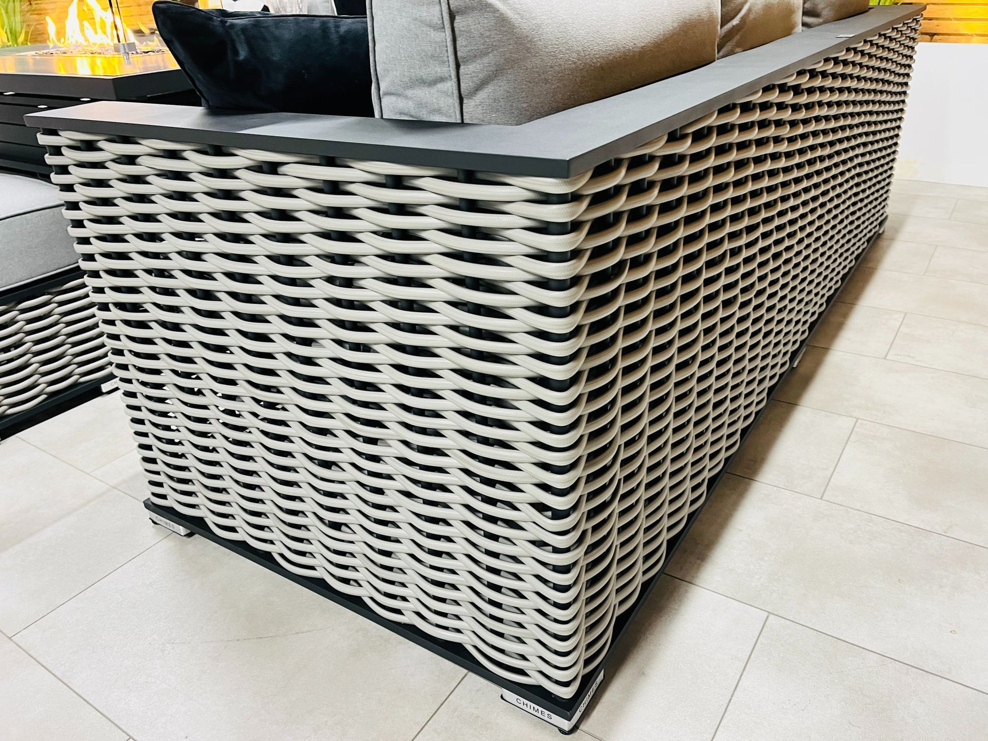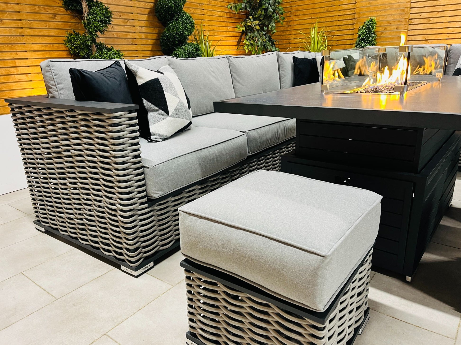 The Monaco - Aluminium Right Hand Corner Dining Set with Rising Firepit Table - Rope Weave is our premium luxury aluminium range that is not only low maintenance but has extra thick cushions which brings the ultimate comfort experience to your garden.