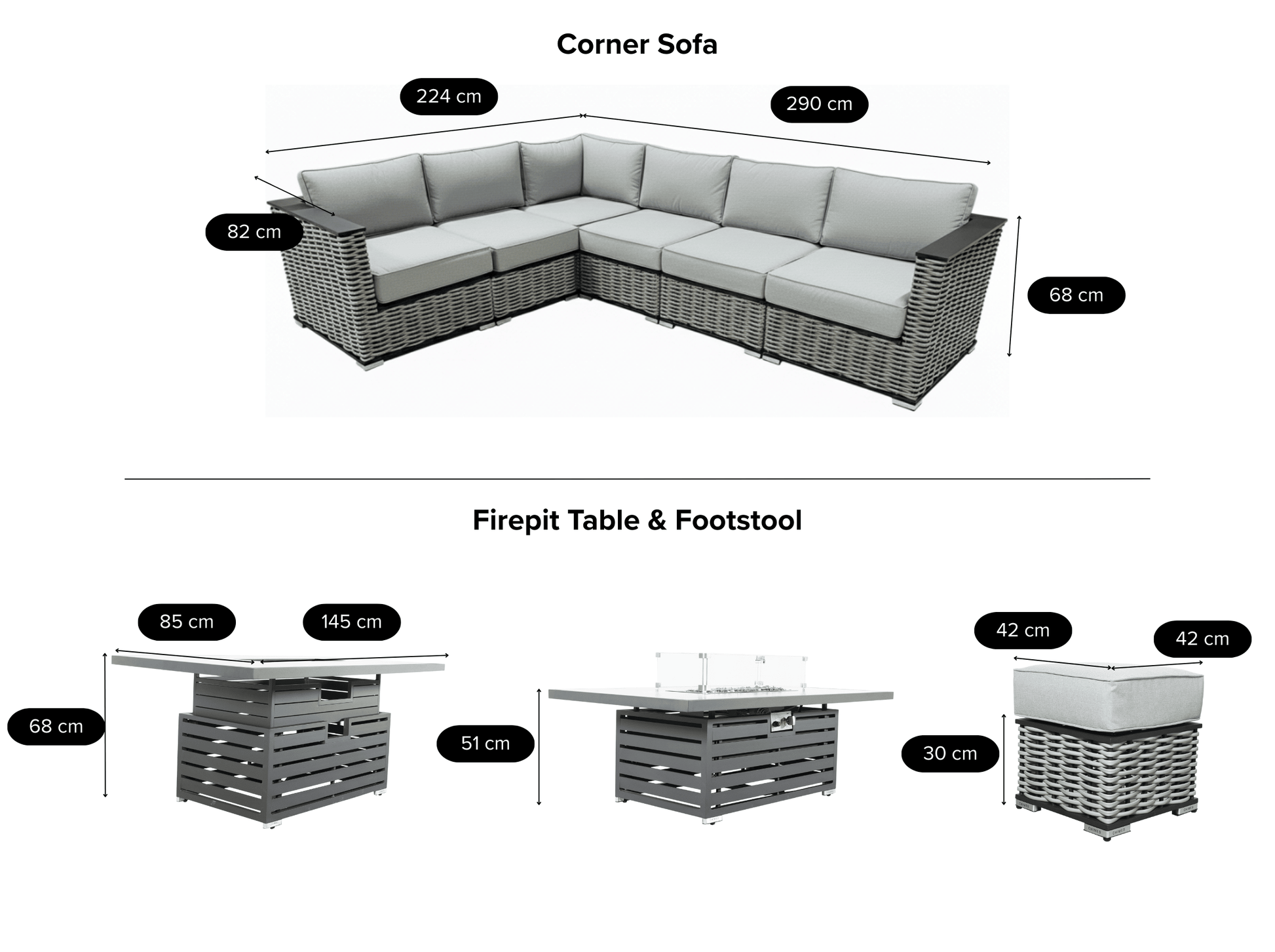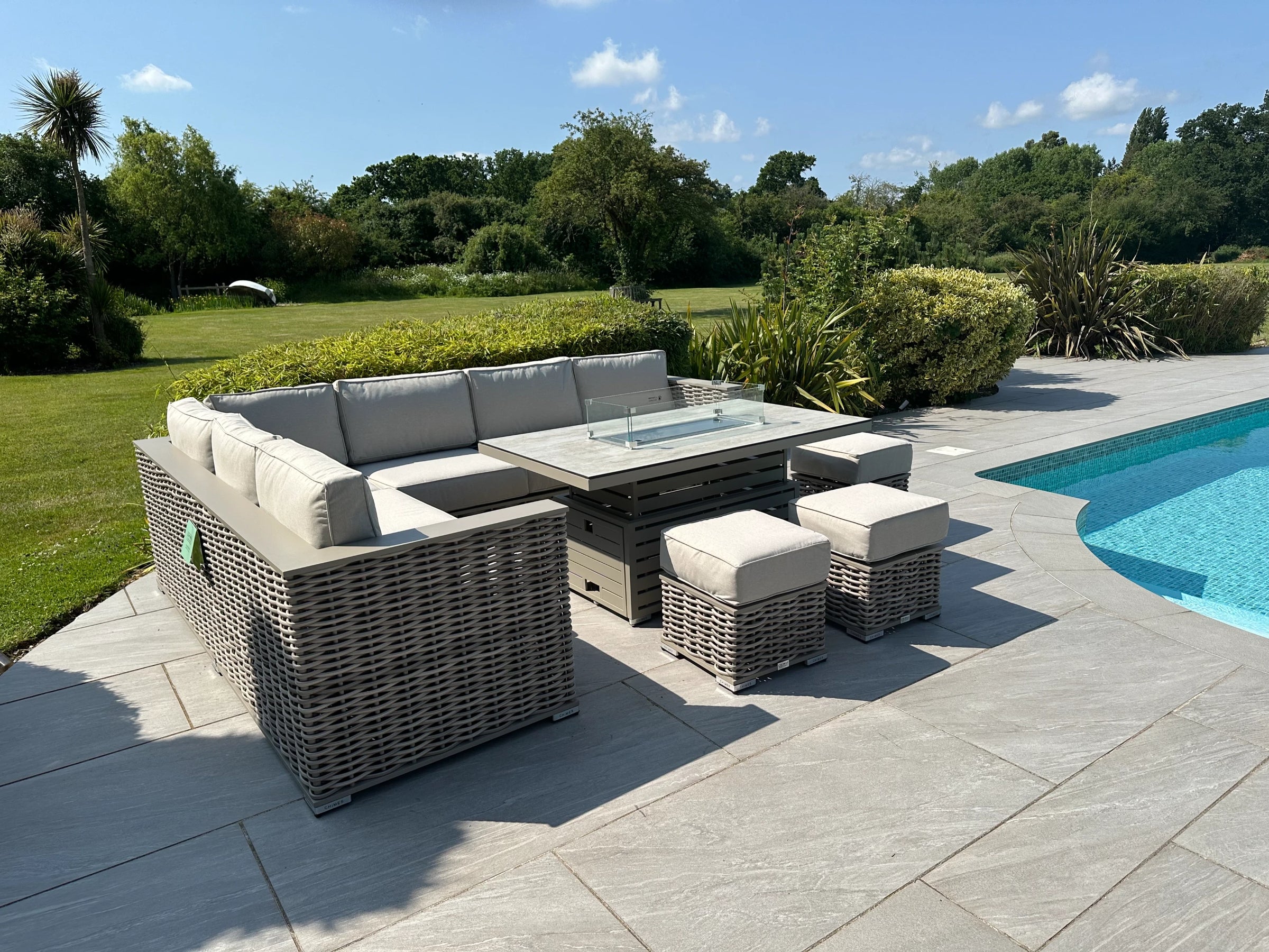 The Monaco - Aluminium & Rope Left Hand Corner Dining Set with Rising Firepit Table - Cream is our premium luxury aluminium range that is not only low maintenance but has extra thick cushions which brings the ultimate comfort experience to your garden.