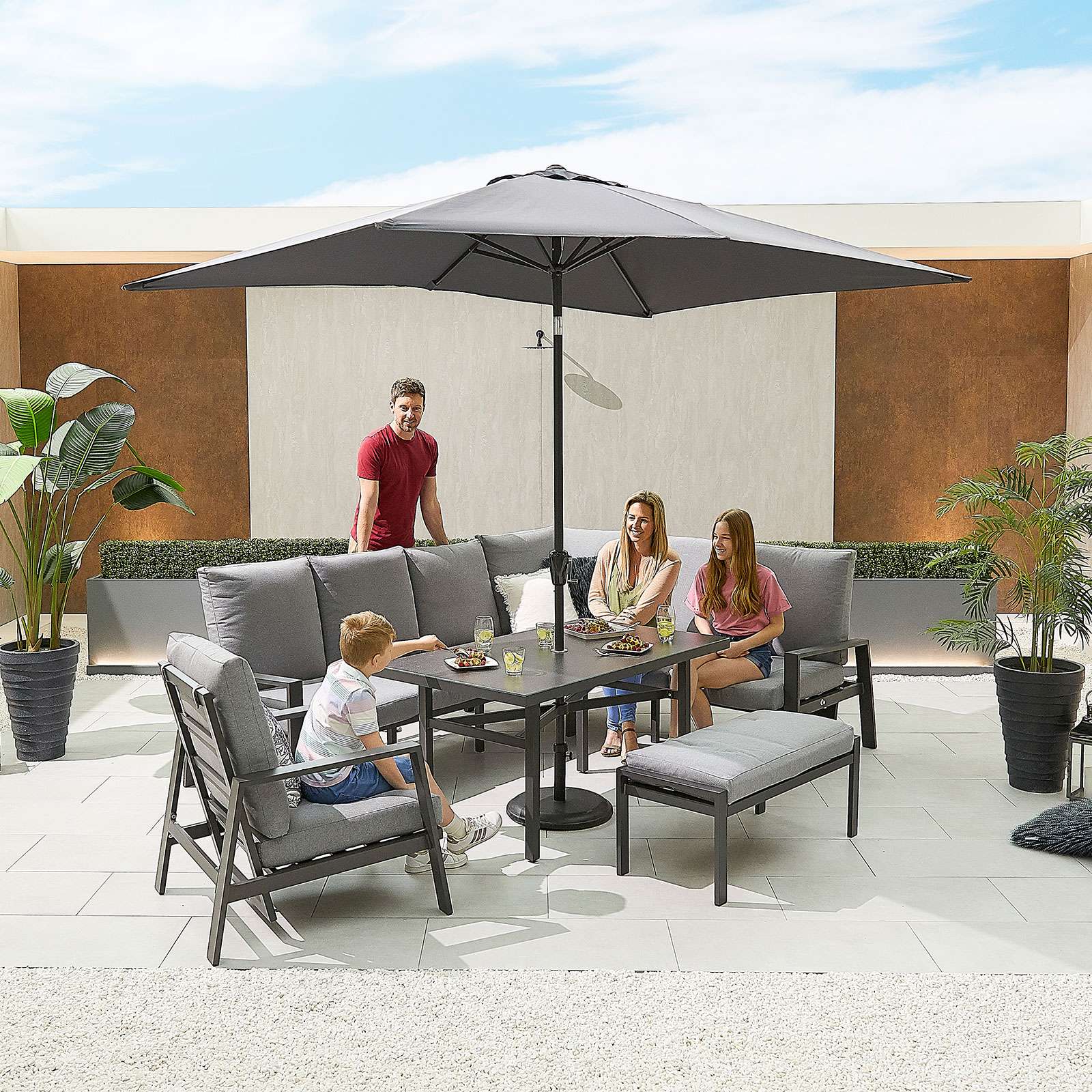 The Nova - Enna Right Hand Aluminium Reclining Casual Dining Corner Sofa Set with Parasol Hole, Armchair & Bench - Grey Frame is the ultimate corner dining set for any patio, garden or decking space.