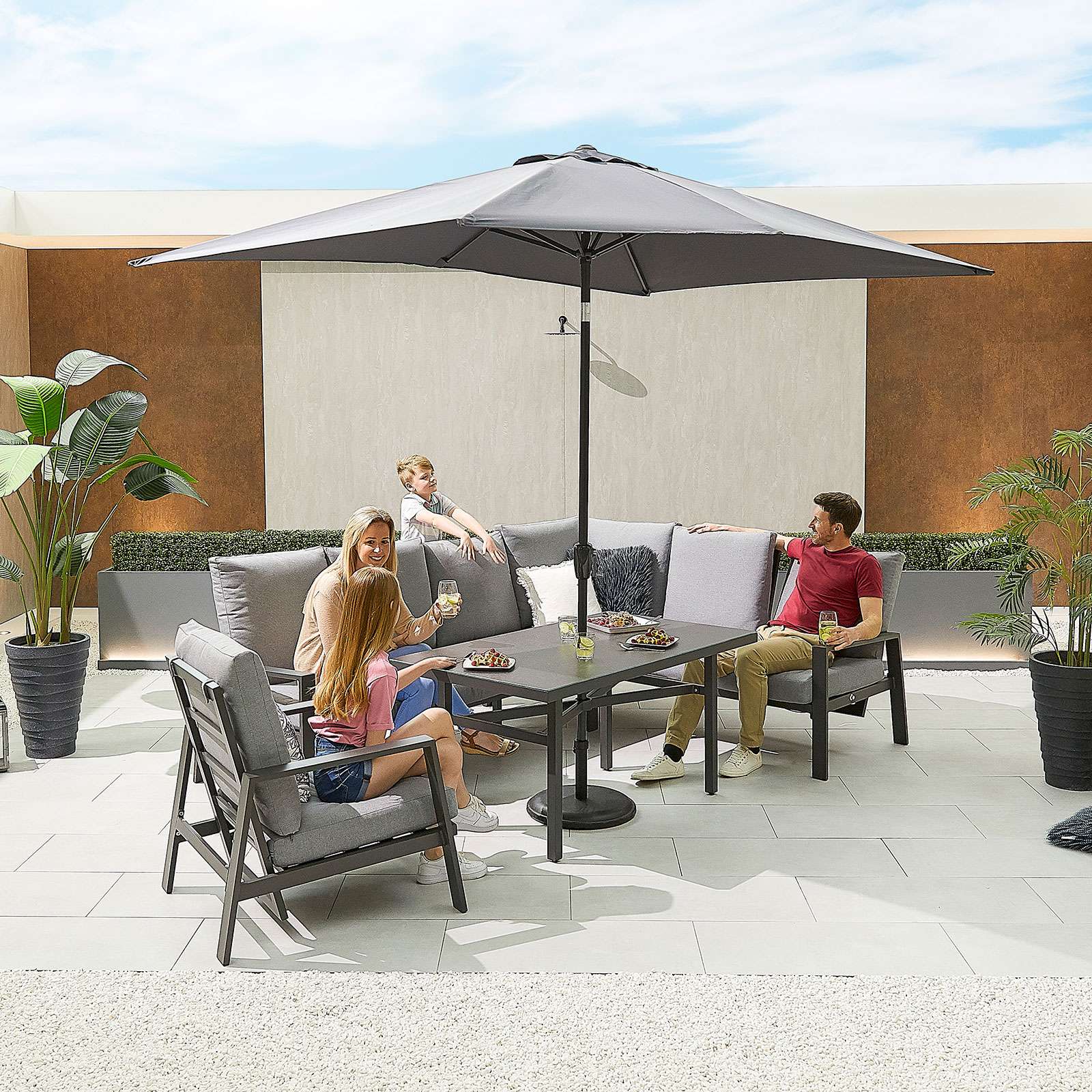 The Nova -Enna Right Hand Aluminium Reclining Casual Dining Corner Sofa Set with Parasol Hole & Armchair - Grey Frame is the ultimate corner dining set for any patio, garden or decking space.