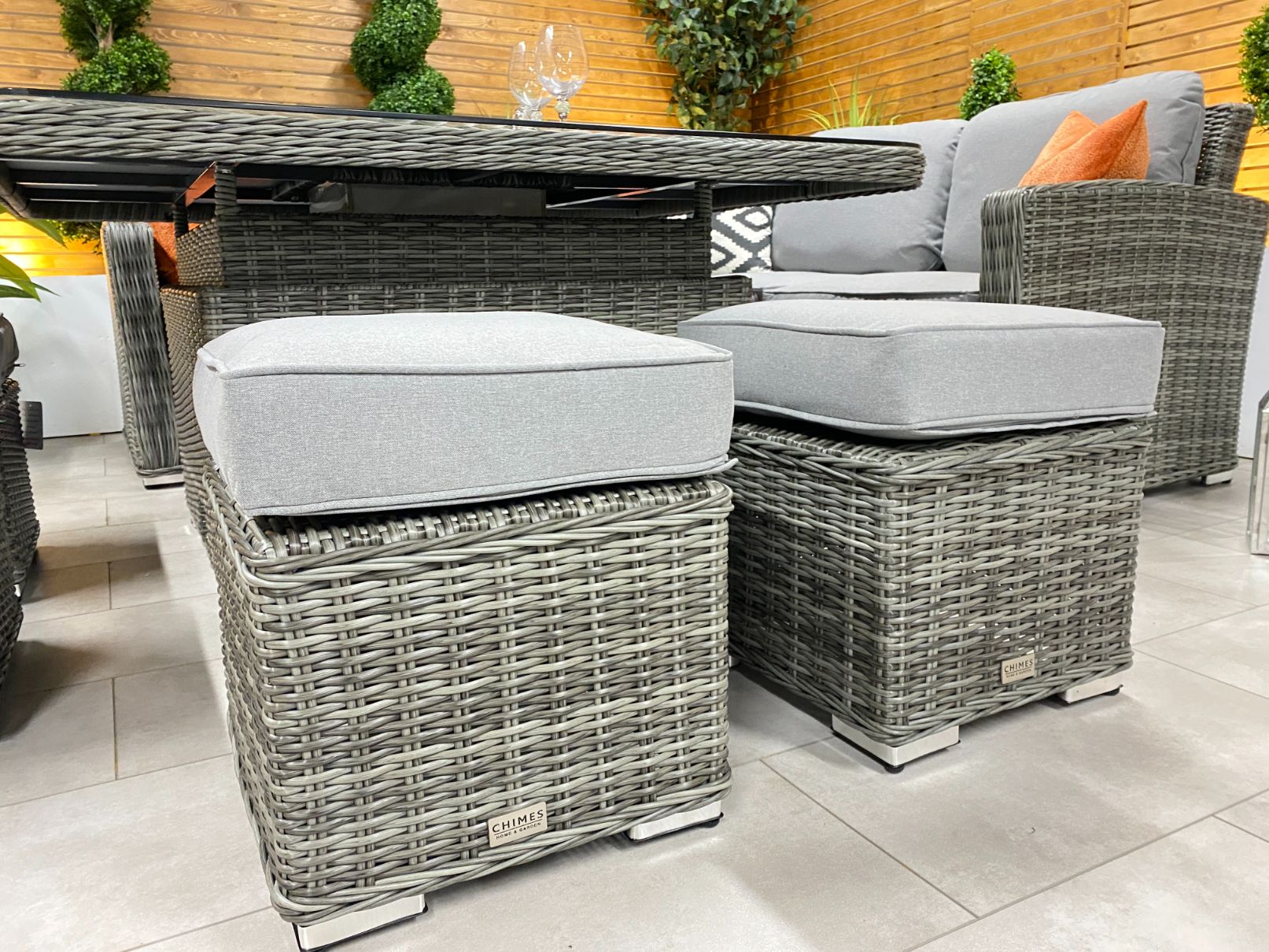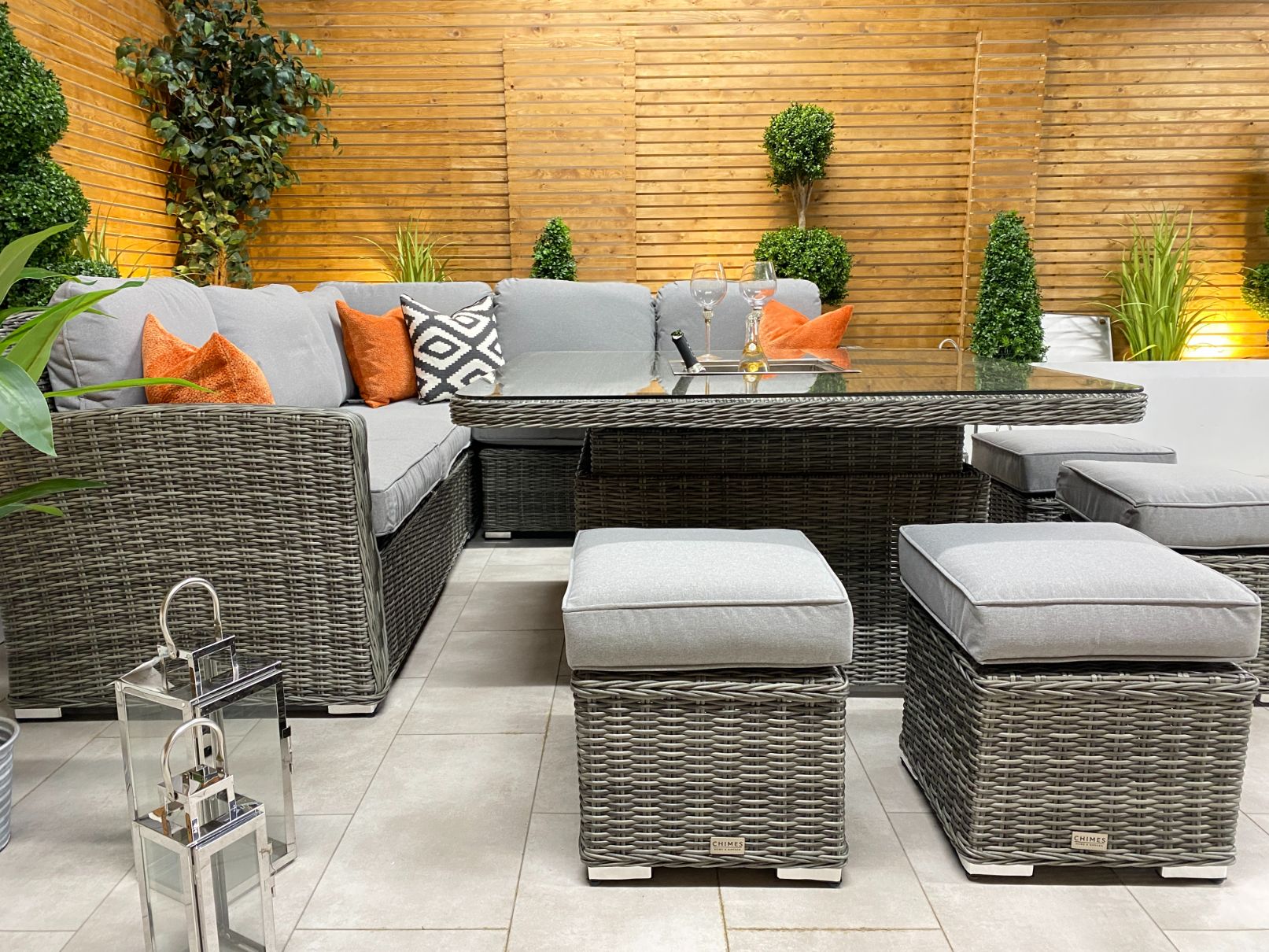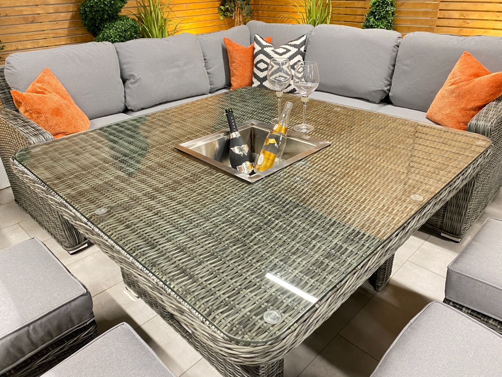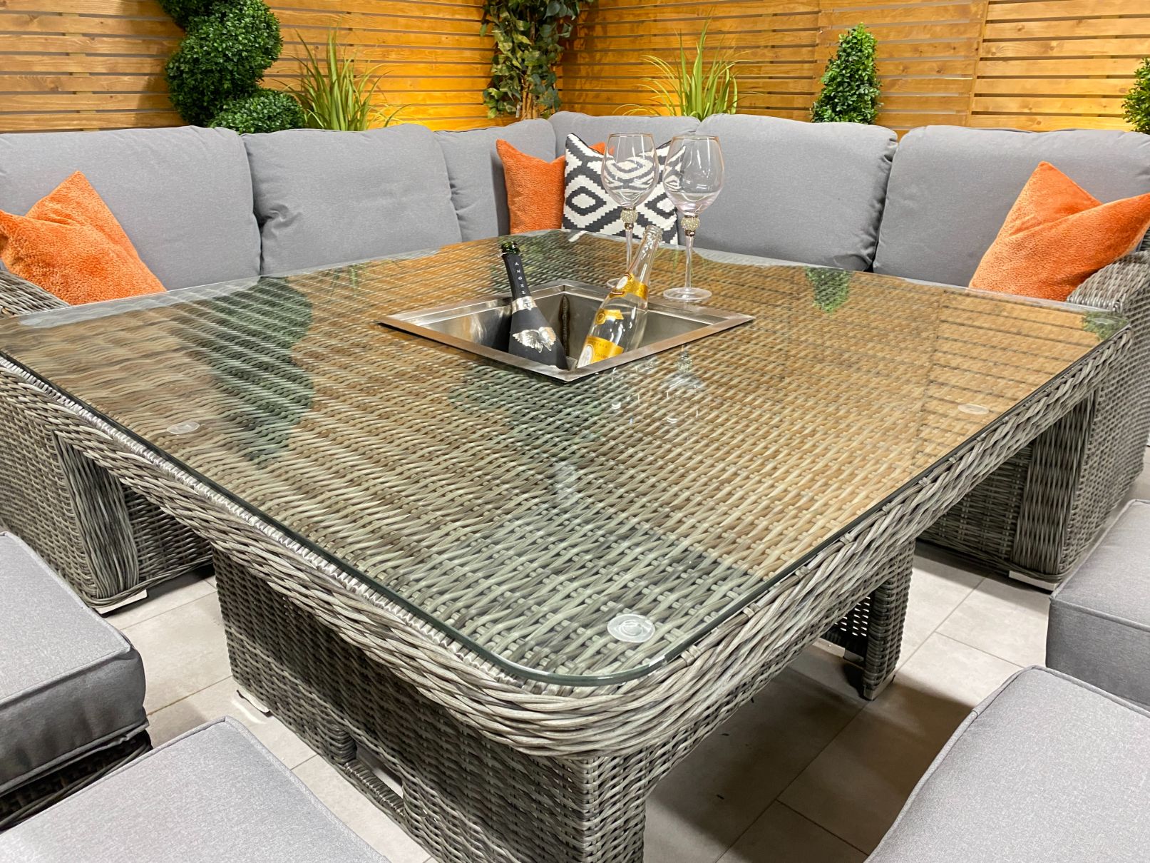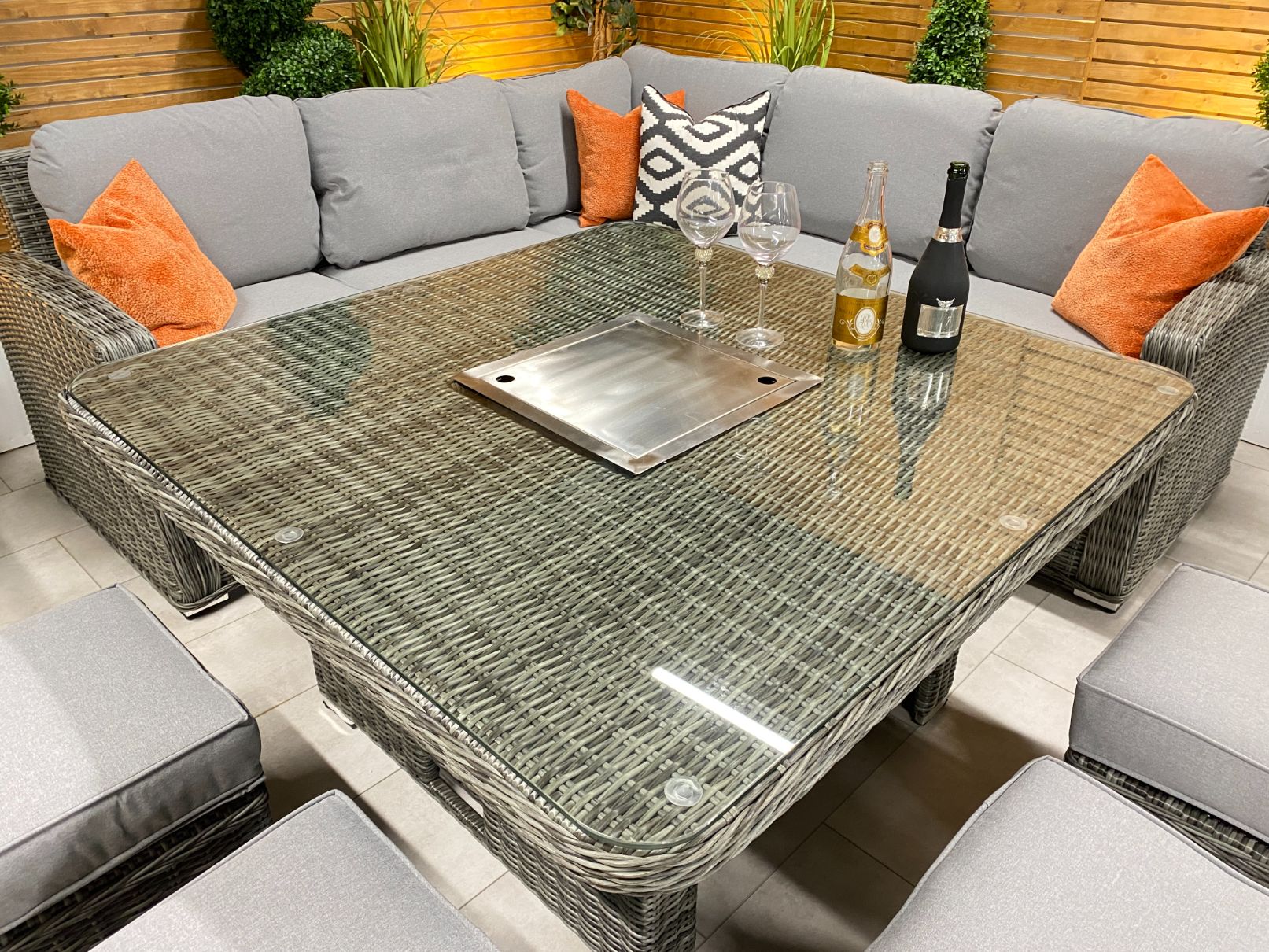 The Chimes - Prestige Grey Florence Deluxe Corner Dining Set With Rising Ice Bucket Table is the perfect set for entertaining guests and relaxing with the added twist of a Rising Ice Bucket Table creating a multi purpose coffee table or dining table perfect for entertaining guests with drinks.