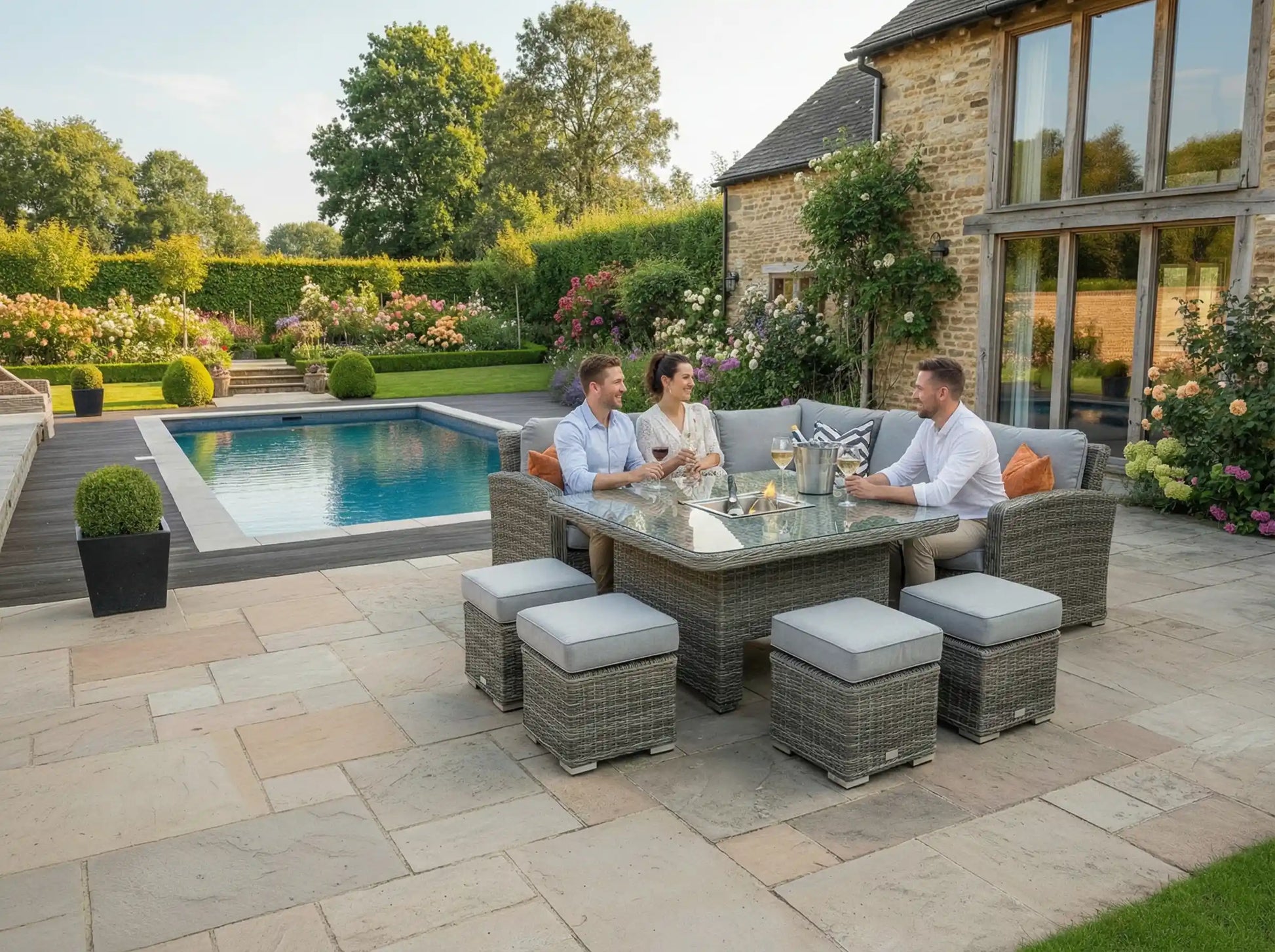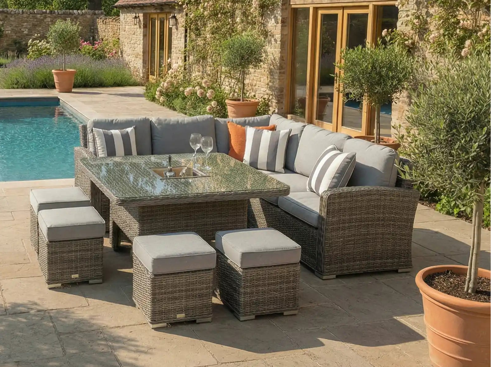 Designed to be the big brother of the Florence Left Hand, Right Hand & Compact Versions, the Florence Deluxe is perfect for slightly larger spaces by creating space and comfort with the larger corner sections and the larger table and will finish off the look of any garden. This set seats 9 people comfortably and has the added benefit of 4 stools and extra thick cushions for comfort around the whole set.