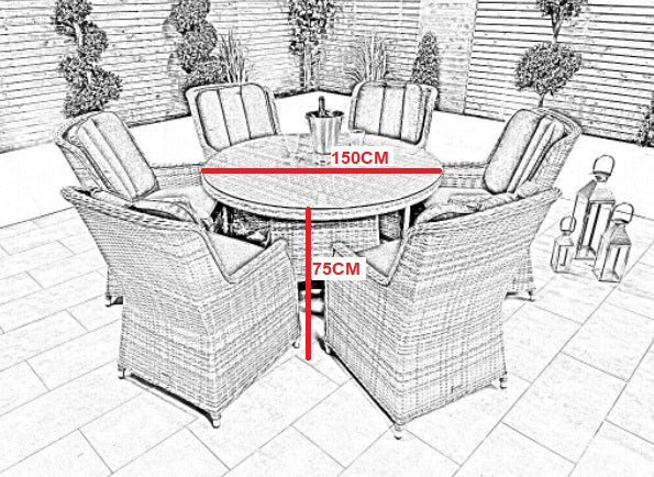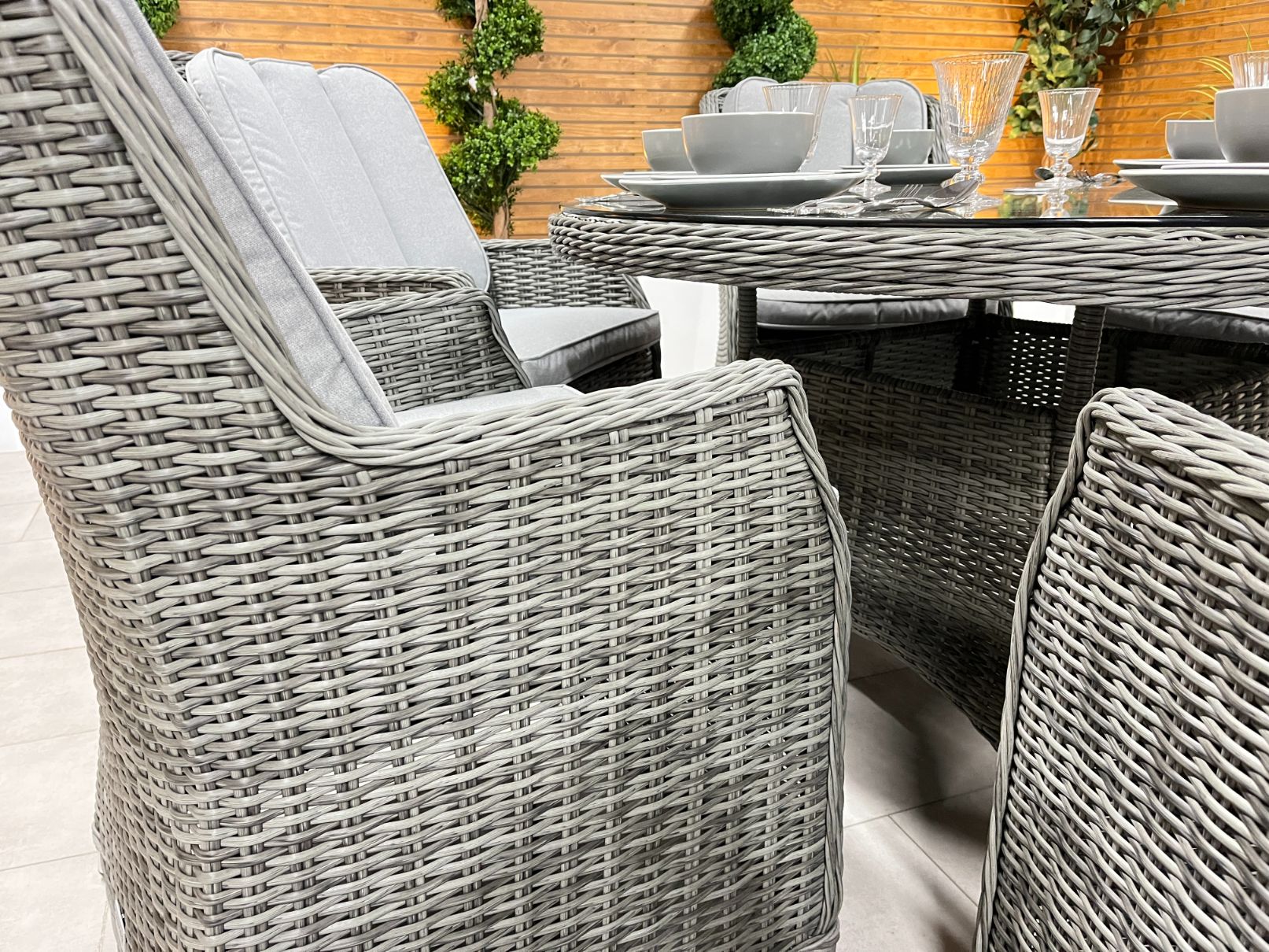 The 135cm round table which has the added bonus of a parasol hole, is also finished with full round weave around the edges for a premium look and feel. The table top is finished with half round weave and a poly board underneath to help reduce the amount of sagging in hot weather. Our glass in also upgraded to 8mm from most of our competitors who only use 5mm on there table tops.