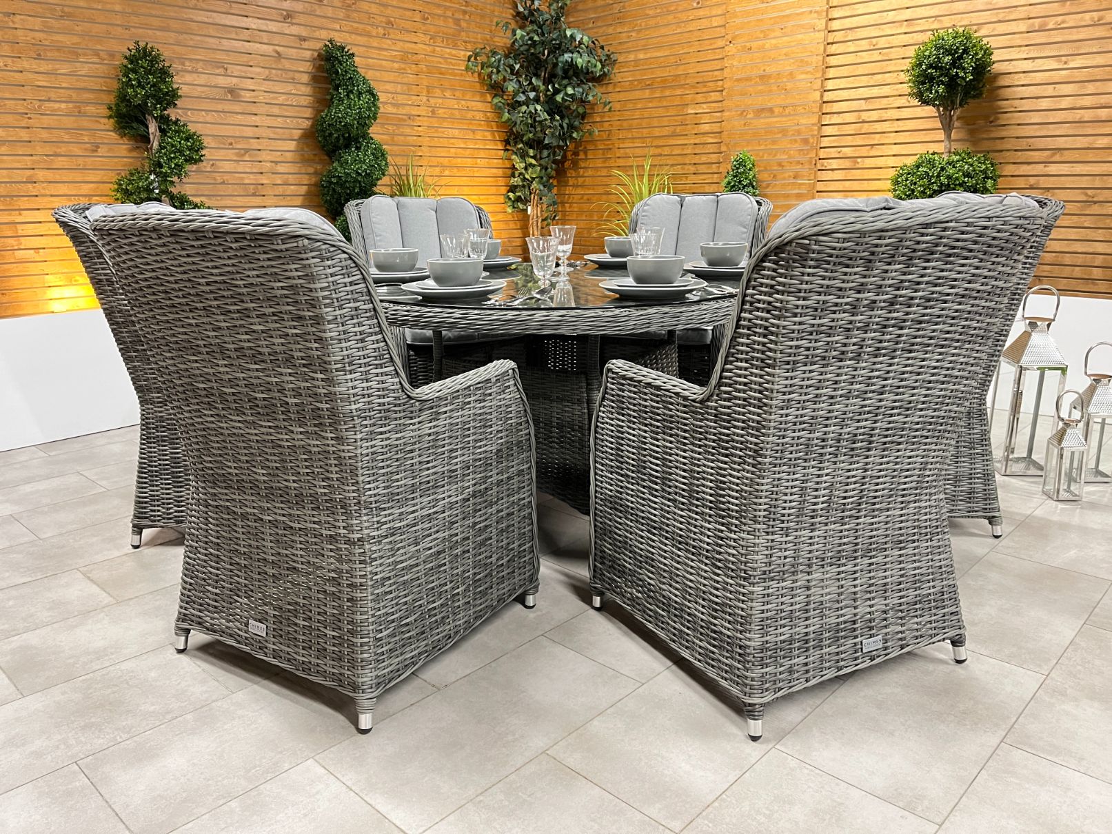 The Chimes - Prestige Grey Madrid 6 Seat Round Dining Set is a beautiful 6 seat round dining set with a 135cm table with parasol hole and is a perfect dining set to entertain friends and family.