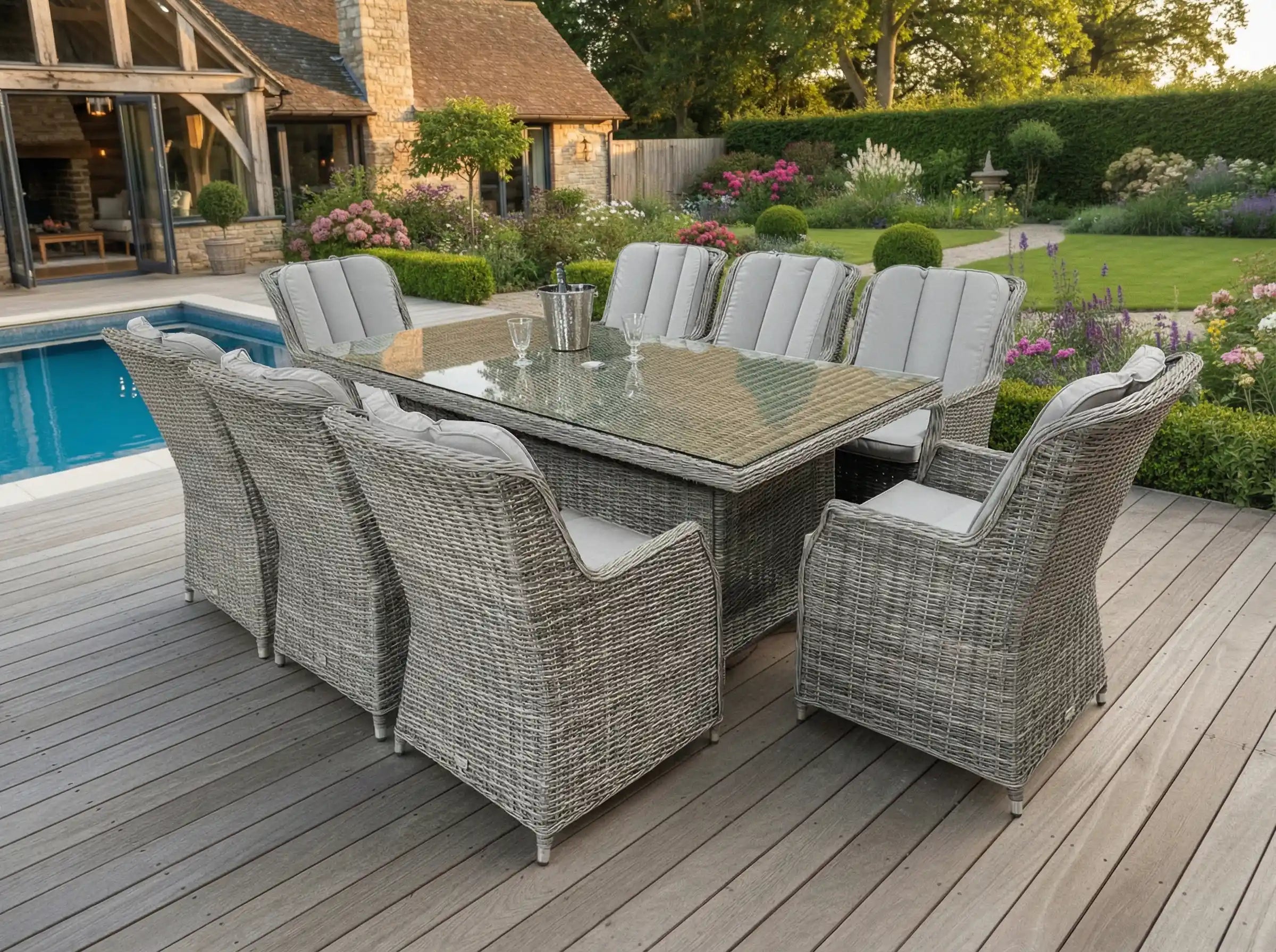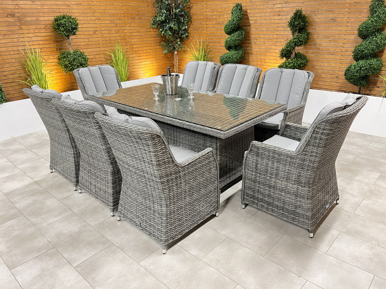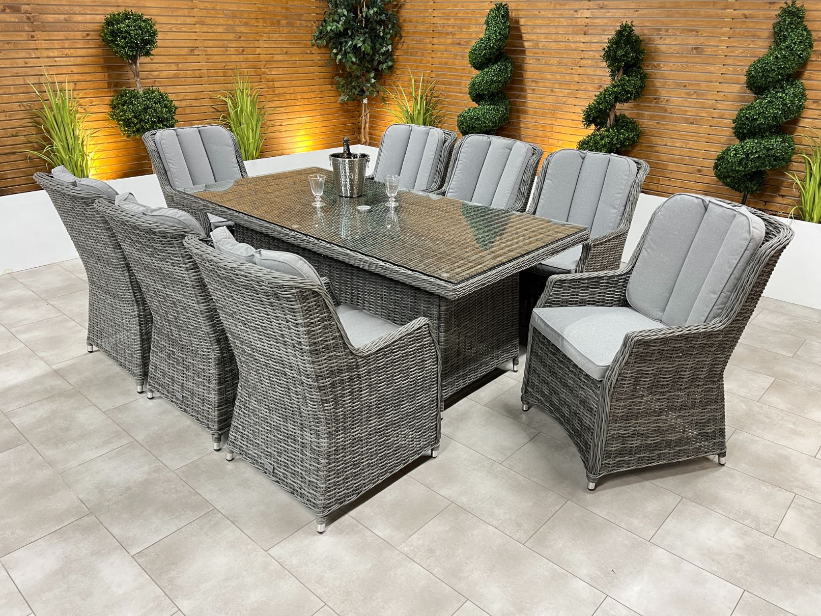 The Chimes - Prestige Grey Madrid 8 Seat Rectangular Dining Set is a beautiful 8 seat rectangular dining set with a 200cm x 100cm table with parasol hole and is a perfect dining set to entertain friends and family.