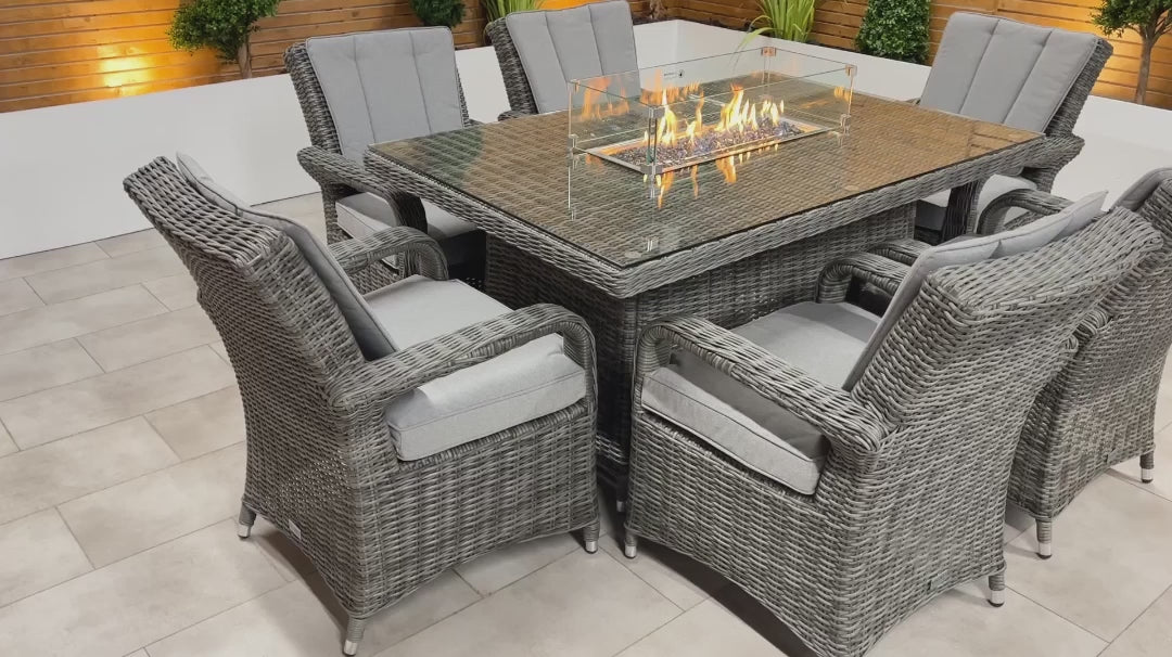 The Chimes - Prestige Grey Valencia 6 Seat Rectangular Firepit Dining Set is a beautiful 6 seat rectangular dining set with a 150cm x100cm Firepit table is the perfect dining set to entertain friends and family and warming up those chilly evenings which in turn extends your season.
