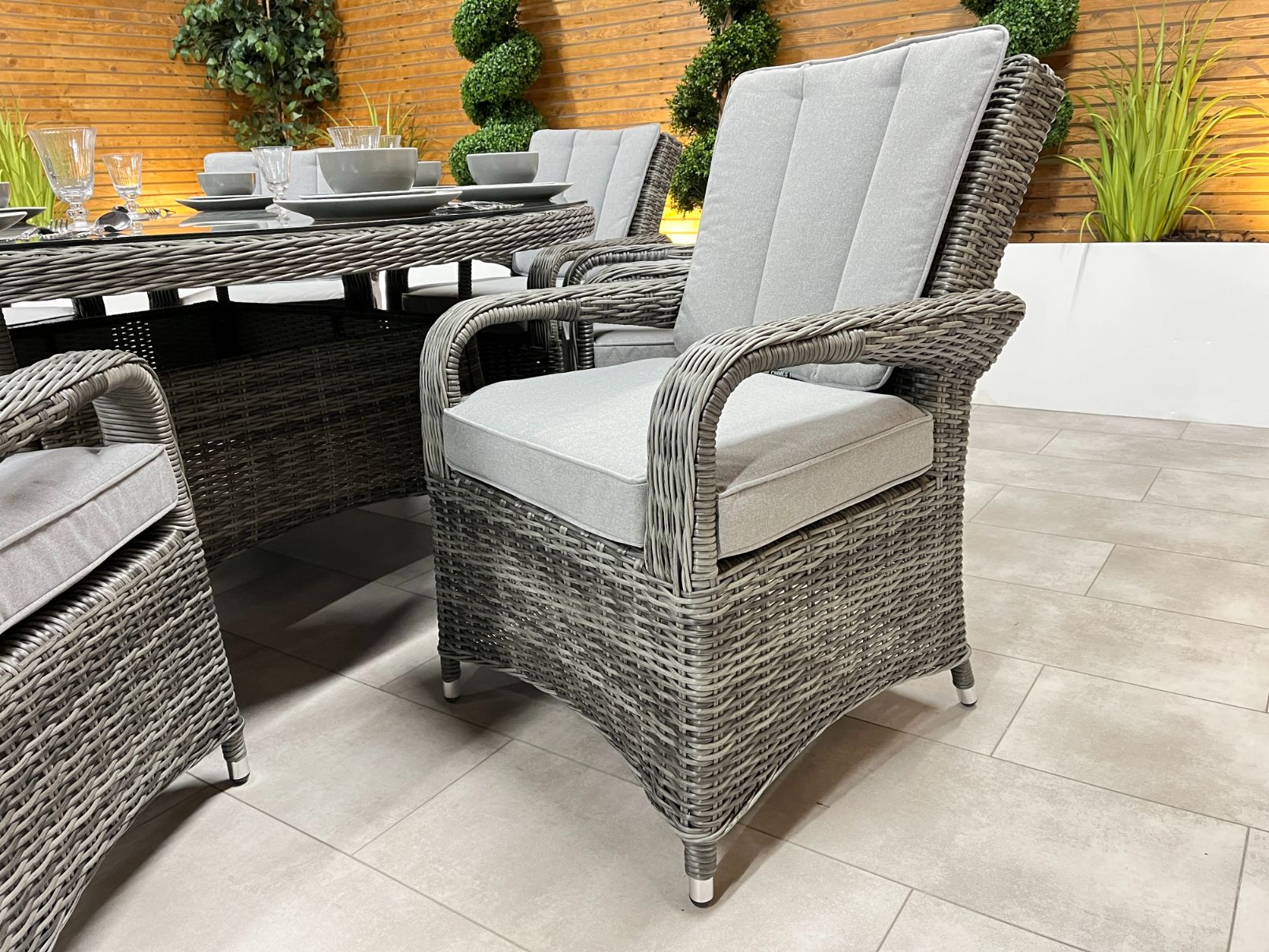 Our Prestige Grey Range is built to the highest standard and comes with a 5 year warranty. The weave is a mixture of high quality half round & full weave which is constructed of HDPE Rattan the highest grade available meaning it will not go brittle or fade and is resistant to UV. Our frame work is made from a dual core aluminium frame unlike many of our competitors which gives much added strength. All of our Prestige Grey range come with Powder Coated Aluminium frames which makes this set 100% resistant to corrosion and rust giving you peace of mind for many years to come.