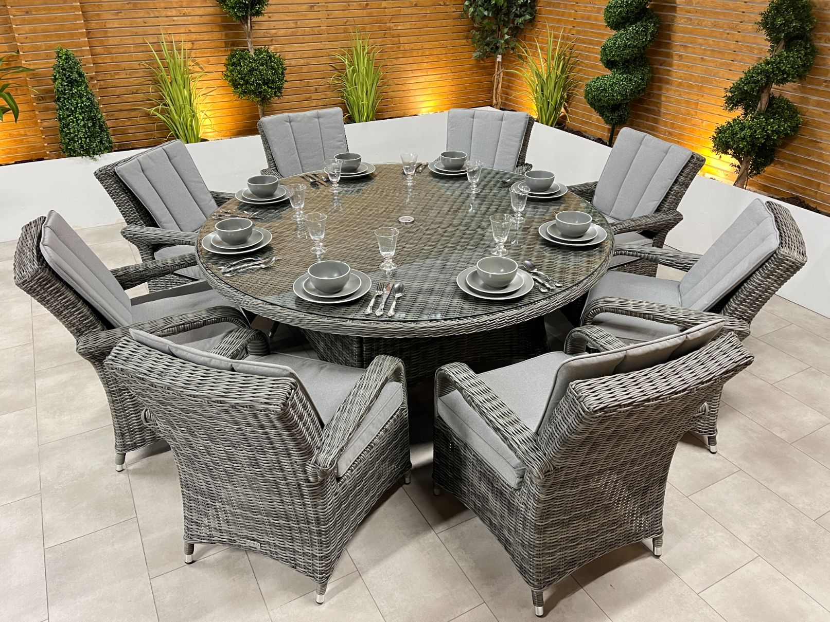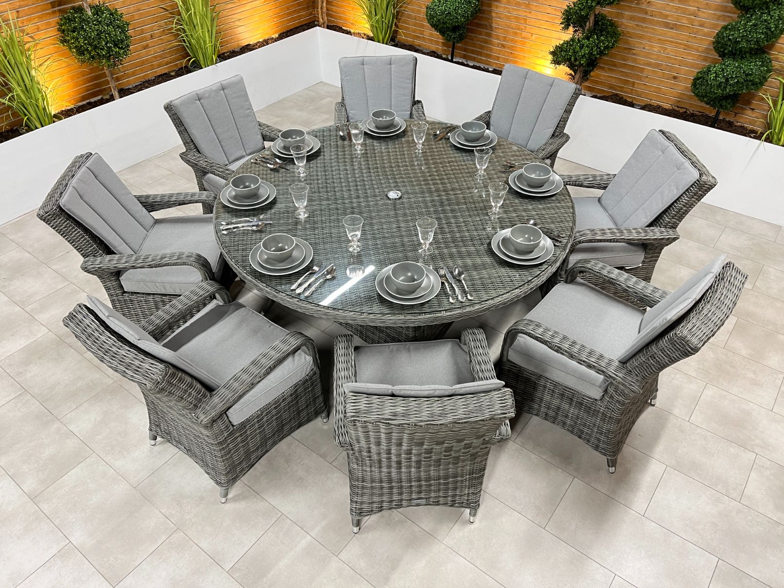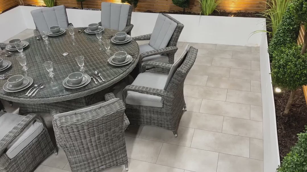 The Chimes - Prestige Grey Valencia 8 Seat Round Dining Set is a beautiful 8 seat round dining set with a 180cm table with parasol hole and is a perfect dining set to entertain friends and family.