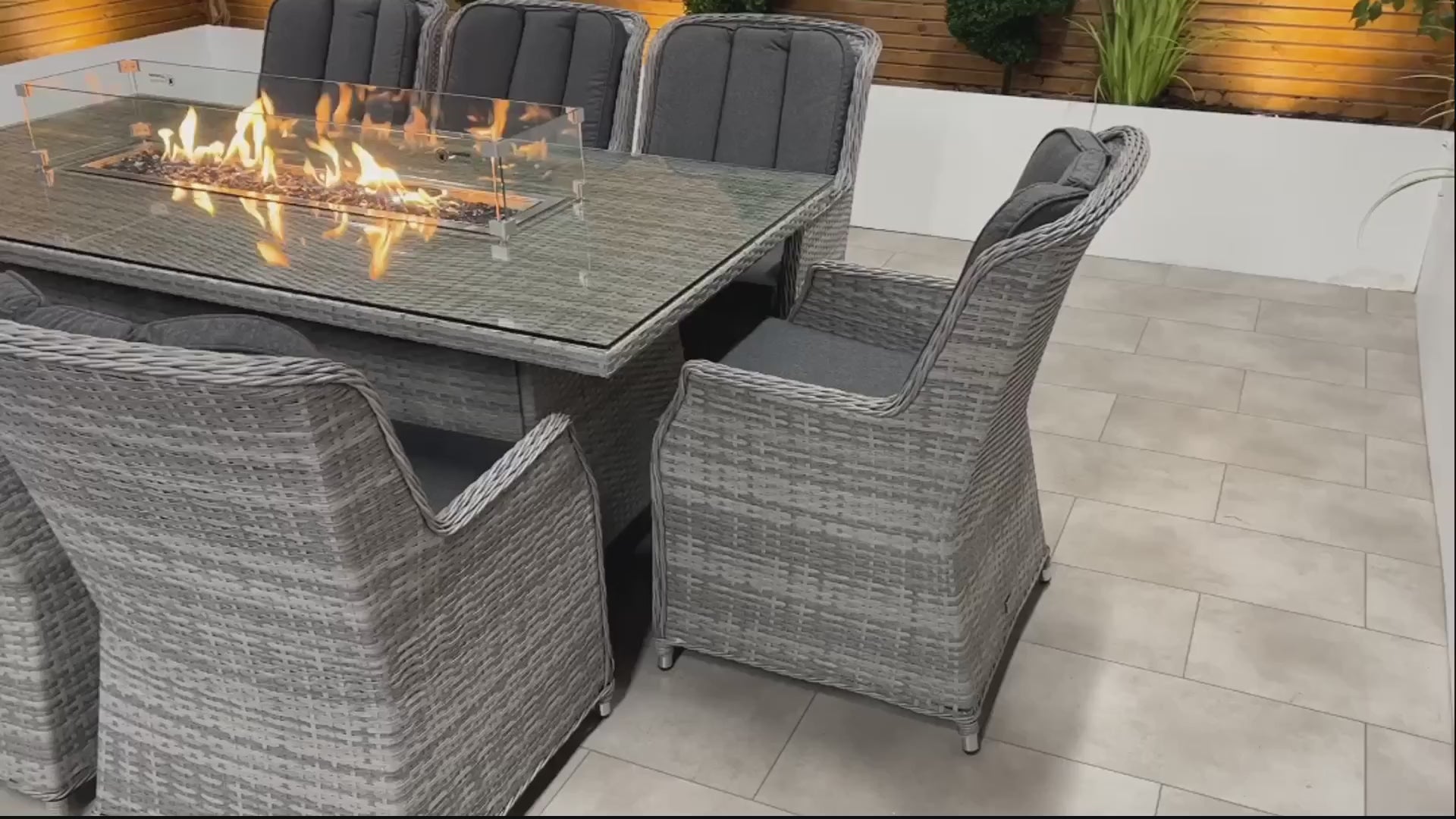 The Chimes - Stone Grey Bella 8 Seat Rectangular Dining Set - 1 Meter x 2 Meter Rectangular With Firepit Table is a beautiful 8 Seat rattan dining set with a 200cm x100cm firepit table. The set comfortably seats 8 people and are ideal for entertaining for dinner and also drinks, or maybe relaxing in the sun. Not a lover of the sun ?then why not add one of our aluminium parasols to your order to keep you in the shade.