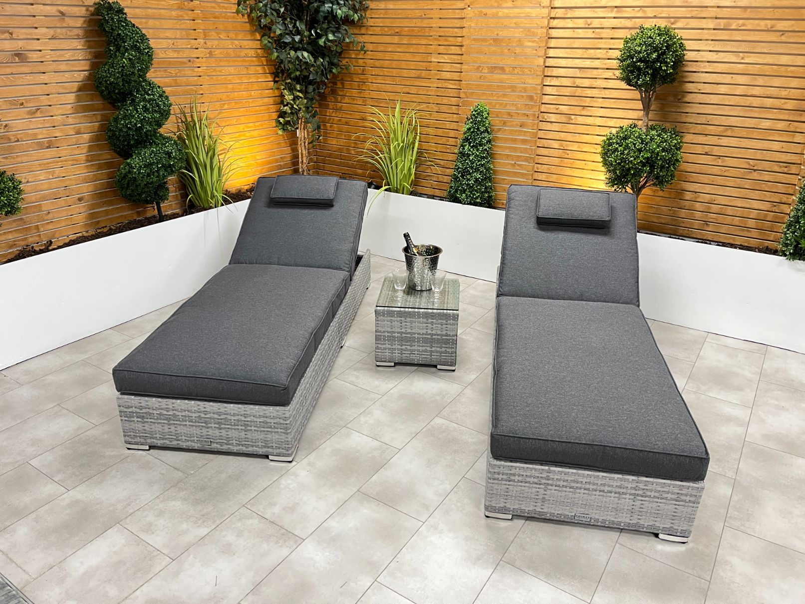 The Chimes - Stone Grey Naples Rattan Sun Lounger Set is a beautiful pair of sunloungers ideal for relaxing on those lazy sunny days. The Set comprises of 2 Sun loungers with a coffee table and a 5mm Tempered Safety glas table top. The full length cushions are shower resistant but ideally should be brought inside when possible.