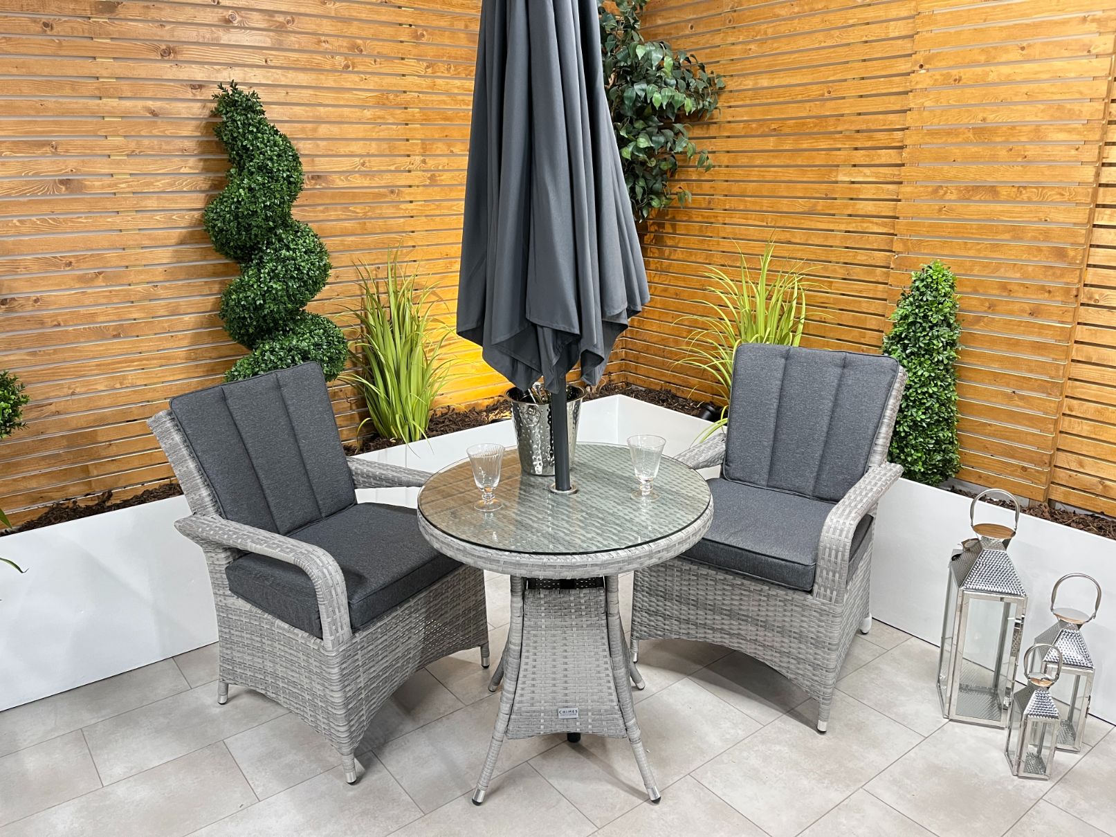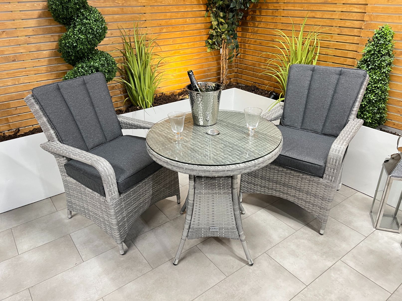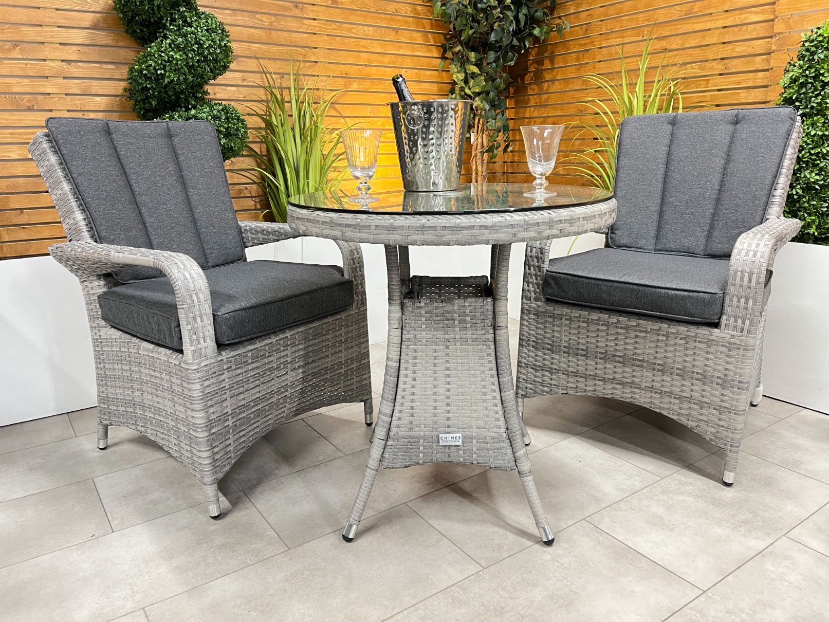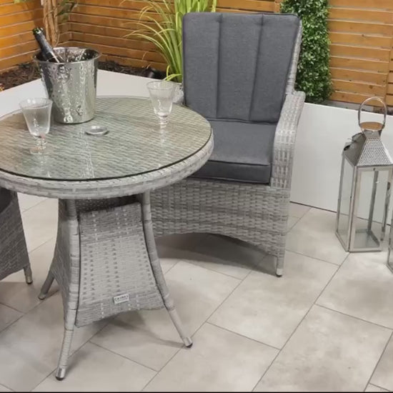 In stock & ready for deliveryThe Chimes - Stone Grey Verona 2 Seat Bistro Set is a beautiful 2 Seater set with a 75cm table with parasol hole and is perfect for a small areas such as balcony or area in your garden.