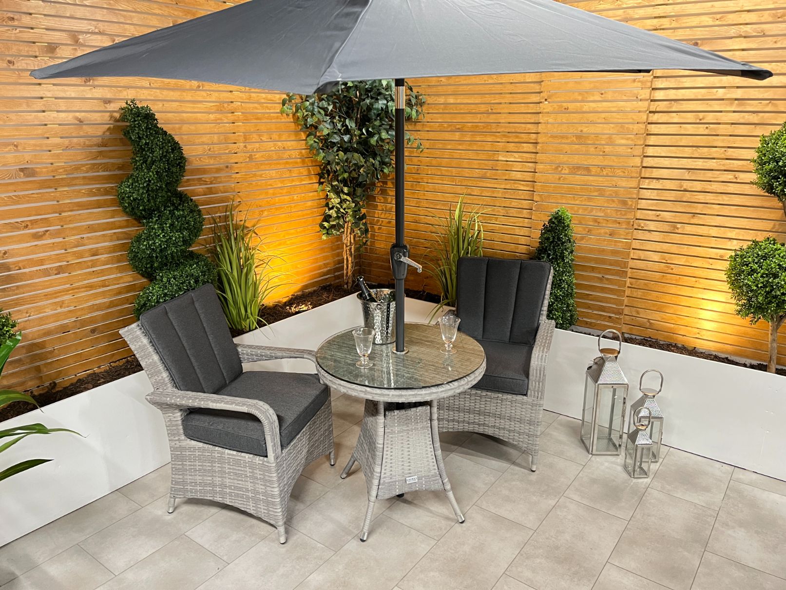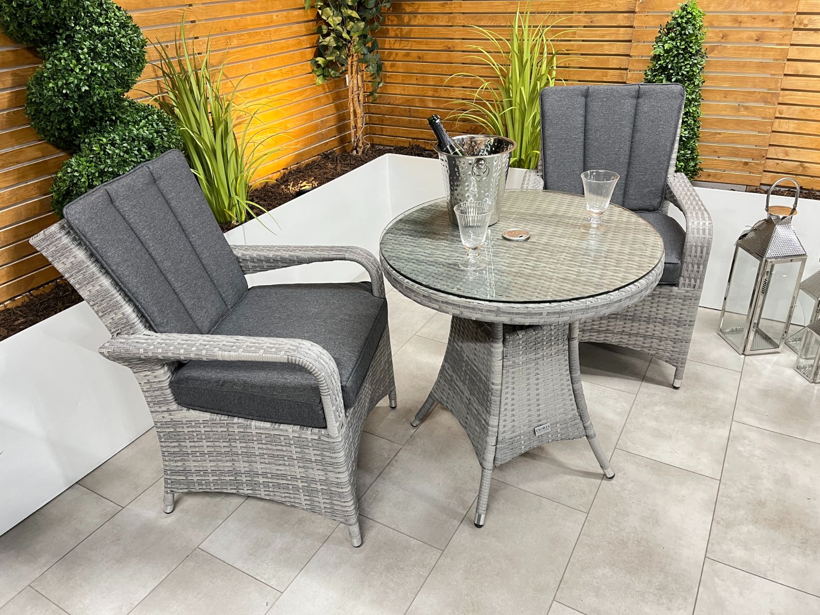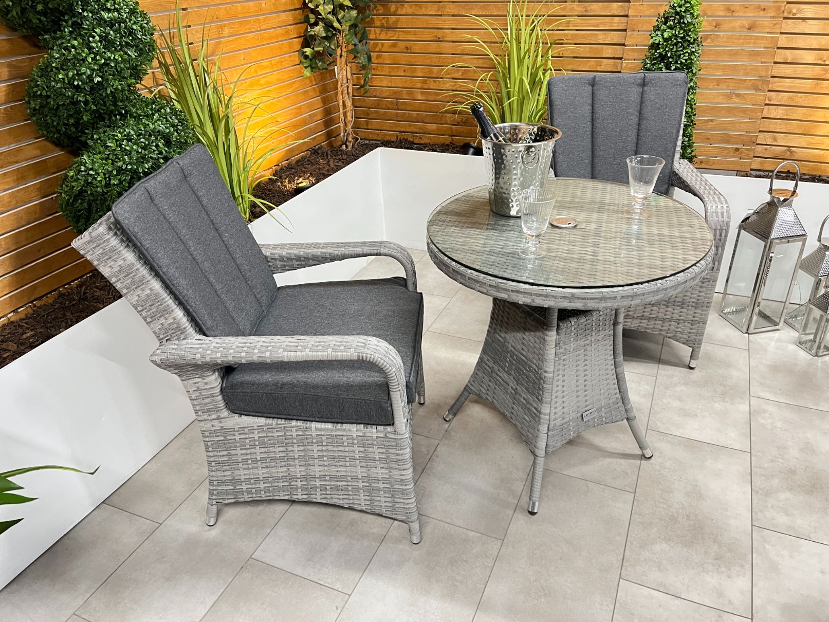 In stock & ready for deliveryThe Chimes - Stone Grey Verona 2 Seat Bistro Set is a beautiful 2 Seater set with a 75cm table with parasol hole and is perfect for a small areas such as balcony or area in your garden.