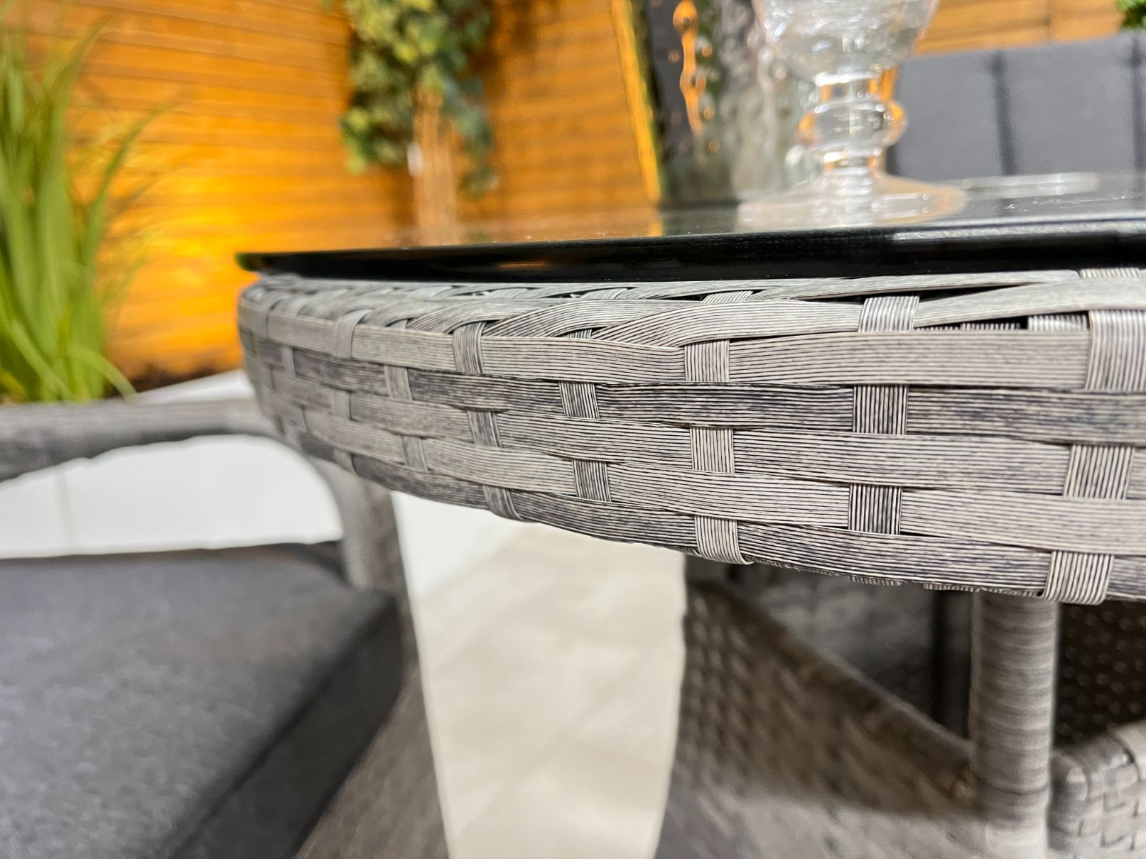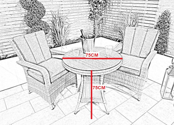 The 75cm table which has the added bonus of a parasol hole, is also finished with flat weave around the edges of the table and the table top for a premium look and feel. The table top also has poly board underneath to help reduce the amount ofsagging in hot weather. Our glass in also upgraded to 8mm from most of our competitors who only use 5mm on there table tops.