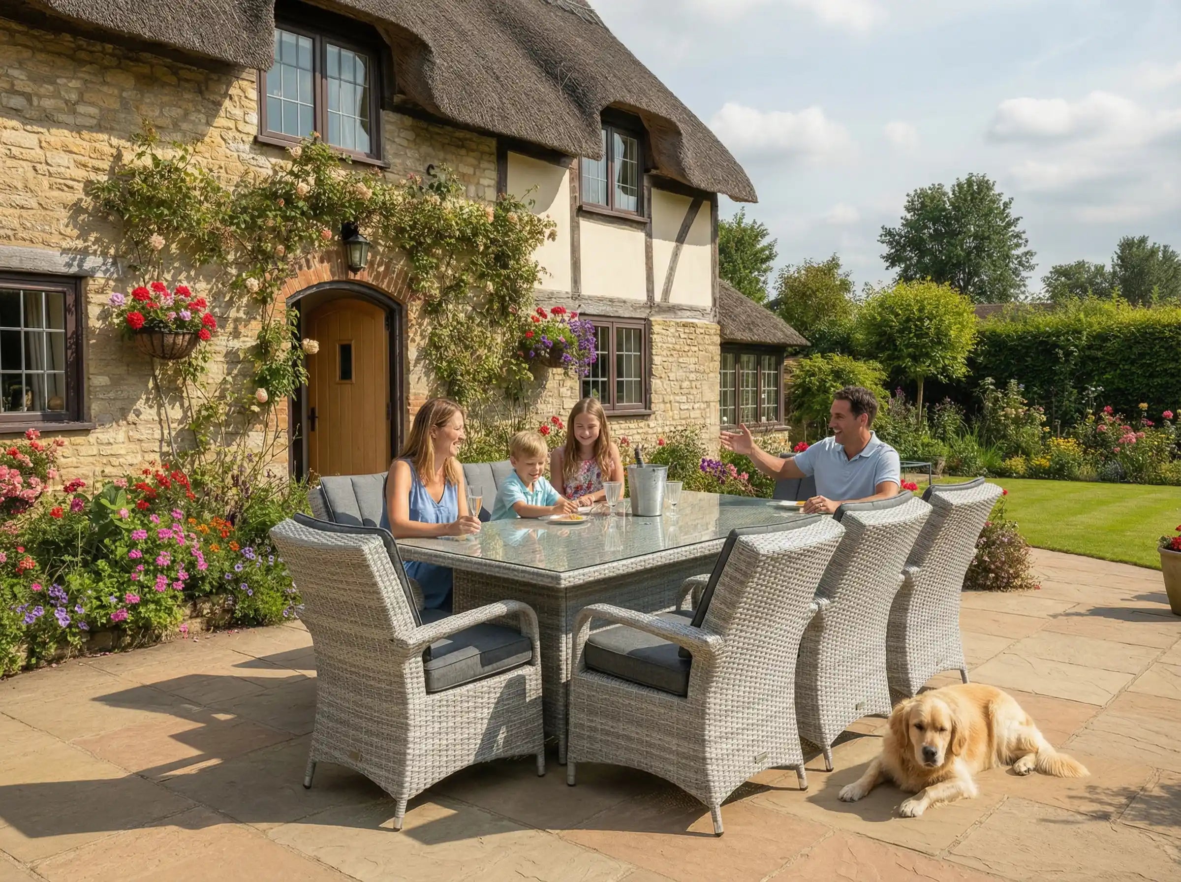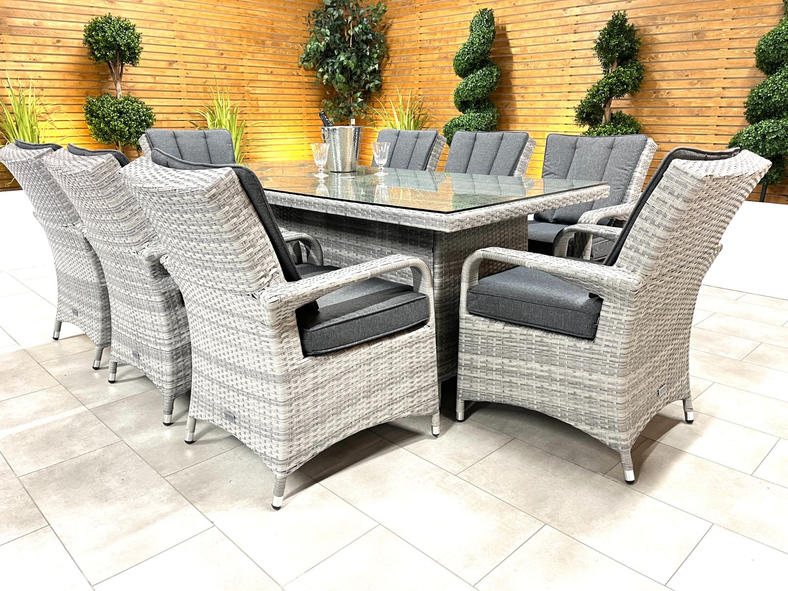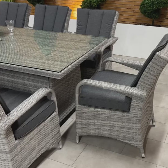 The Chimes - Stone Grey Verona 8 Seat Rectangular Dining Set is a beautiful 8 Seat rattan dining set with a 100cm X 200cm table with parasol hole. The set comfortably seats 8 people and are ideal for entertaining for dinner and also drinks, or maybe relaxing in the sun. Not a lover of the sun? then why not add one of our aluminium parasols to your order to keep you in the shade.
