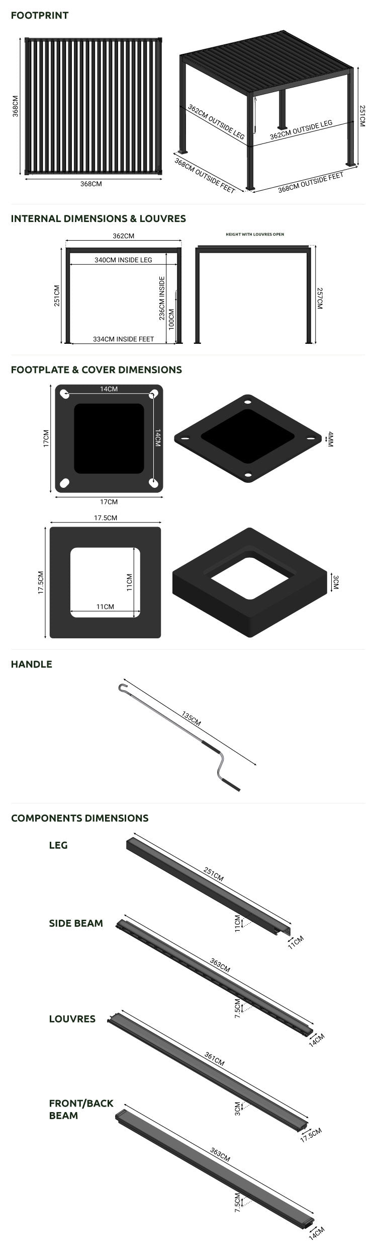 Additionally, we are proud to share that this collection of pergolas is finished with a TIGER Drylac powder coating which offers improved protection over standard powder coating and is more durable.
