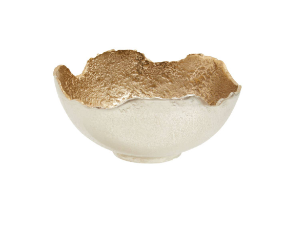 In stock & ready for deliveryThe Darcy Nickel And Gold Finish Bowl is a captivating piece of accent decor that combines contrasting textures and metallic finishes. The bowl features an irregular, organic rim, giving it a natural appearance. The interior is finished in a rich, highly textured gold that contrasts beautifully with the exterior in a nickel finish. This bowl expertly blends rustic texture with contemporary metallic luxury.