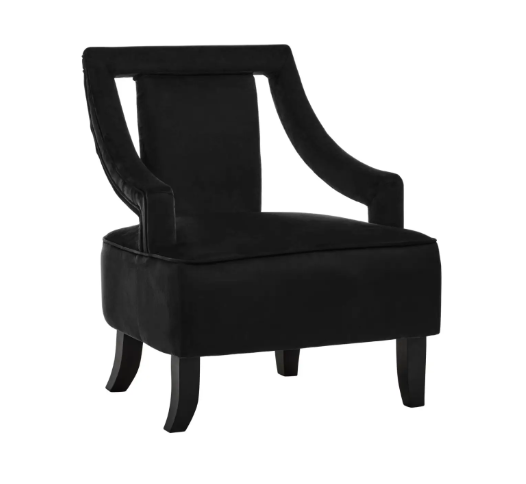 The Hilton Black Velvet Chair is a combination of vintage and mid-century modern aesthetic. The foam padded and inward curving armrests add comfort. The design and wooden legs make this chair suitable for classically inspired décor.
