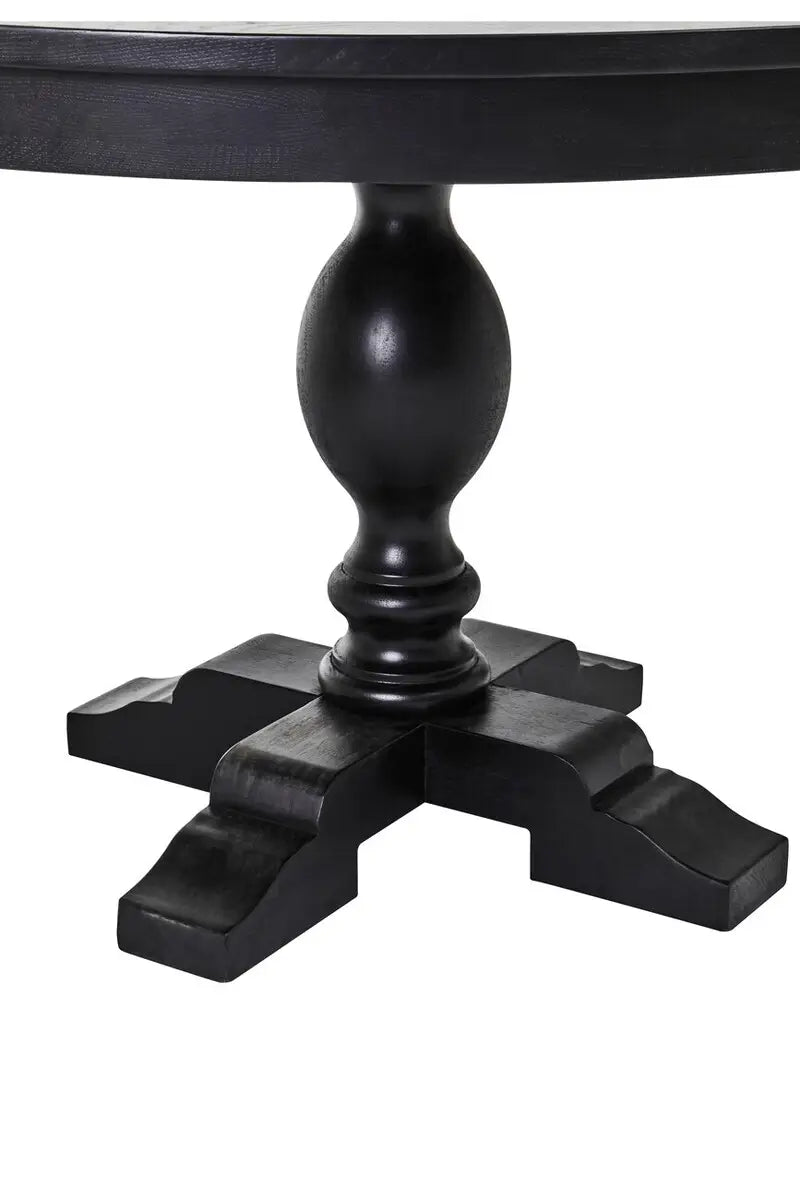The Lydia table has a round form with an empire style carved base. The table is supported by a strong pedestal. It has a rich matte black finish which enhances the antique charm of the table. It goes well with classic or farmhouse style interiors.
