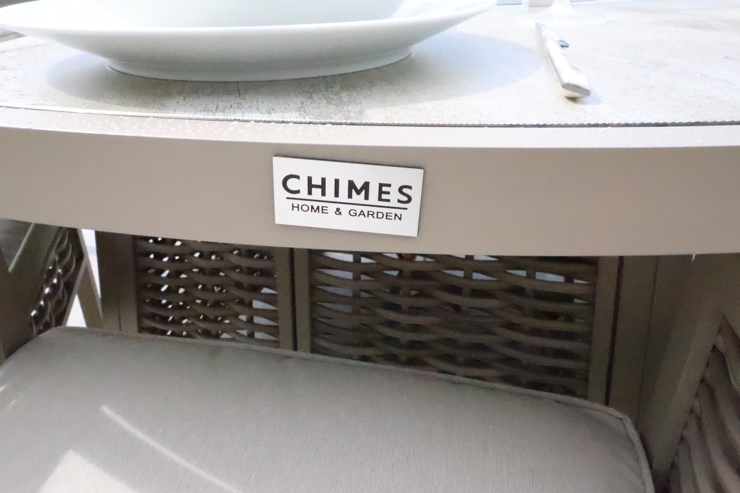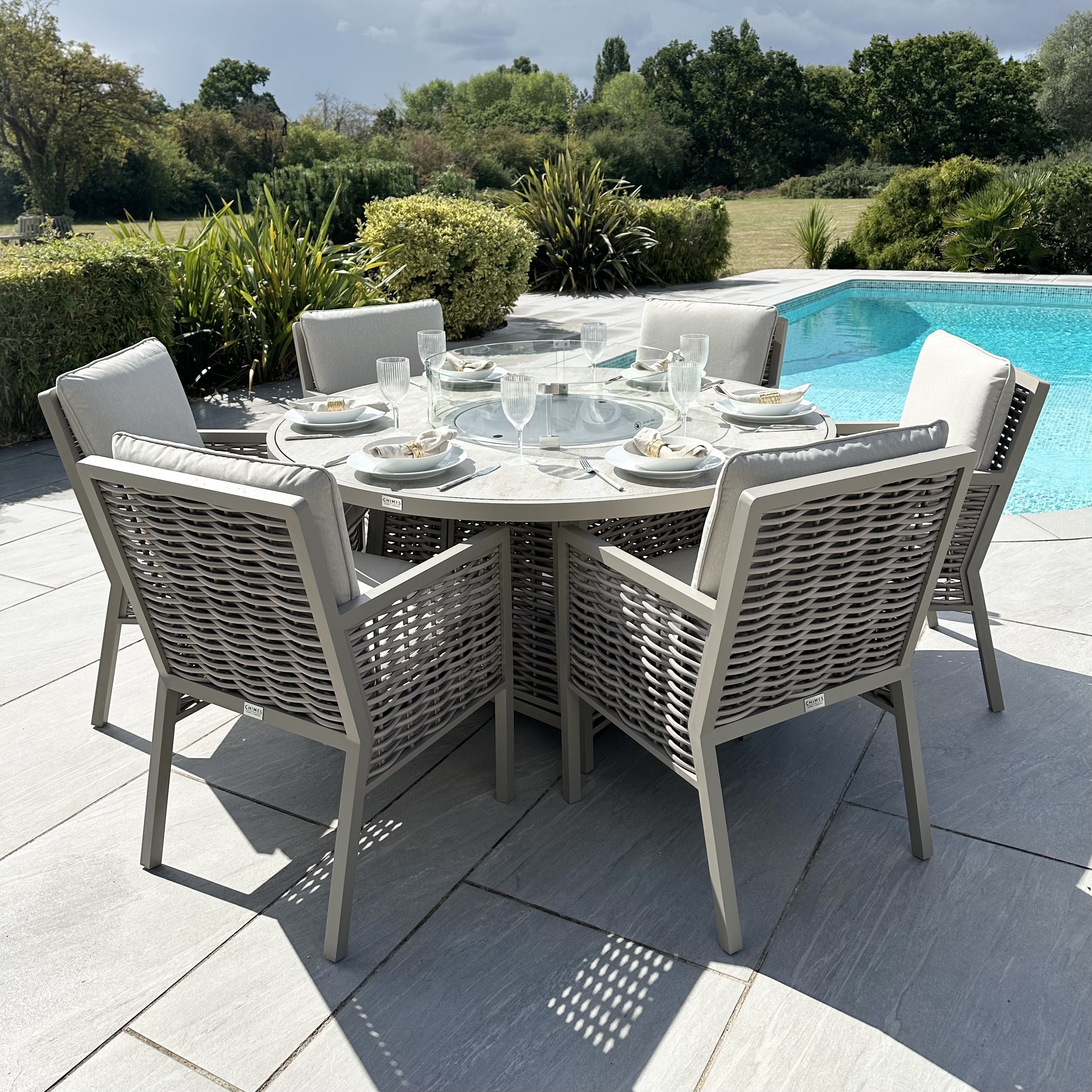The Chimes - Monaco Aluminium 6 Seat Round Dining Set - 1.5 Meter Round Table With Firepit - Rope Weave - Cream is our premium luxury aluminium range that is not only low maintenance but has extra thick cushions which brings the ultimate comfort experience to your garden.
