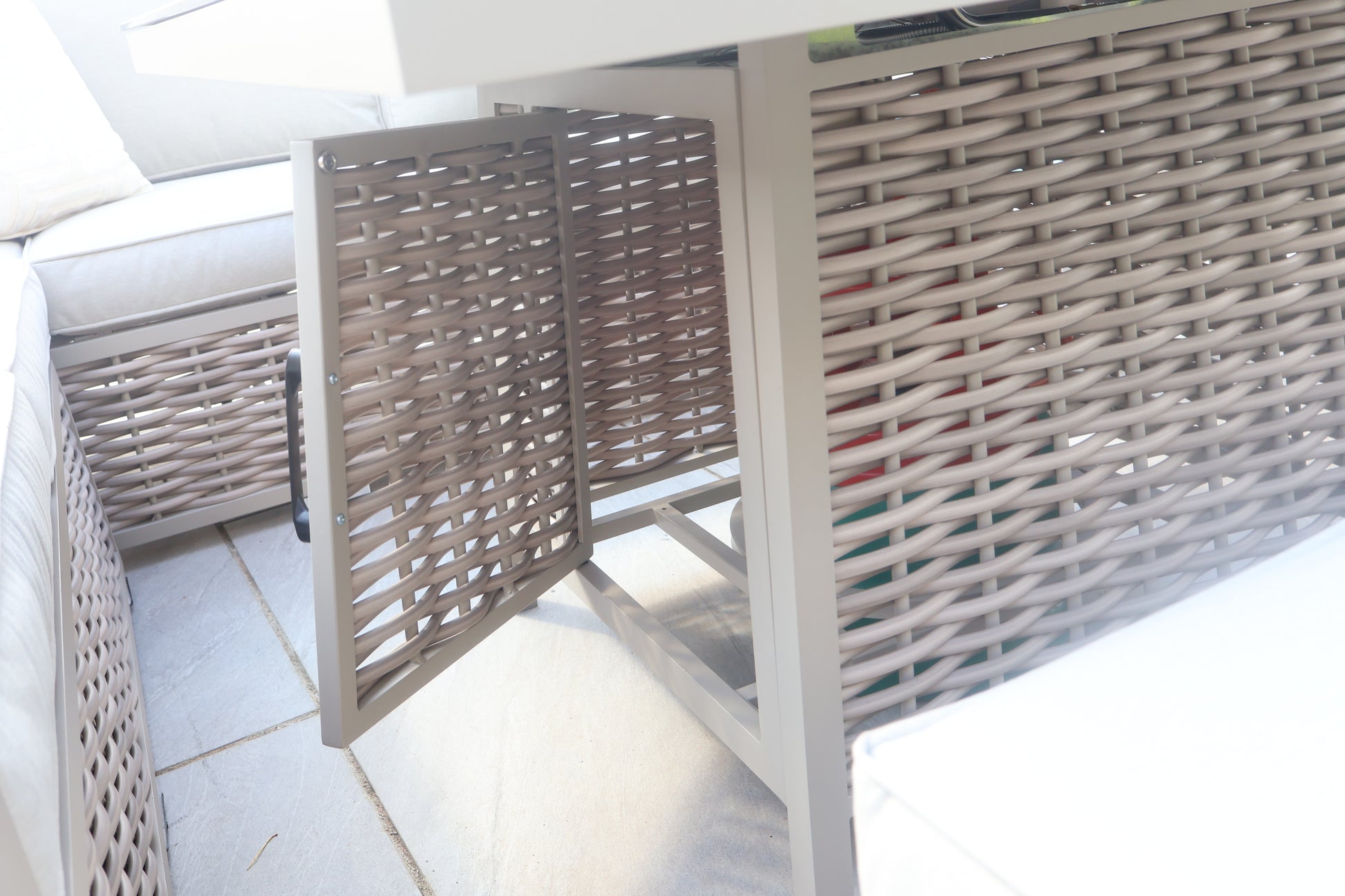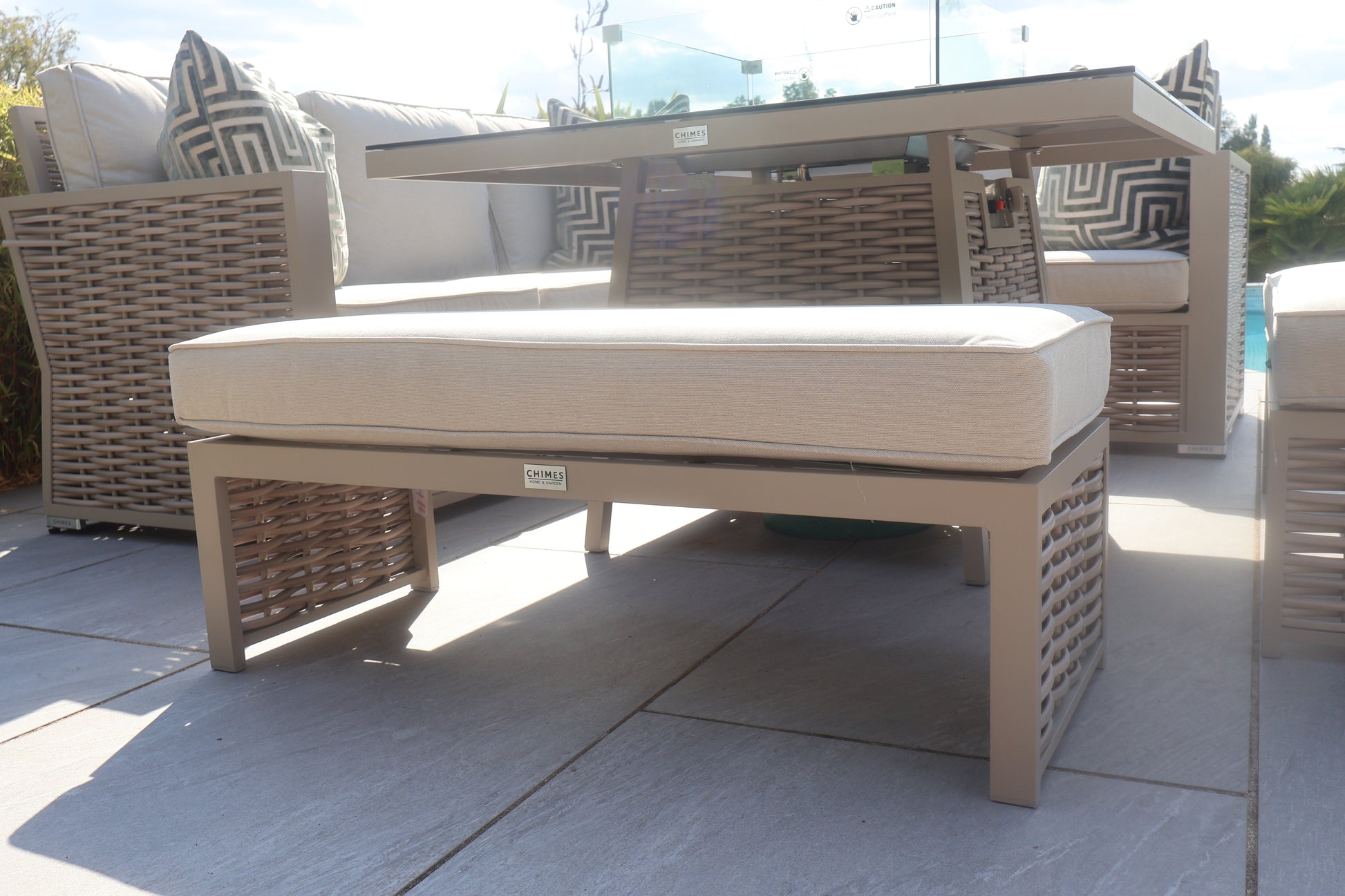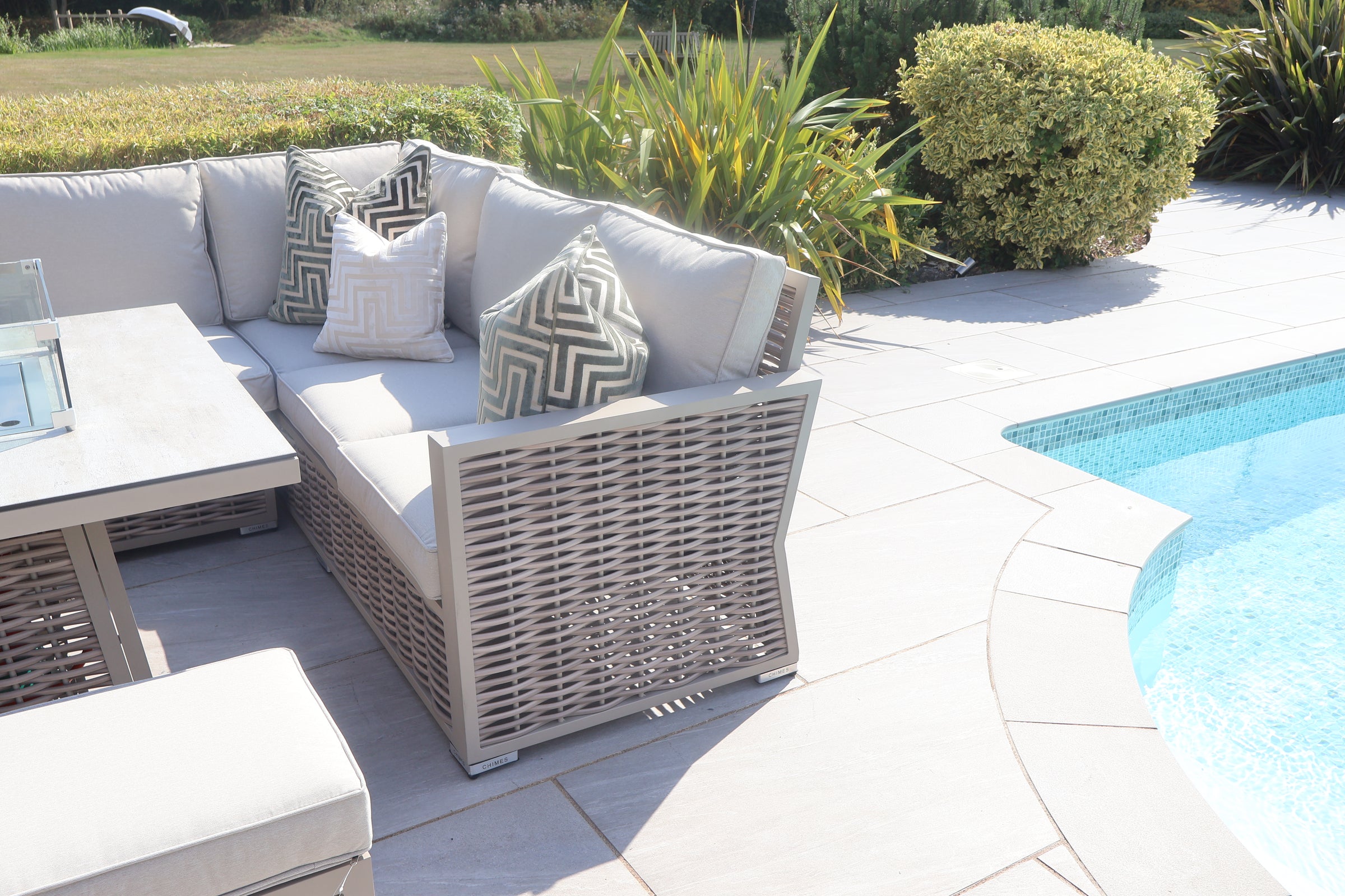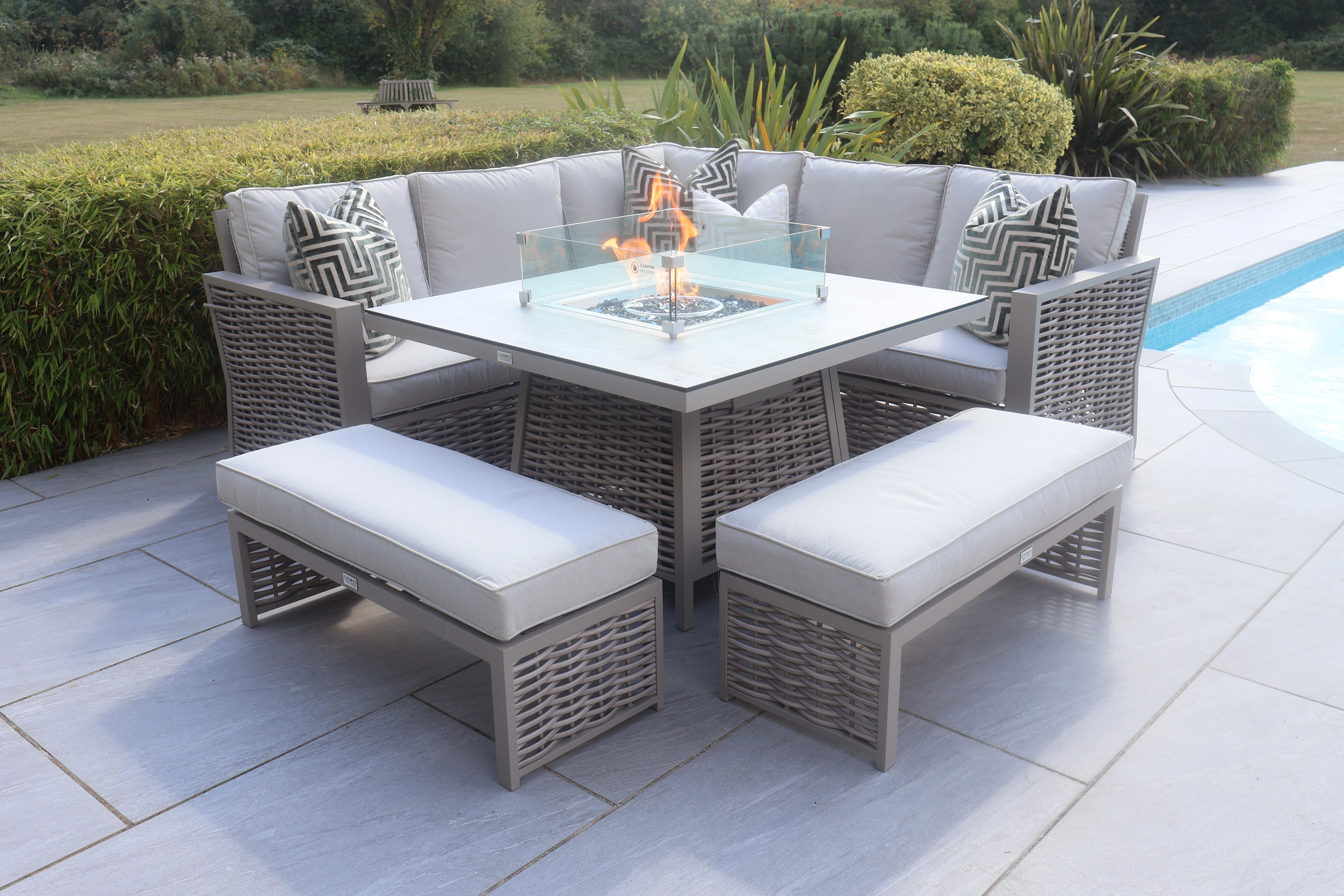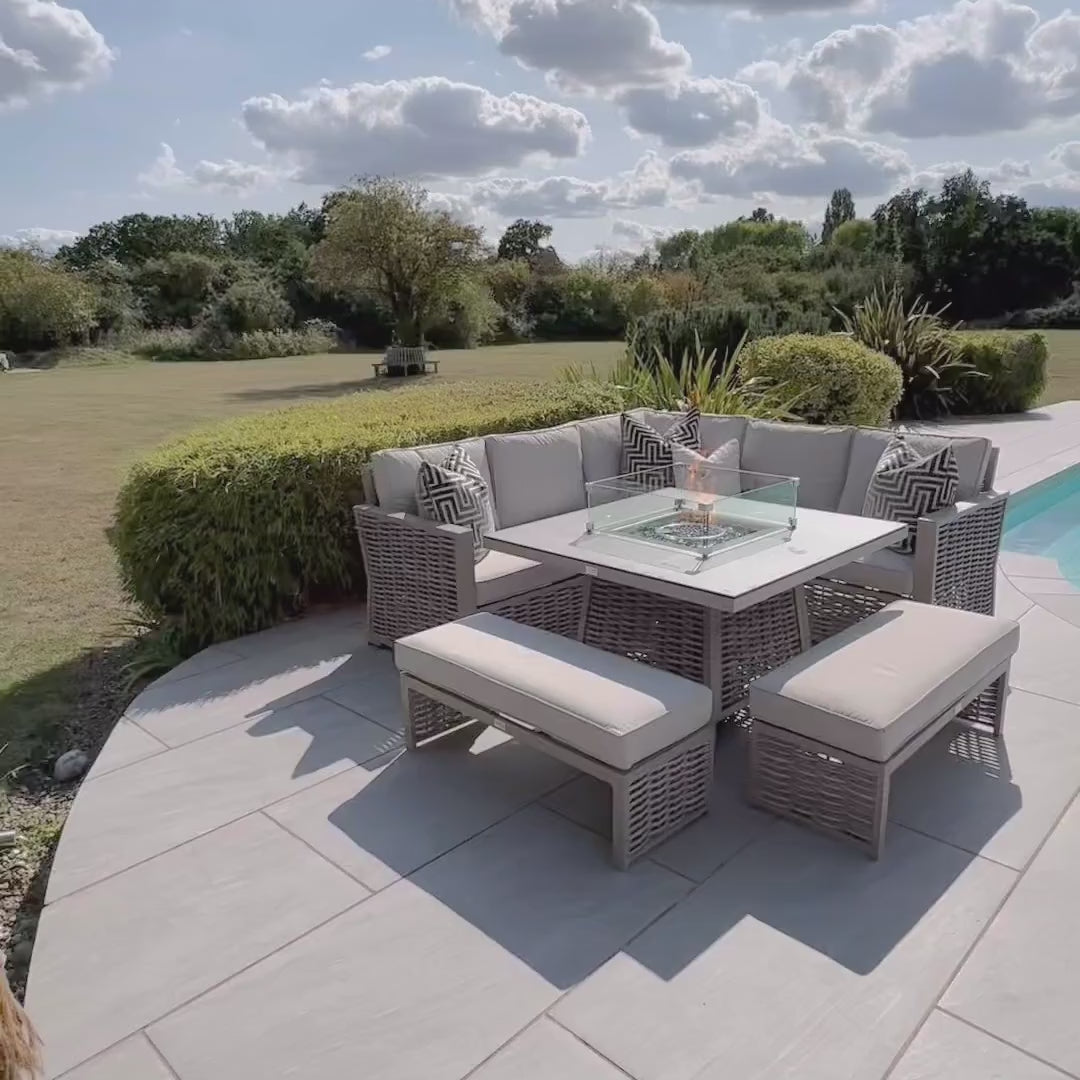 The Chimes - Monaco Aluminium Compact Corner Dining Set with Firepit Table - Rope Weave is our premium luxury aluminium range that is not only low maintenance but has extra thick cushions which brings the ultimate comfort experience to your garden.