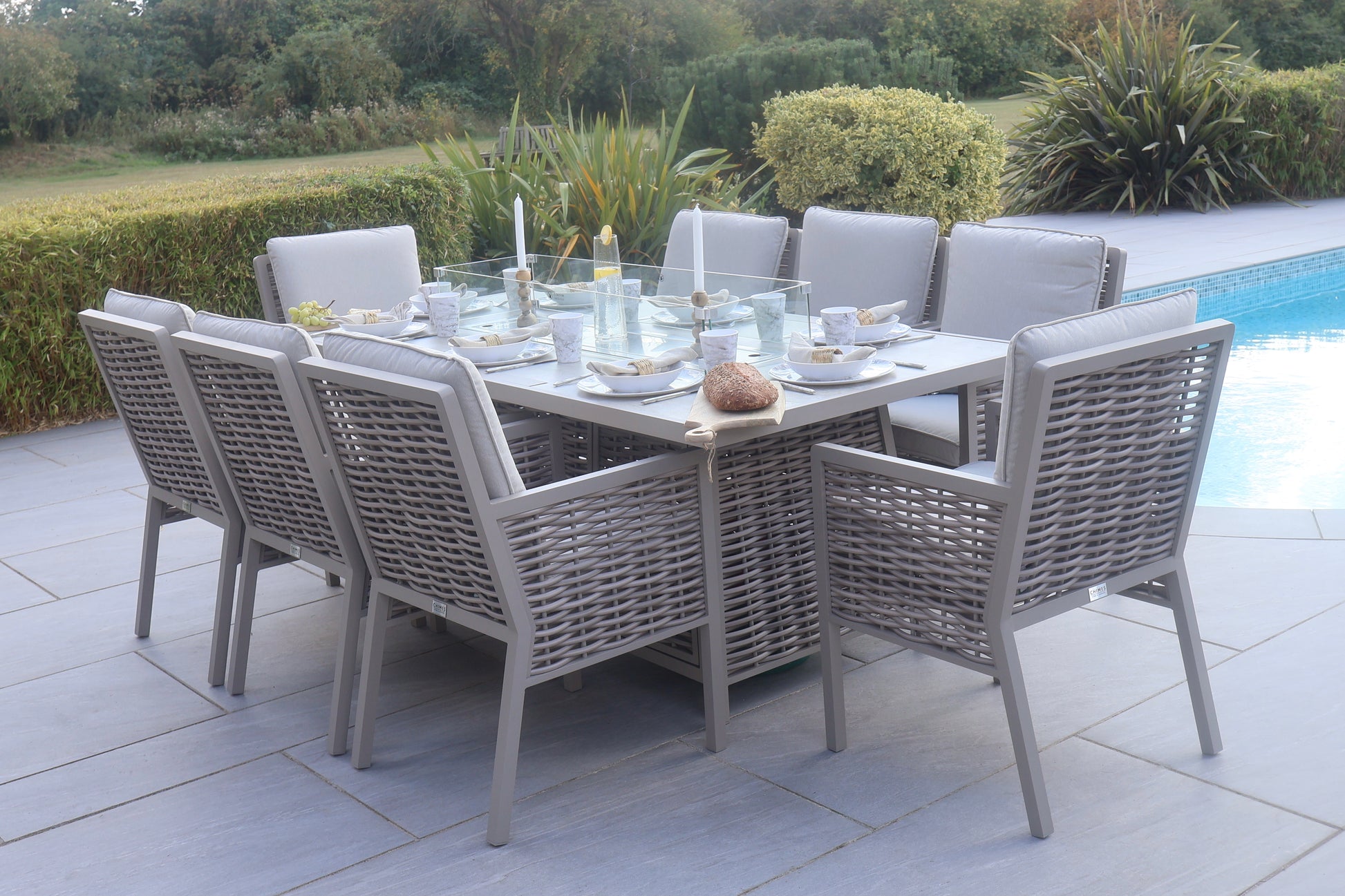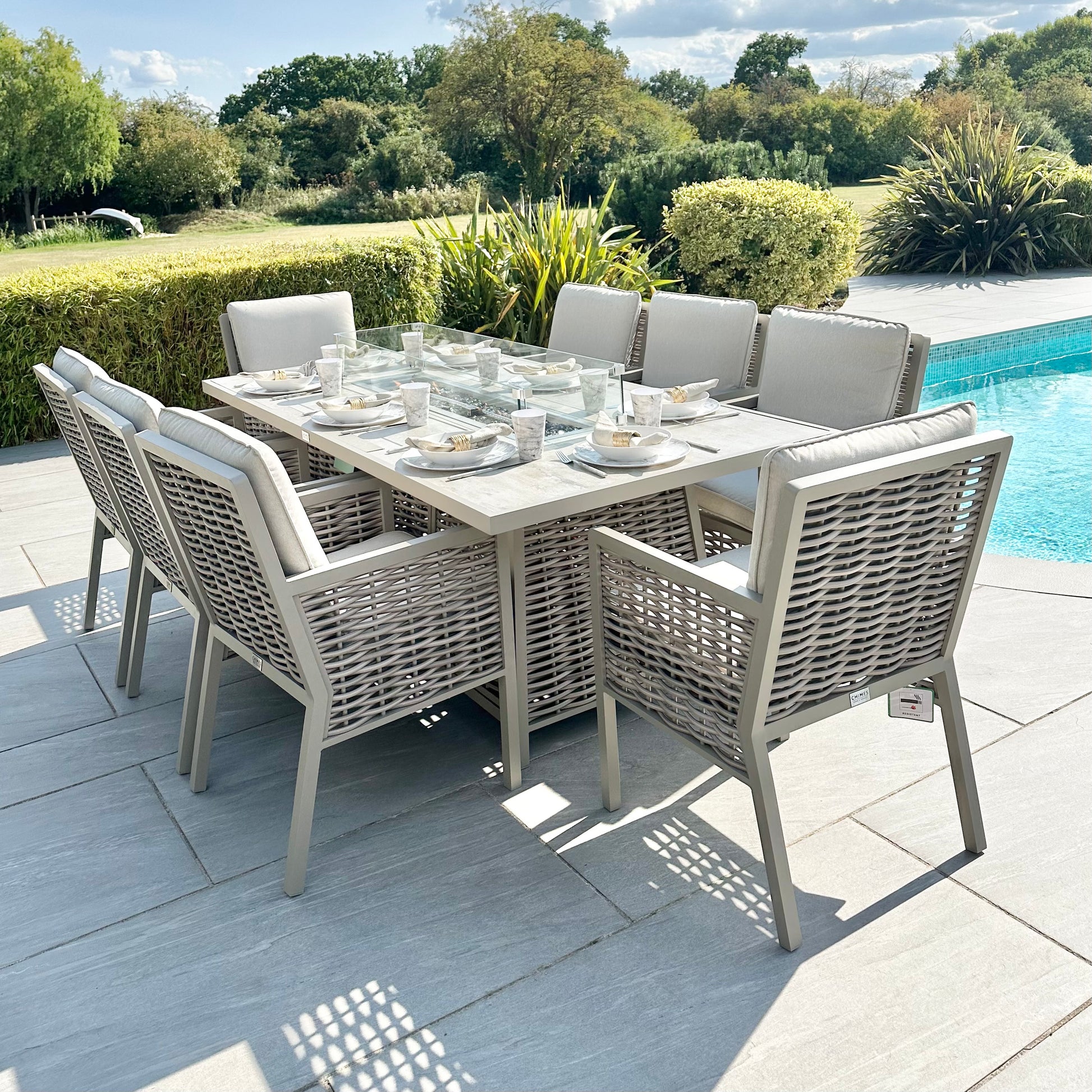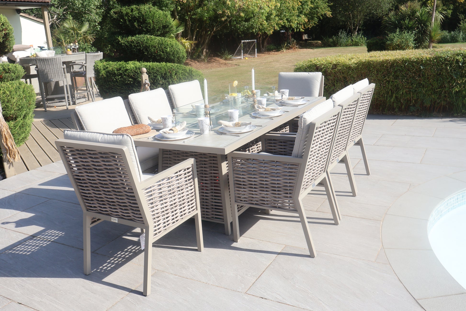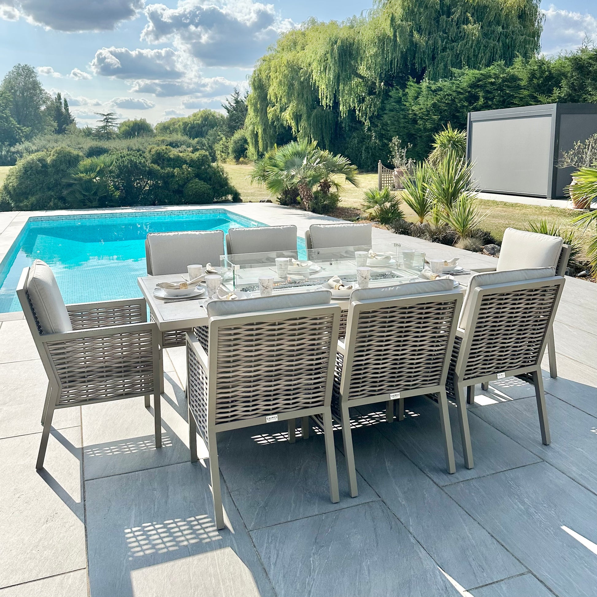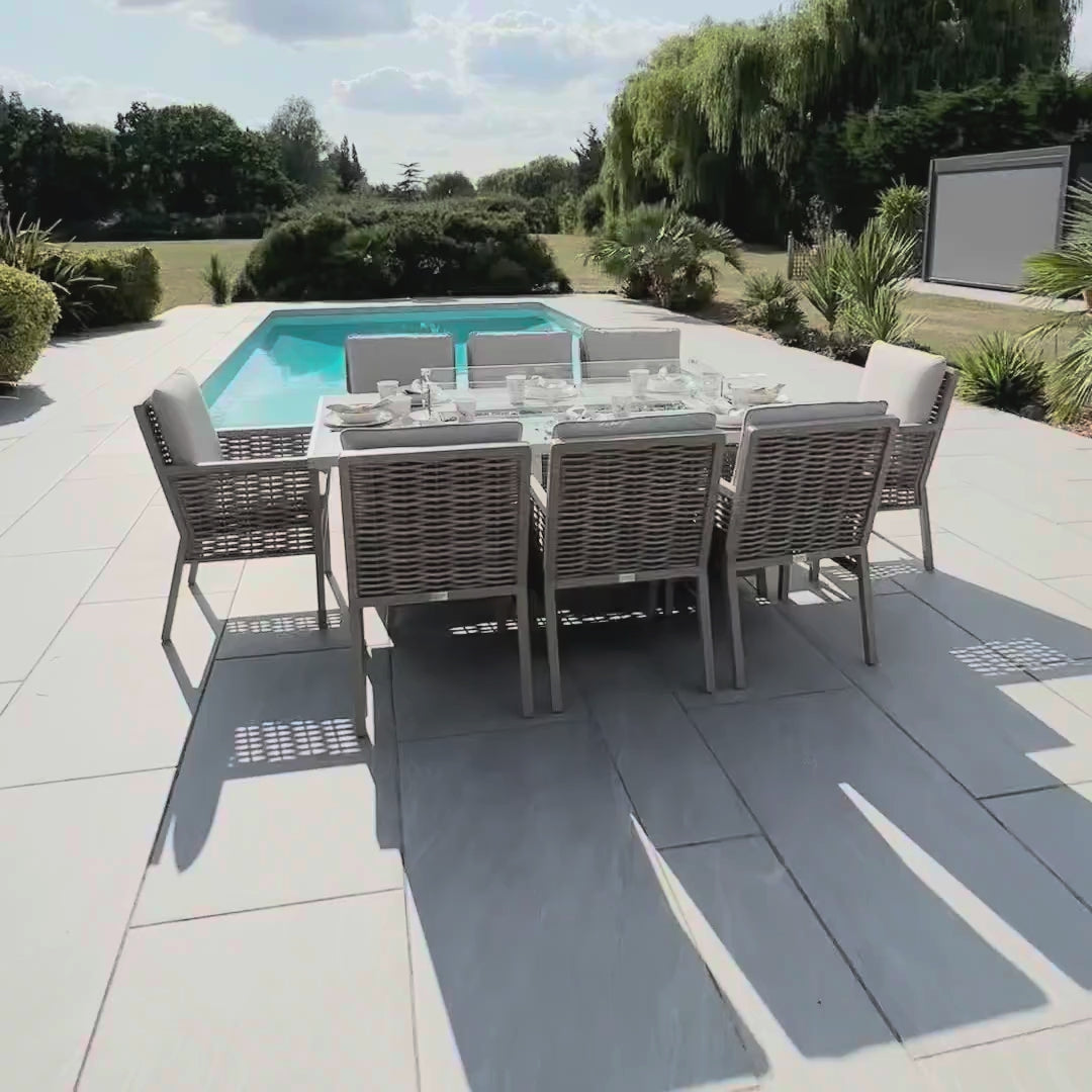 The Chimes - Monaco Aluminium 8 Seat Rectangular Dining Set - 1 Meter x 2 Meter Table With Firepit - Rope Weave - Cream is our premium luxury aluminium range that is not only low maintenance but has extra thick cushions which brings the ultimate comfort experience to your garden.