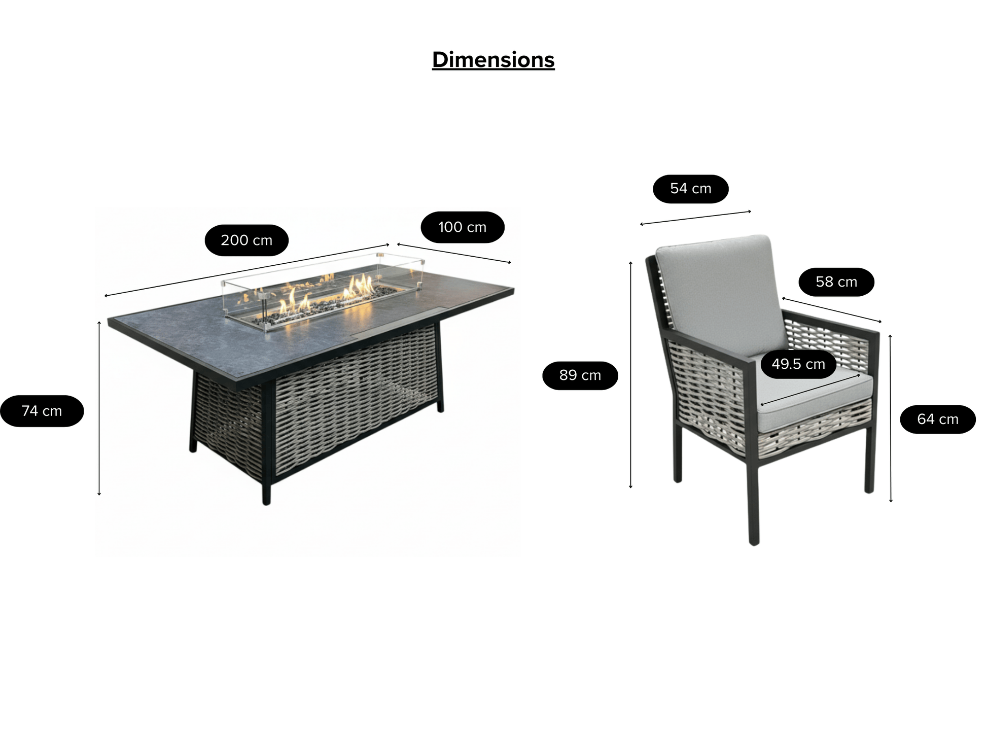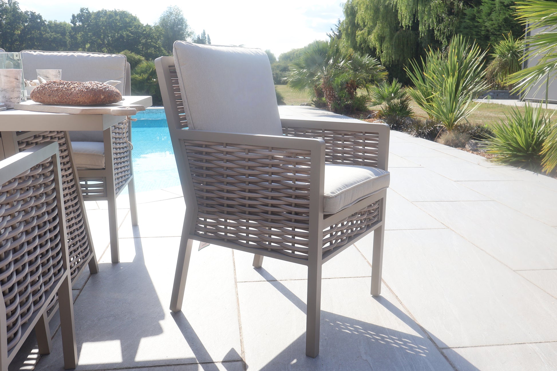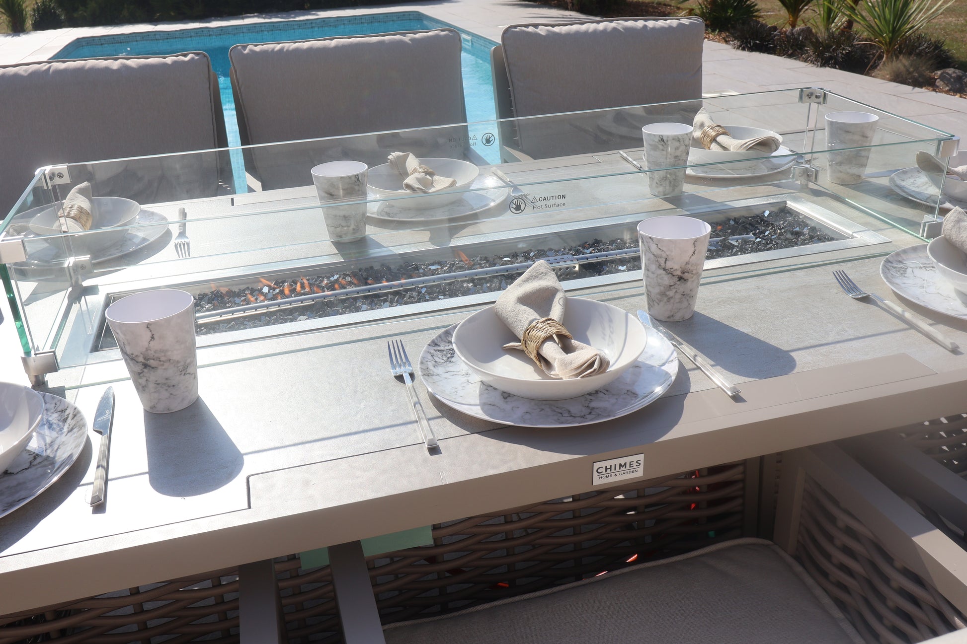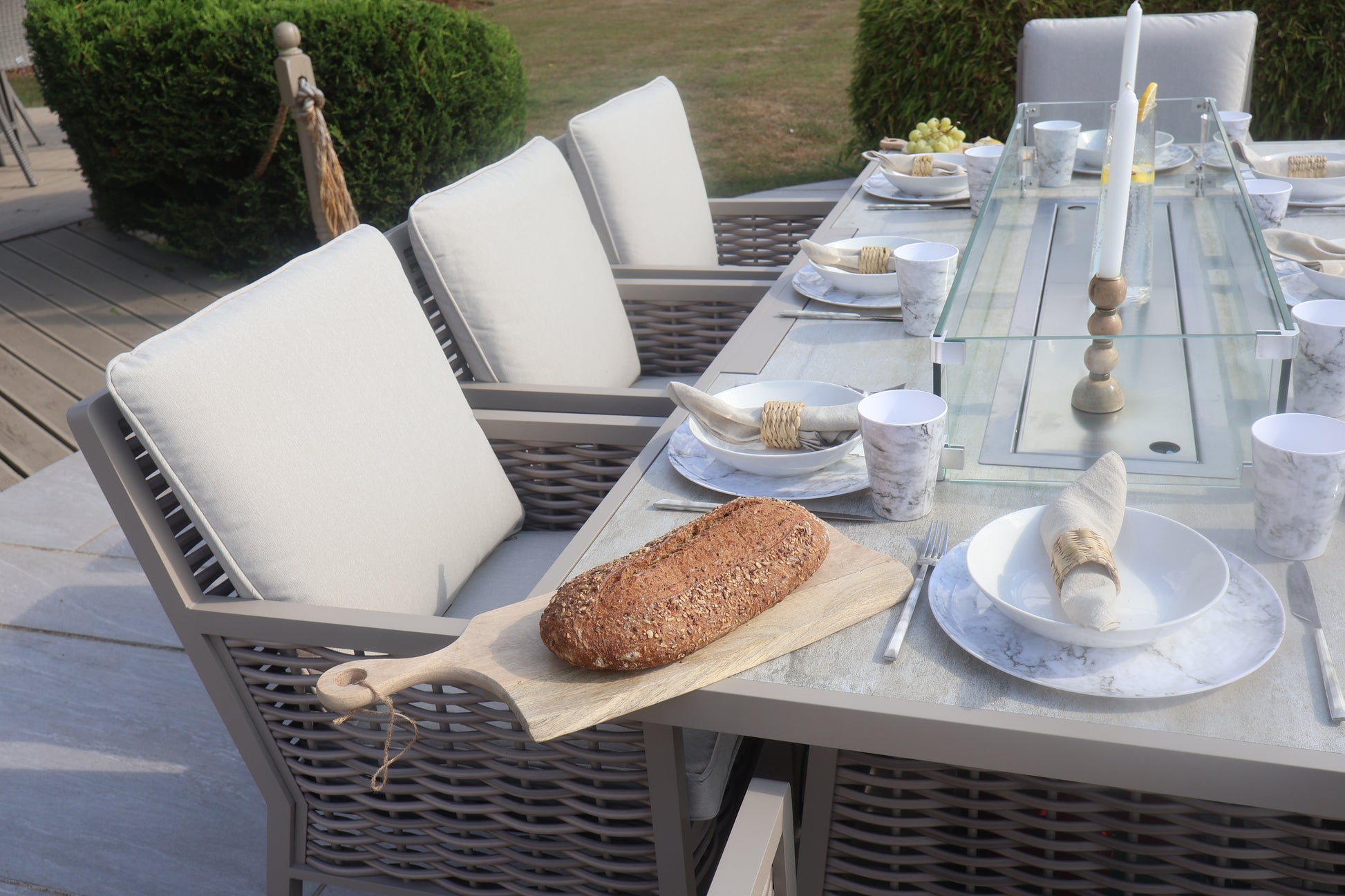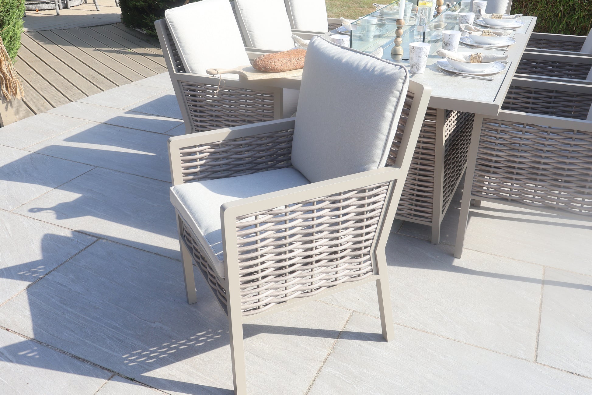The Chimes - Monaco Aluminium 8 Seat Rectangular Dining Set - 1 Meter x 2 Meter Table With Firepit - Rope Weave - Cream is our premium luxury aluminium range that is not only low maintenance but has extra thick cushions which brings the ultimate comfort experience to your garden.