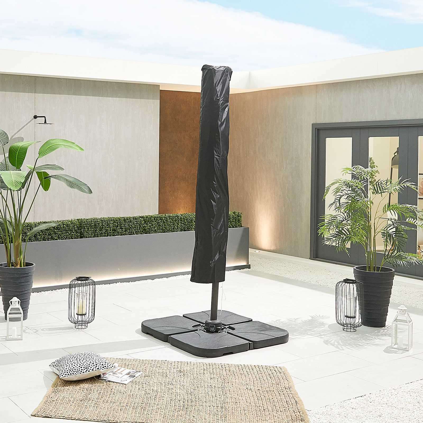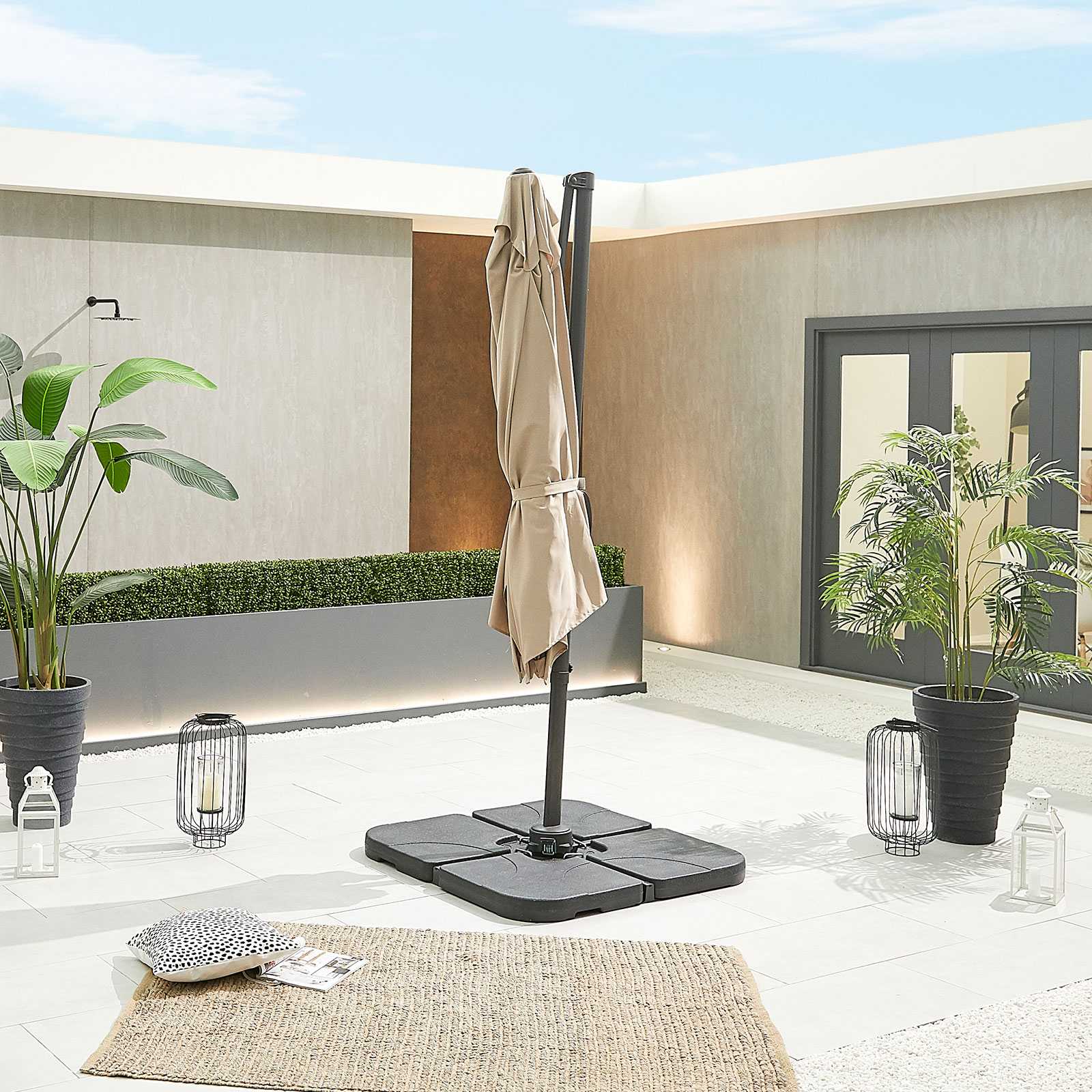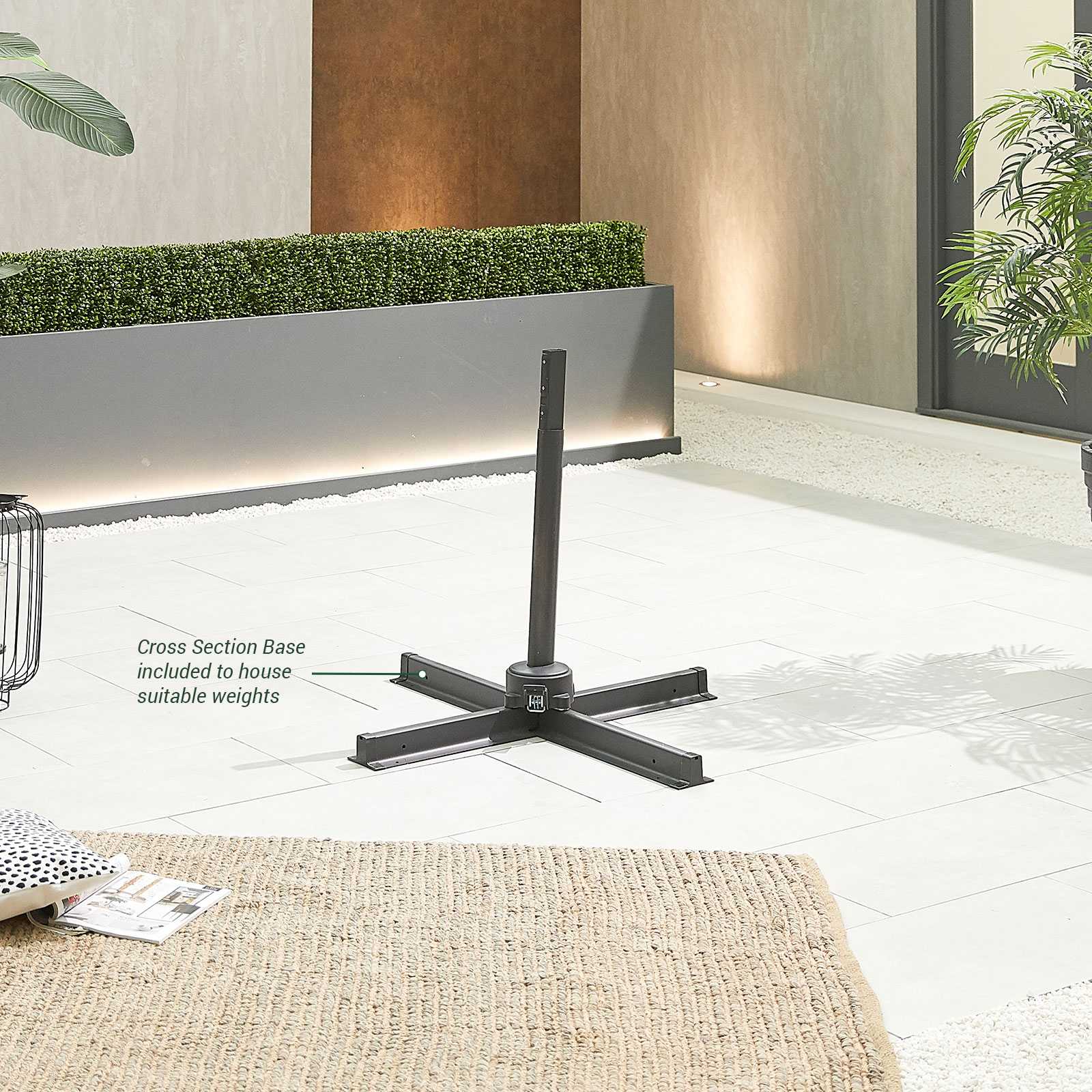 This cantilever parasol has a cross-section bottom which will house suitable base weights (not included).