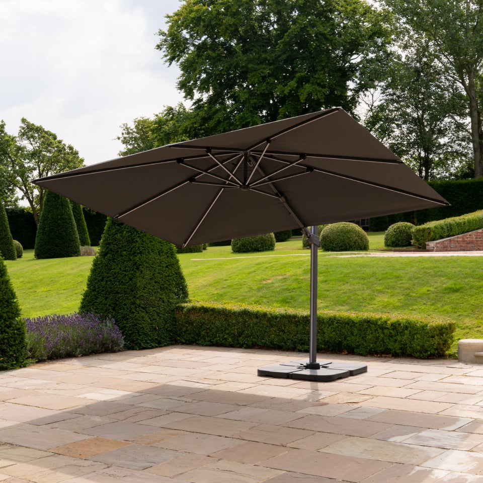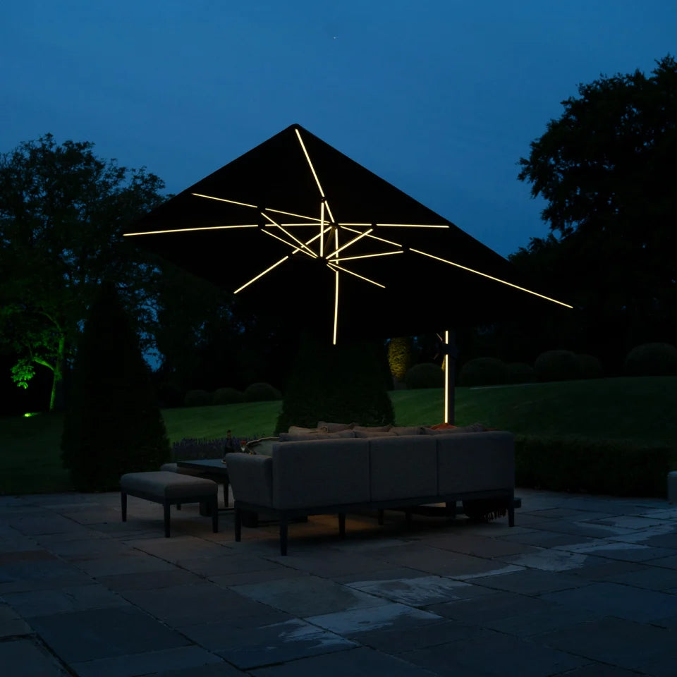 Introducing the Nova - Astra 3.6m x 2.7m Rectangular LED Cantilever Parasol - Grey - your ultimate shade companion for those sunny days and starlit nights! Say hello to relaxation and goodbye to harsh rays with this marvel of modern engineering.