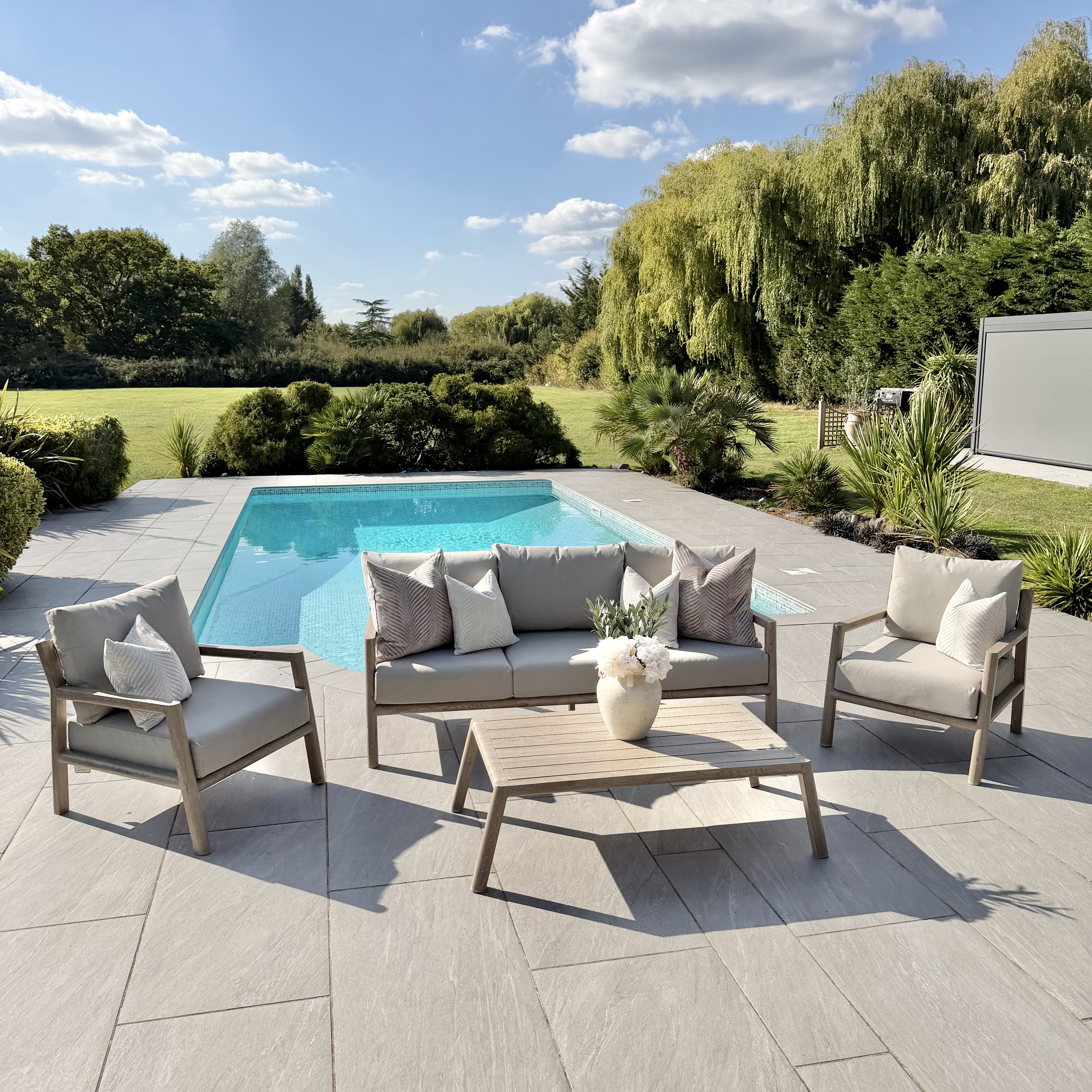 In stock & ready for deliveryBring timeless elegance to your garden with the Nova - Eleanor 3 Seater Sofa Set with Rectangular Coffee Table, designed for those who love the natural look of wood without the hassle. Crafted from heat-transfer aluminium, this collection offers a realistic wood-like finish with the benefits of a rust-free, low-maintenance design, ensuring it's fit for all seasons.