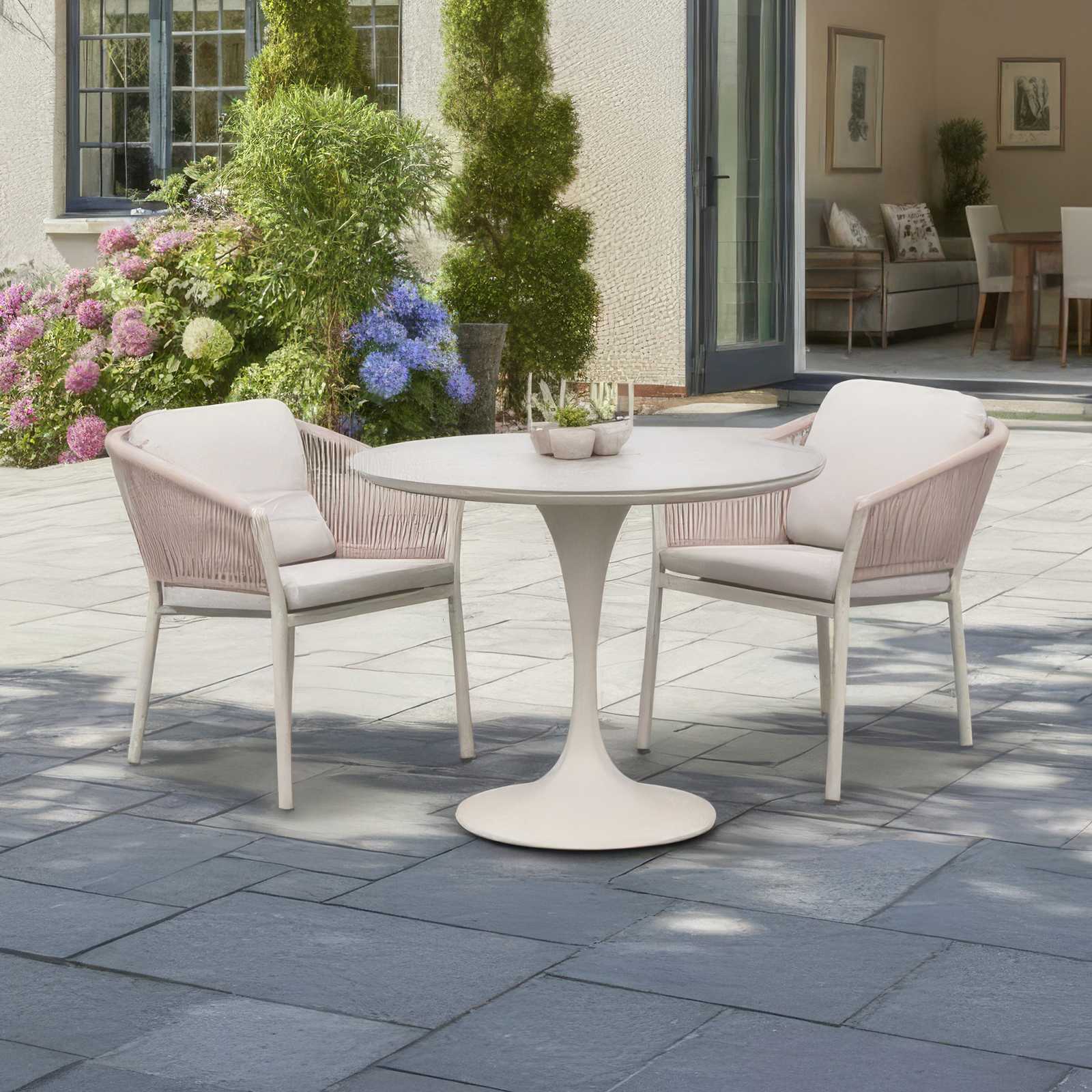 Crafted from durable aluminium, the set features a striking pink blush rope design on the back of the chairs, creating a soft and inviting aesthetic. Paired with the muted chalk grey frame, the blush tones form a stunning colour palette that enhances any garden.The sintered stone tabletops are the standout feature of the Hayden Collection. With a luxurious grey marble look, these tabletops bring a premium feel to the set while perfectly complementing its contemporary design. Durable and elegant, they are ideal for both everyday use and special gatherings.