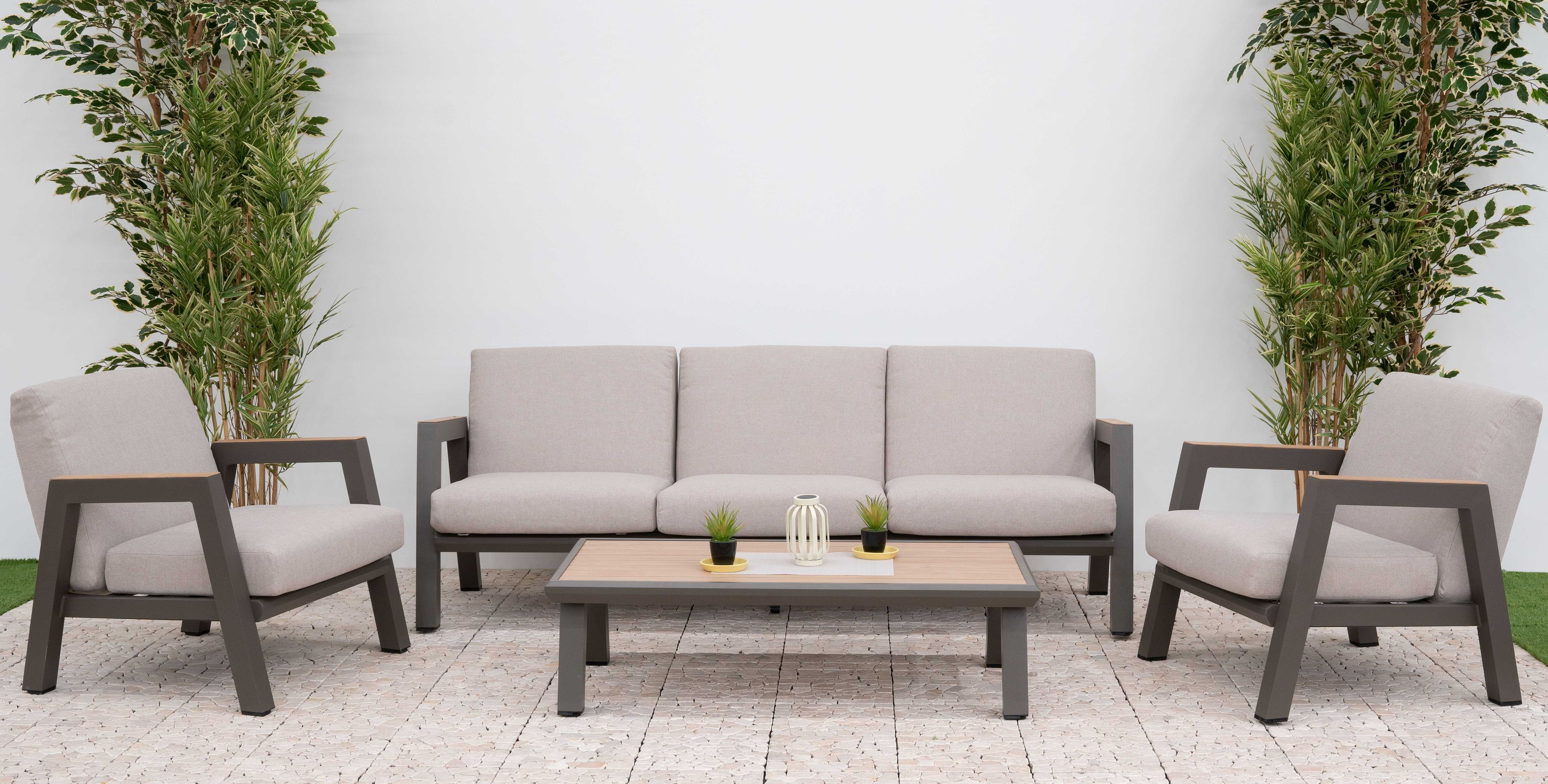 The set features a stunning bronze-coloured powder-coated aluminium frame, accented with a delicate golden fleck in the paintwork, creating a truly eye-catching aesthetic that elevates your outdoor setting.The standout feature of the Hunter Collection is its innovative back cushions, which seamlessly slot over the framework. This unique design element not only enhances the set's sleek appearance but also ensures a comfortable and stylish seating experience. The cushion fabric is carefully selected to perfectly complement the warm tones of the frame.