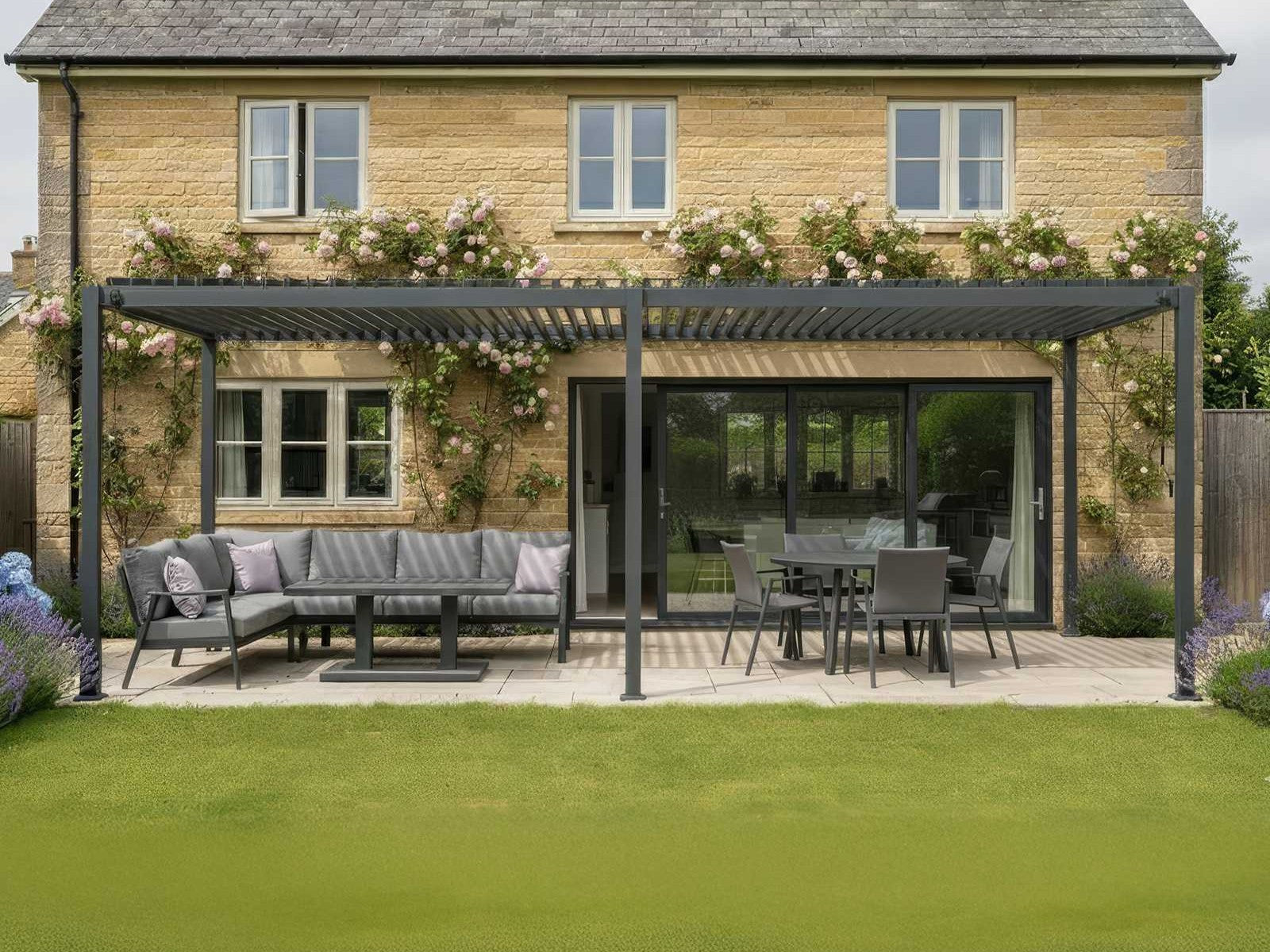 Elevate your outdoor living with the sleek Nova - Phoenix L-Shaped Corner Sofa Dining Set with Rectangular Rising Table - Grey.