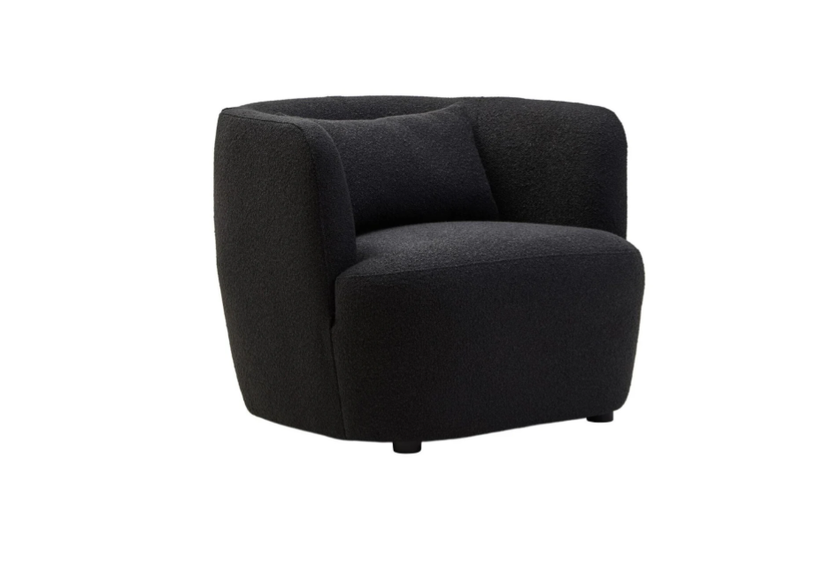 The Paris Curved Back Chair features black finish upholstery with a textured surface and a matching cushion, offering a chic and comfortable seating experience to modern living spaces. This chair is an elegant seating option for modern and contemporary living rooms with its textured black finish upholstery and sleek curved silhouette. The generous, plump cushioning creates a comfortable and inviting aesthetic, while a matching cushion adds an extra layer of soft, relaxed support.