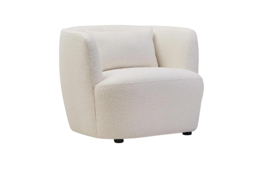The Paris Curved Back Chair features cream finish upholstery with a textured surface and a matching cushion, offering a chic and comfortable seating experience to modern living spaces. This chair is an elegant seating option for modern and contemporary living rooms with its textured cream finish upholstery and sleek curved silhouette. The generous, plump cushioning creates a comfortable and inviting aesthetic, while a matching cushion adds an extra layer of soft, relaxed support.
