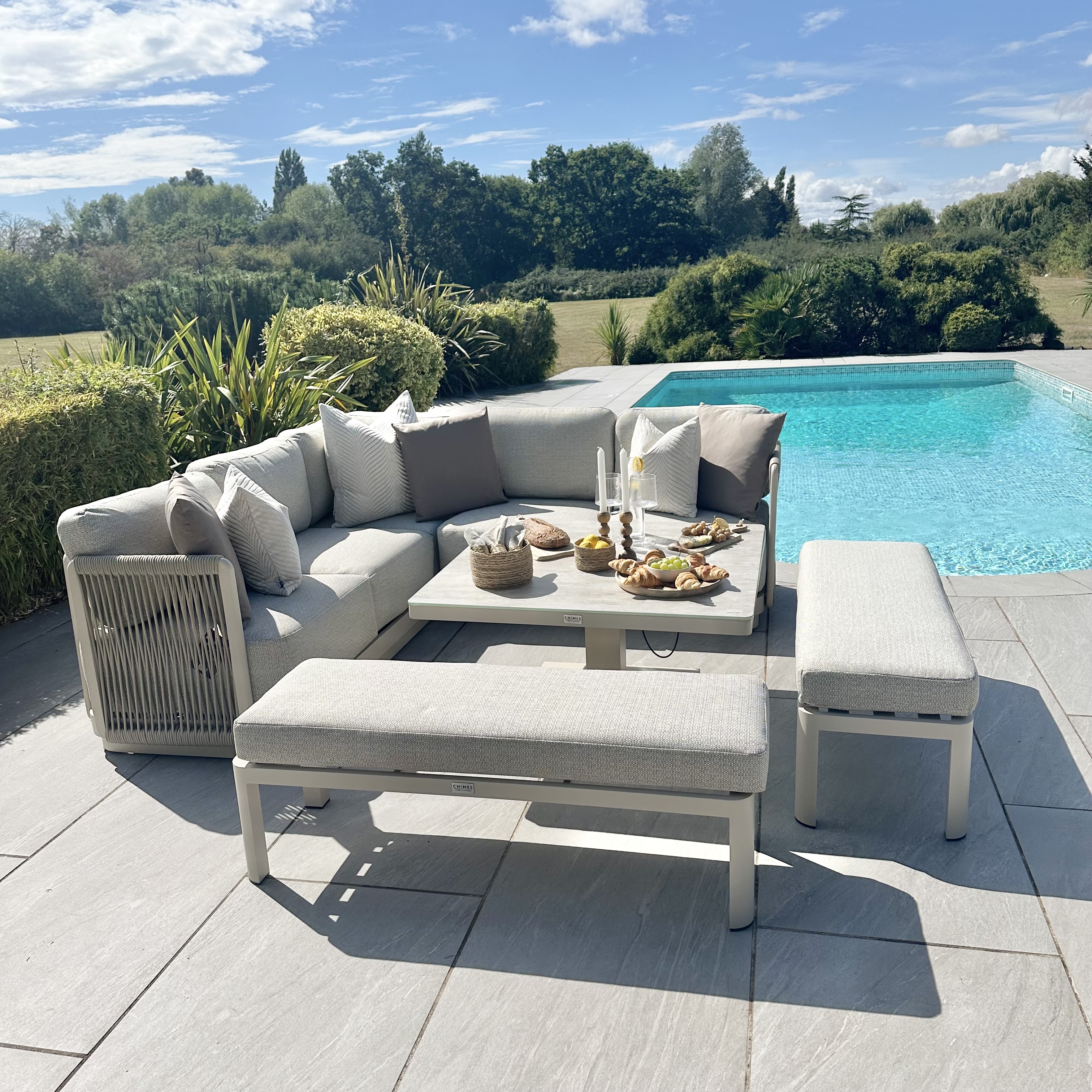 The Portofino Aluminium & Rope Compact Corner Dining Set With Rising Table - Cream offers a stylish and comfortable outdoor dining experience. The aluminium frame provides durability while the solution dyed rope detail adds a touch of elegance. The corner design maximizes seating space, and the included 2 x benches allow for versatile seating options. Plus, its weather-resistant construction ensures long-lasting use. The rising gas-lift table cleverly transforms from a casual coffee table to a dining table, with the simple push of a lever you eliminate the need for 2 separate tables & its neat & compact footprint wont overwhelm your patio space. Transform your outdoor space with this modern and functional dining set.