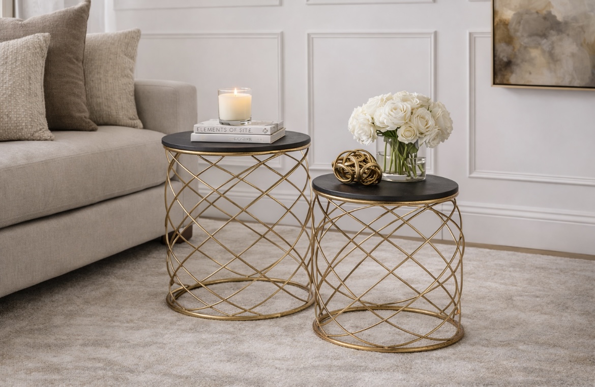 In stock & ready for deliveryOur Sabine gold twin side tables are a modern twist on classic French design, they feature a cylindrical silhouette and an intricate weave of gold finished metal topped with an accenting black table top. Perfectly complimenting your homes interior , they are a luxurious companion to any colour scheme and bedroom/living style.