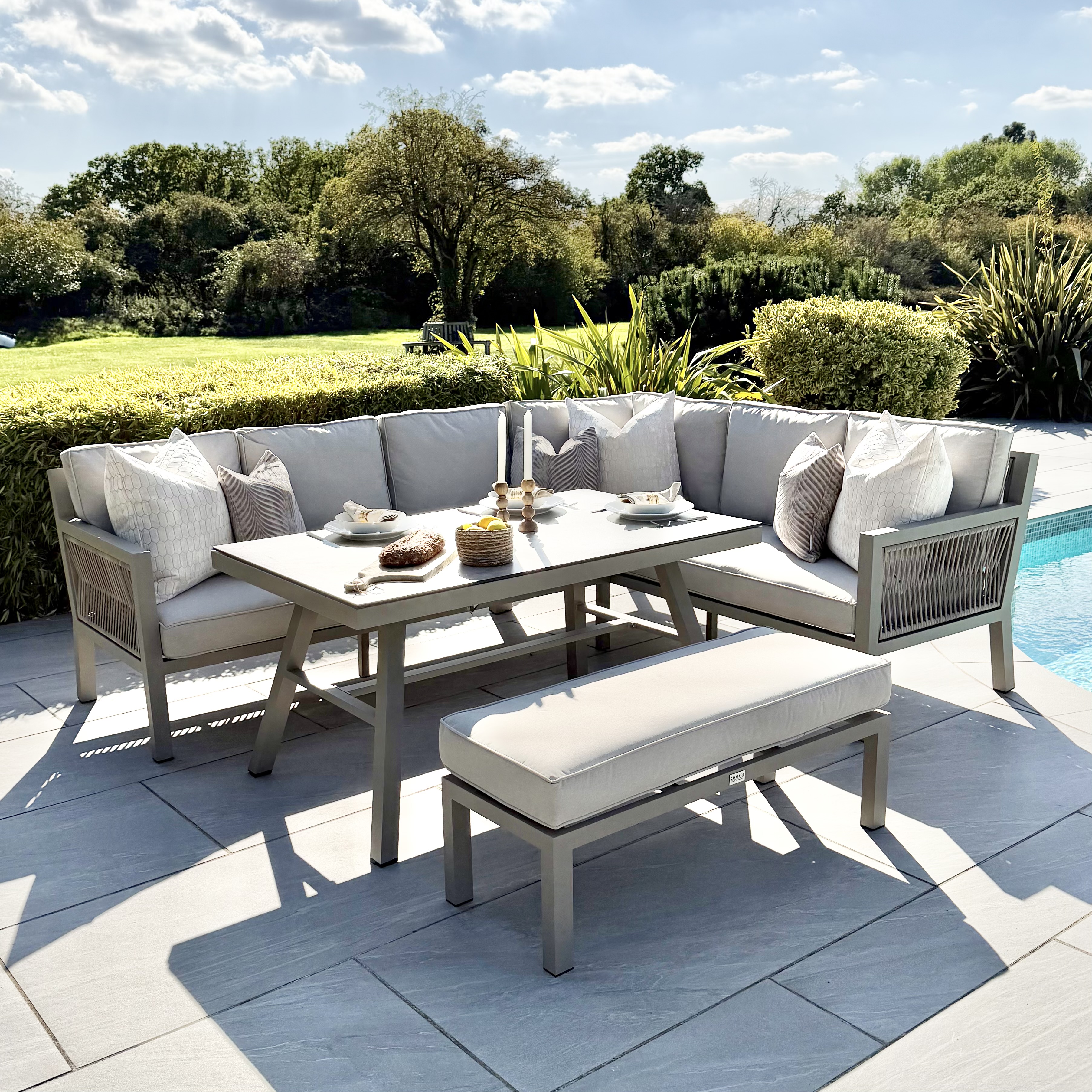 The Chimes - Seville Aluminium Casual Corner Dining Set - Right Hand - Champagne is our new corner dining set with rope finish which comes with a 5 year warranty.